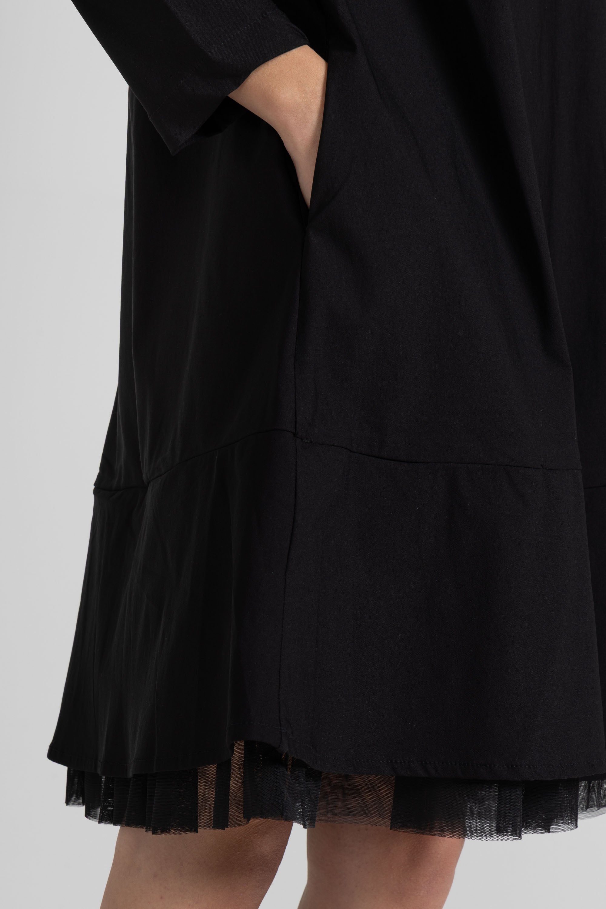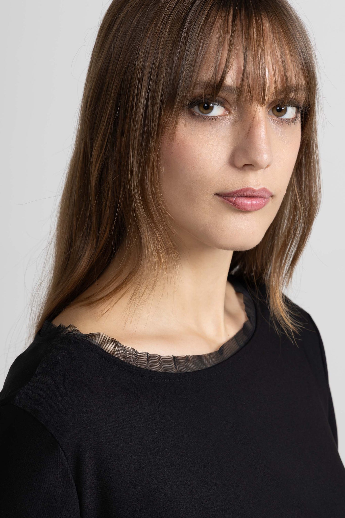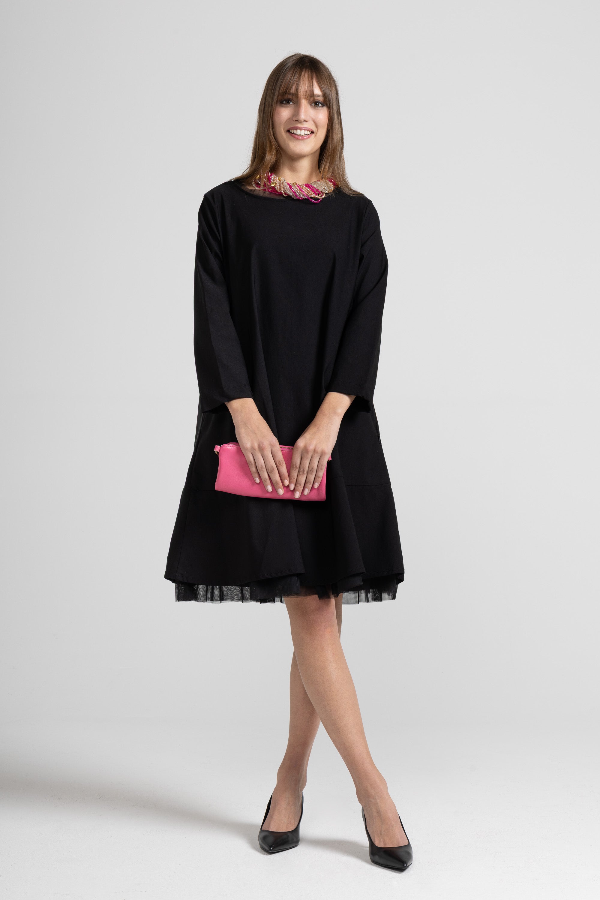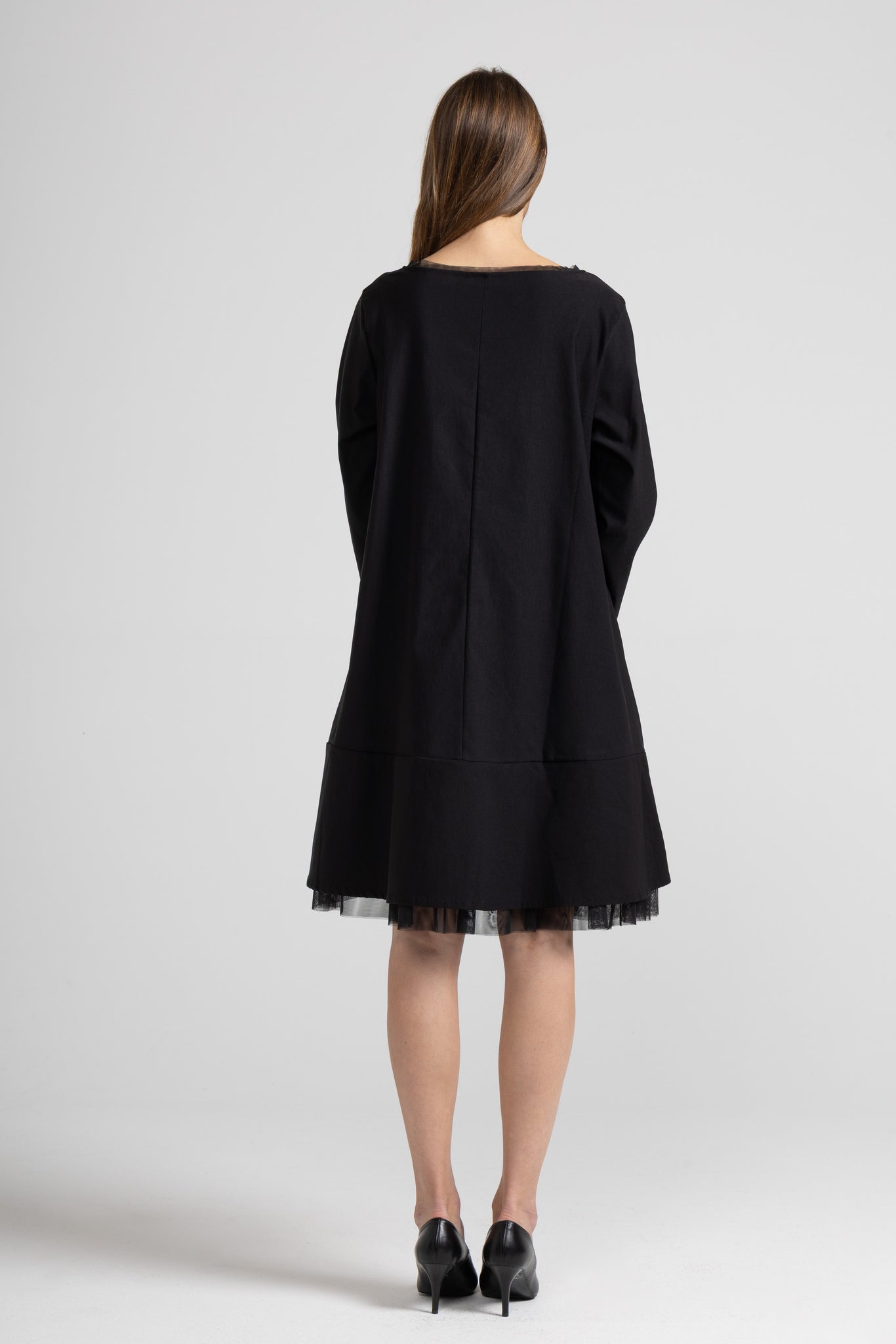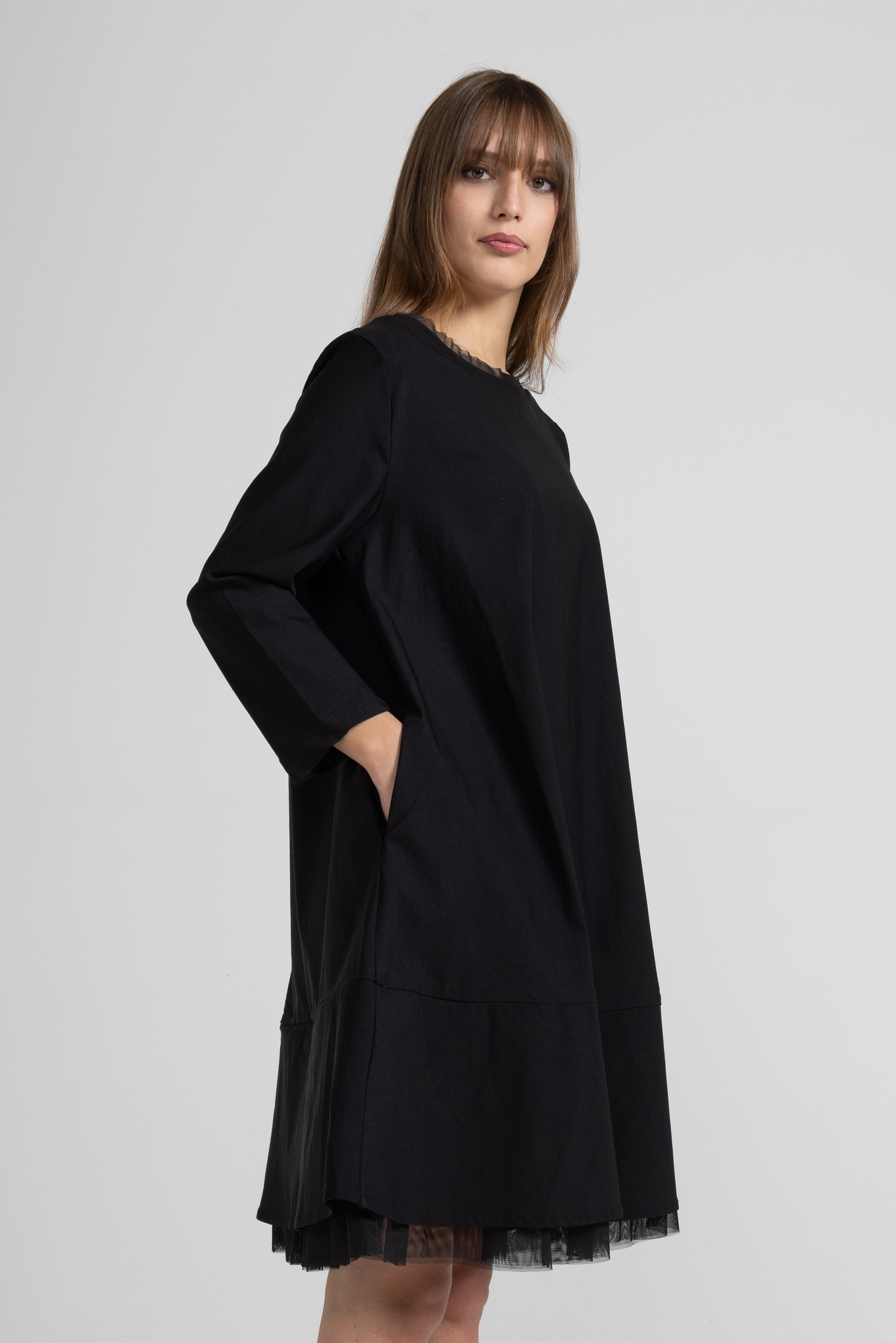 Abito midi in tessuto bengalina di viscosa elasticizzata, girocollo rifinito con inserto in tulle, maniche lunghe , tasche a filo, linea svasata con orlo leggermente asimmetrico, cuciture decorative nella parte bassa, dettaglio tulle sul fondo che aggiunge un tocco di leggerezza e raffinatezza al vestito, conferendogli un look femminile e moderno.