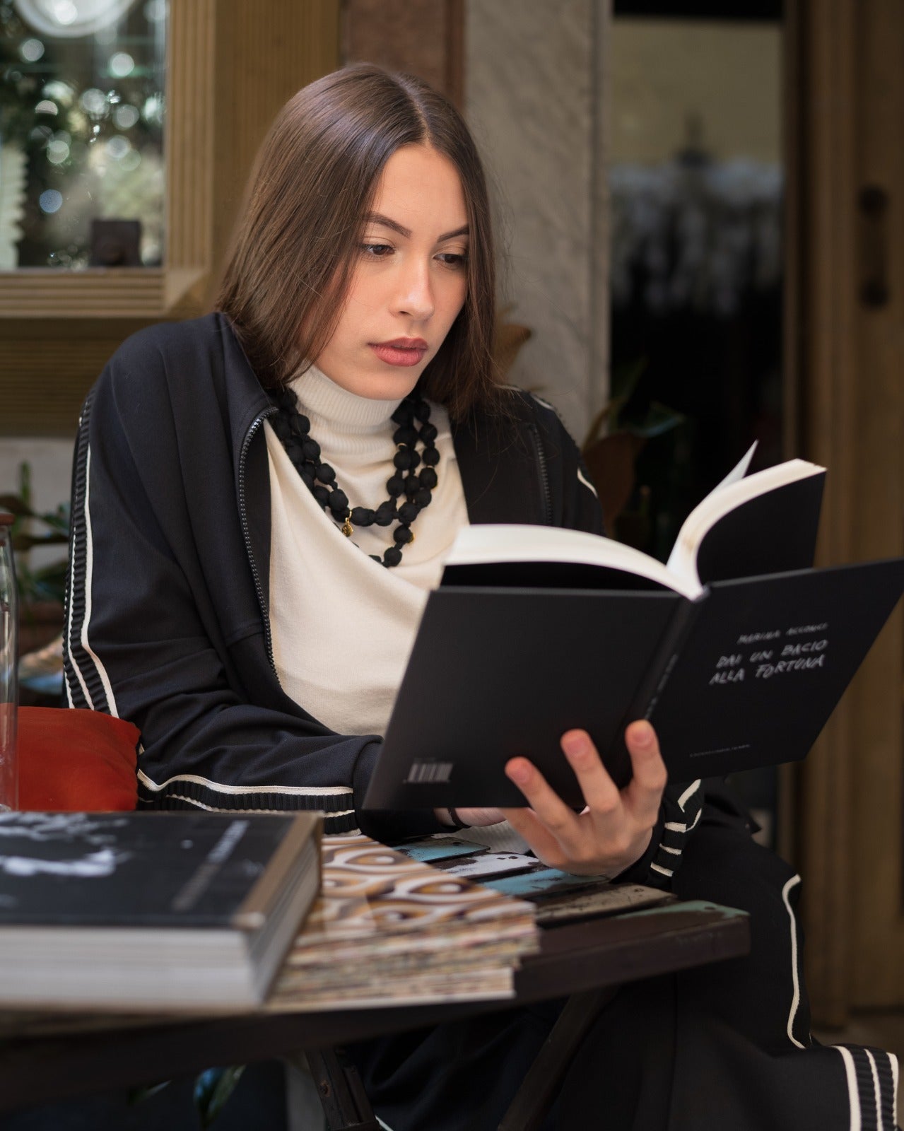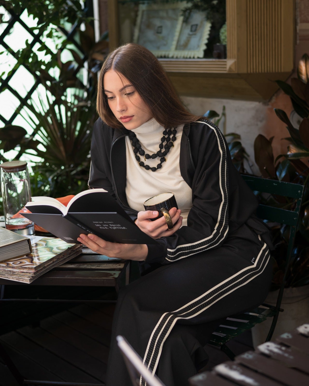 BOMBER IN PUNTO MILANO DI VISCOSA, DETTAGLIO TAGLIO CENTRALE RIBATTUTO, MANICA LUNGA, POLSO E FONDO RIBATTUTI ALTI, DETTAGLIO PASSAMANERIA SU LUNGHEZZA MANICA.