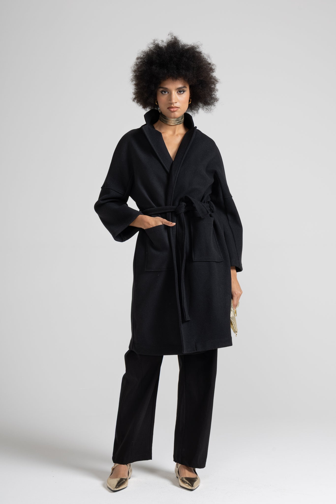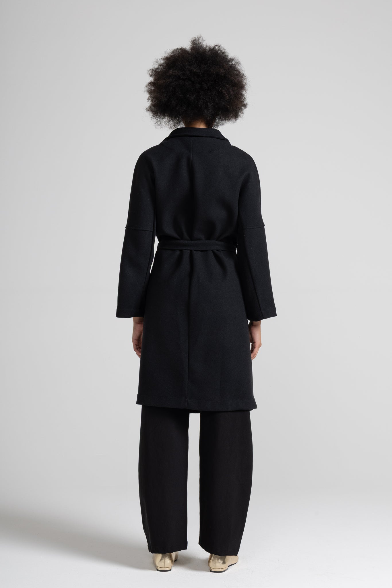 Collo a reverse, manche lunghe con taglio leggermente sceso, chiusura tramite cintura in vita, ampie asole sui fianchi, due tasche applicate frontali, ampie e pratiche, cucitura centrale verticale sul retro. Linea confortevole.