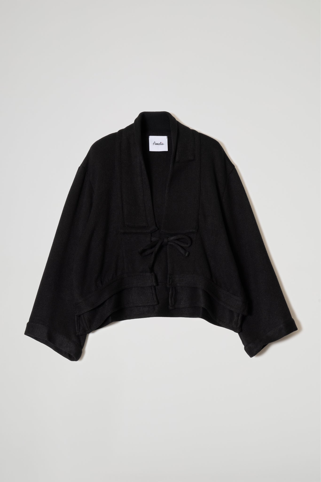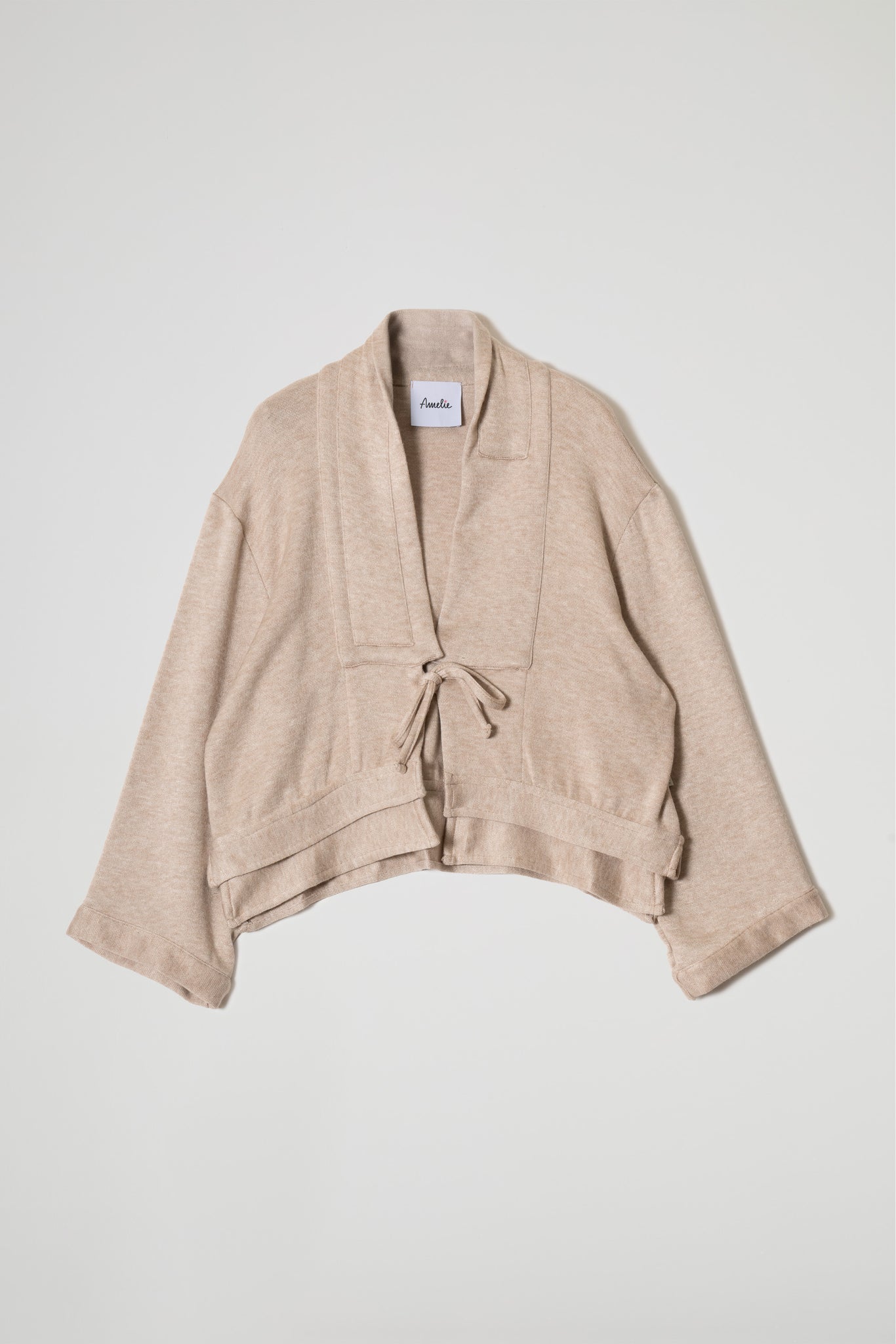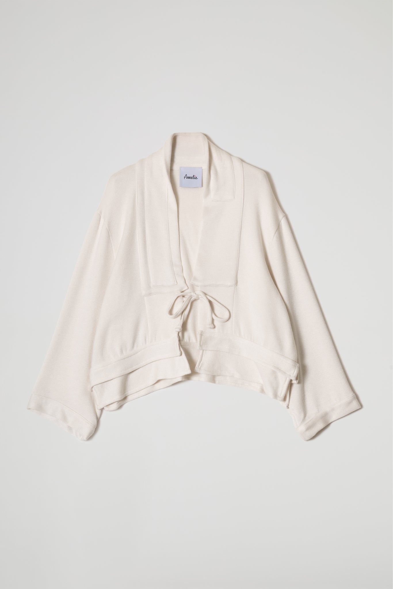 Cardigan corto asimmetrico, scollo a V profondo dettaglio impunture , maniche lunghe scampanate con polsino dall' orlo ribattuto alto, pannelli frontali sovrapposti con chiusura sul davanti con laccetto regolabile, spacchetti laterali sul fondo con orlo ribattuto alto. Linea morbida.