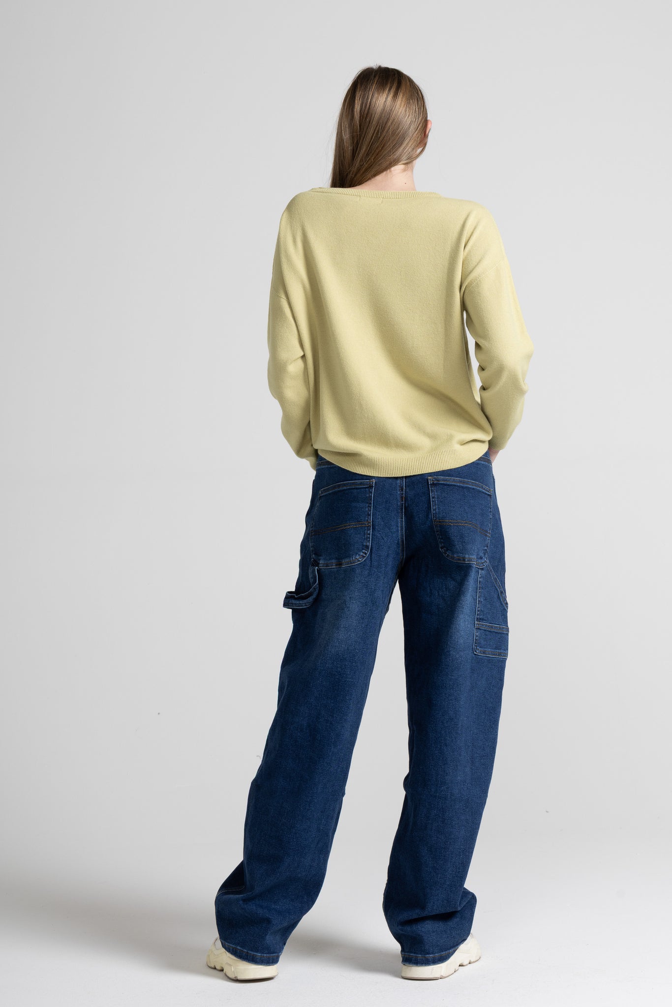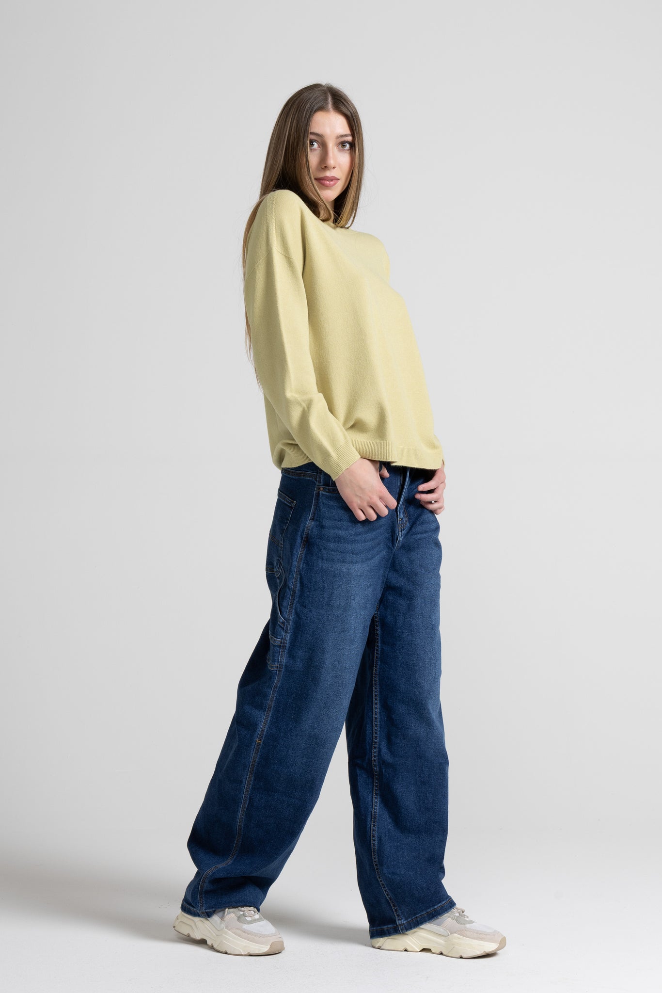 Maglia Over, scollo ampio e rotondo con bordo a costine, spalla scesa, manica lunga con polsino a costine, sul fondo orlo ribattuto alto con dettaglio a costine. Linea ampia e morbida.