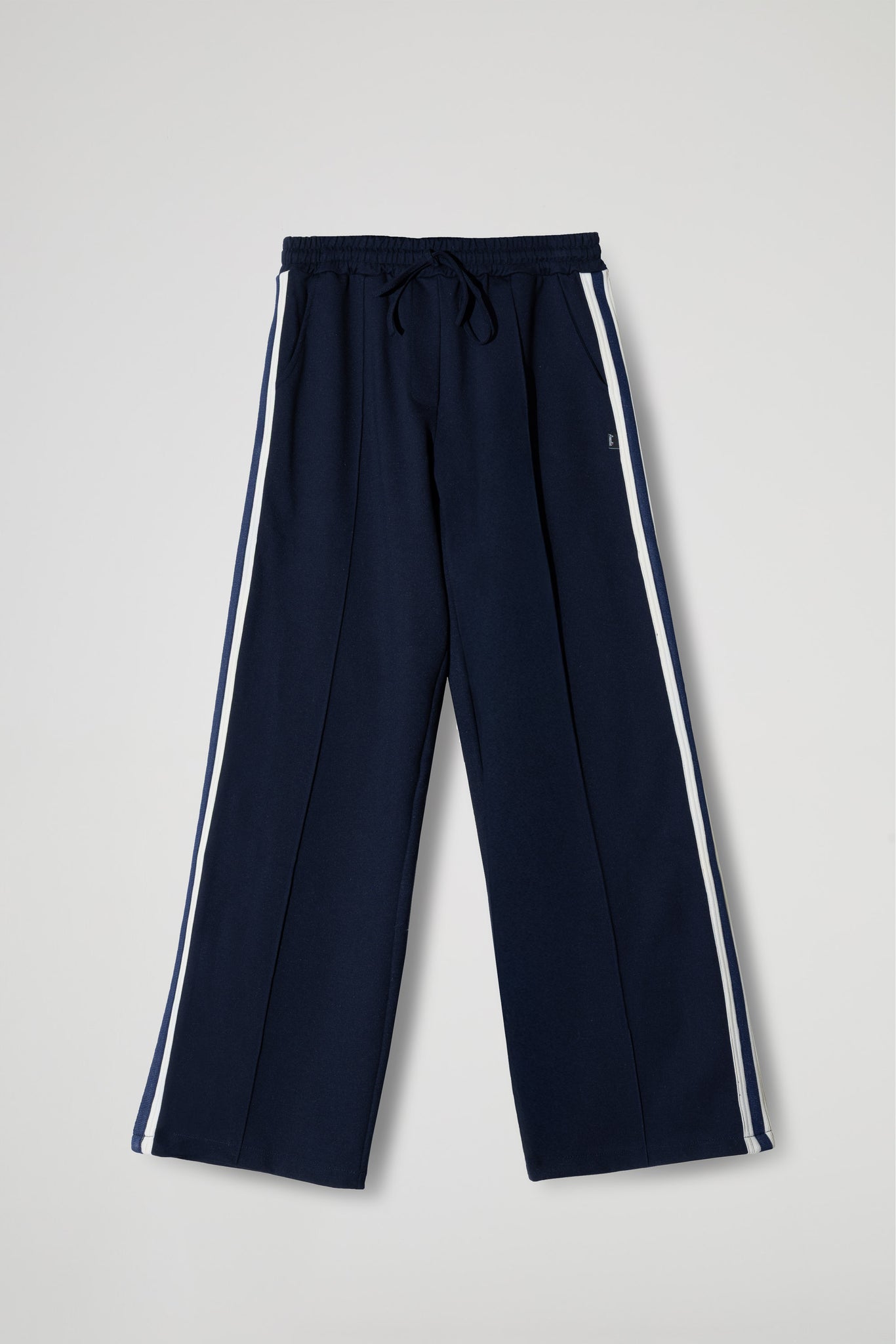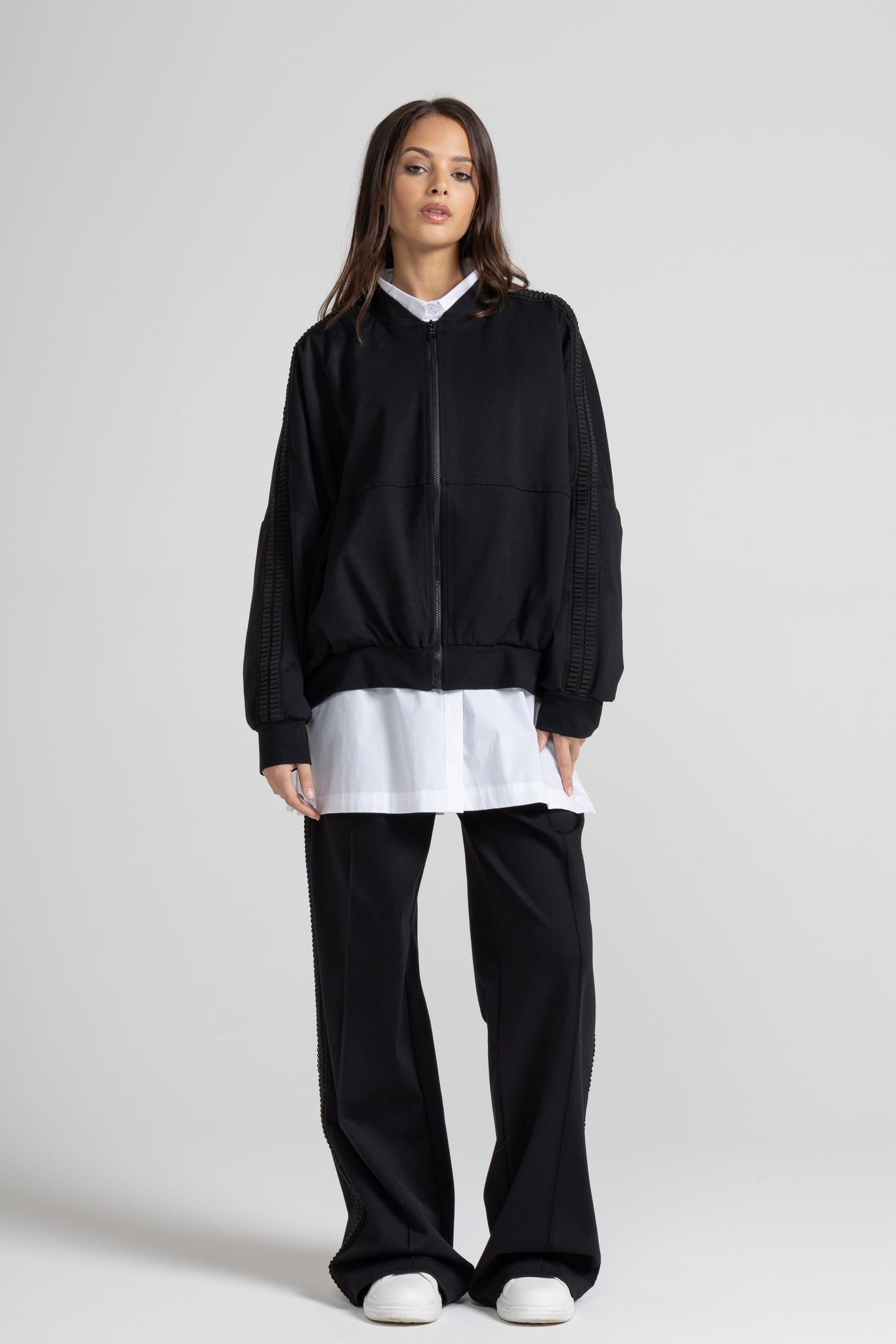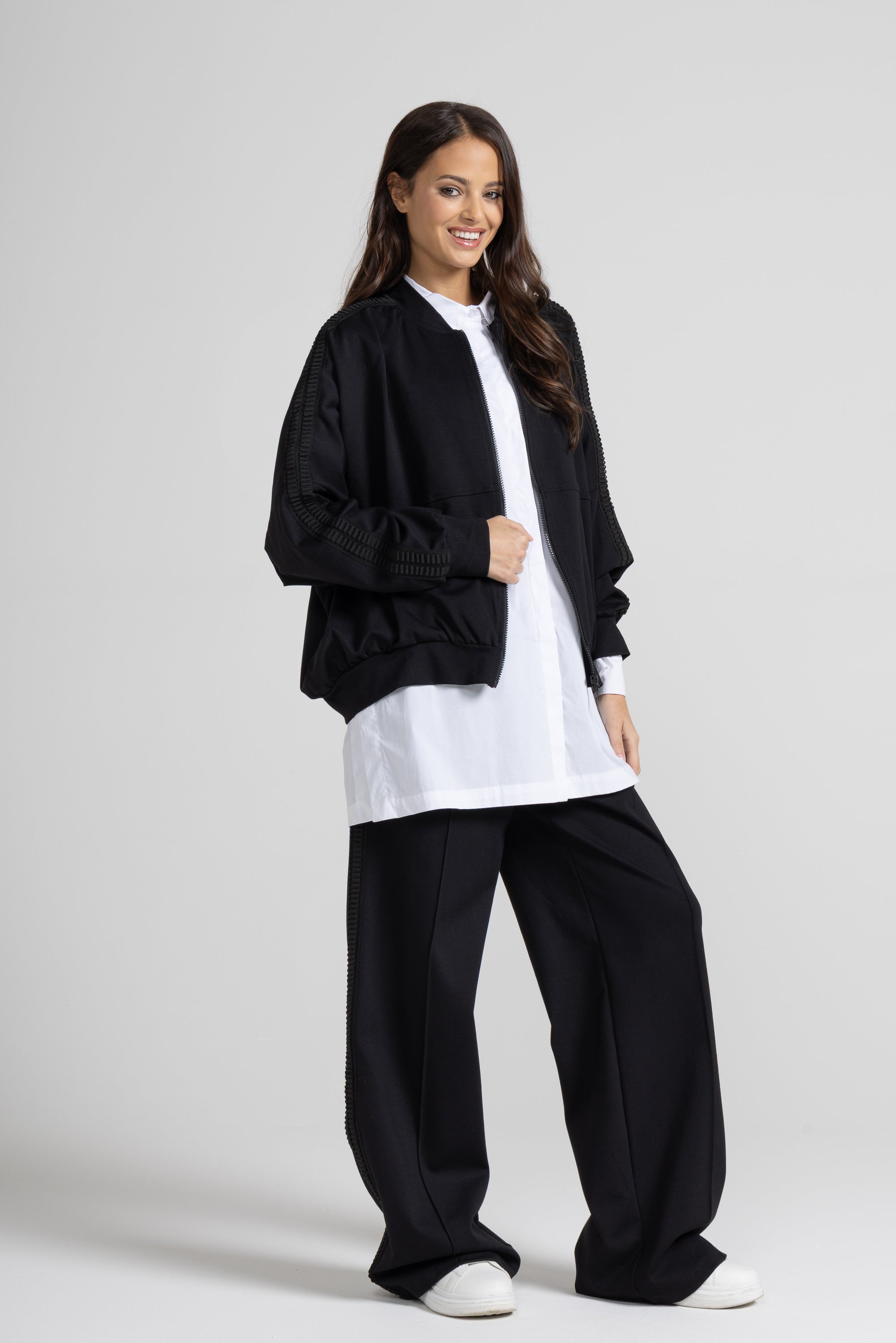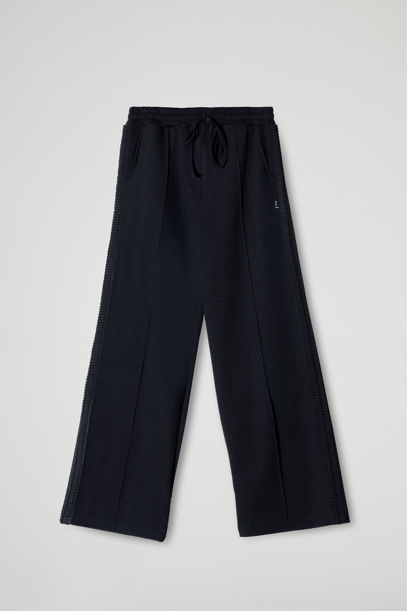 PANTALONE PALAZZO IN PUNTO MILANO DI VISCOSA, ELASTICO E COULISSE REGOLABILE IN VITA, DETTAGLIO PASSAMANERIA SULLA LUNGHEZZA DELLA GAMBA.
