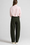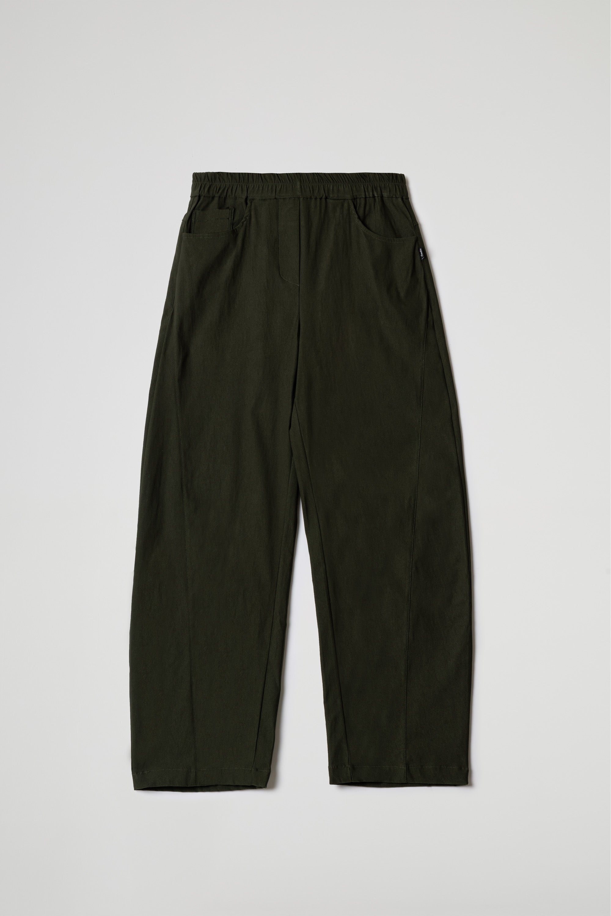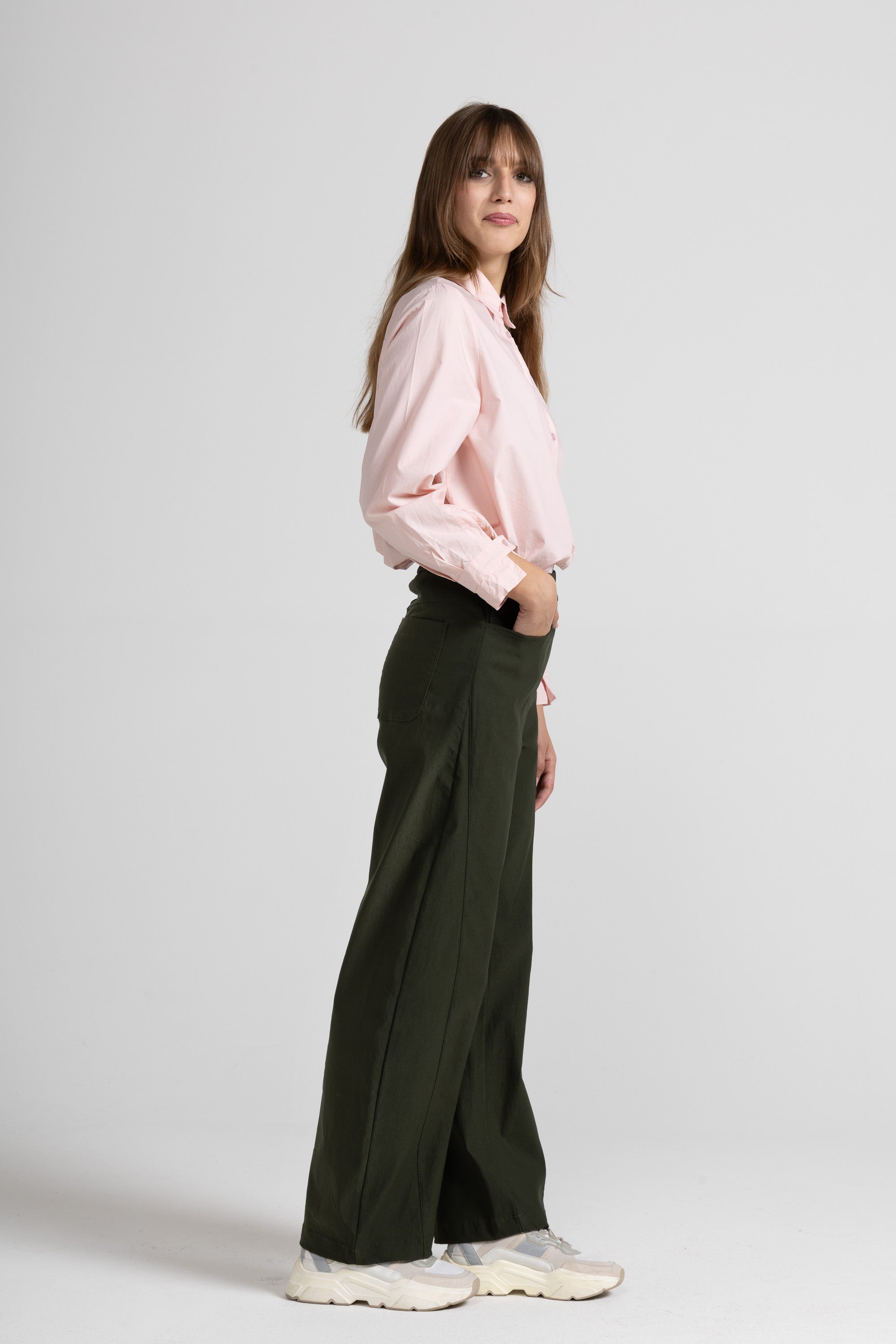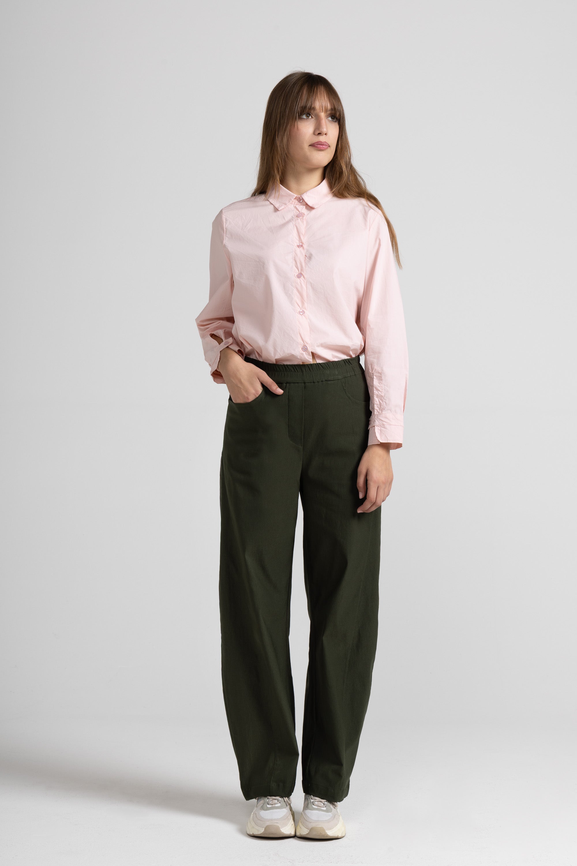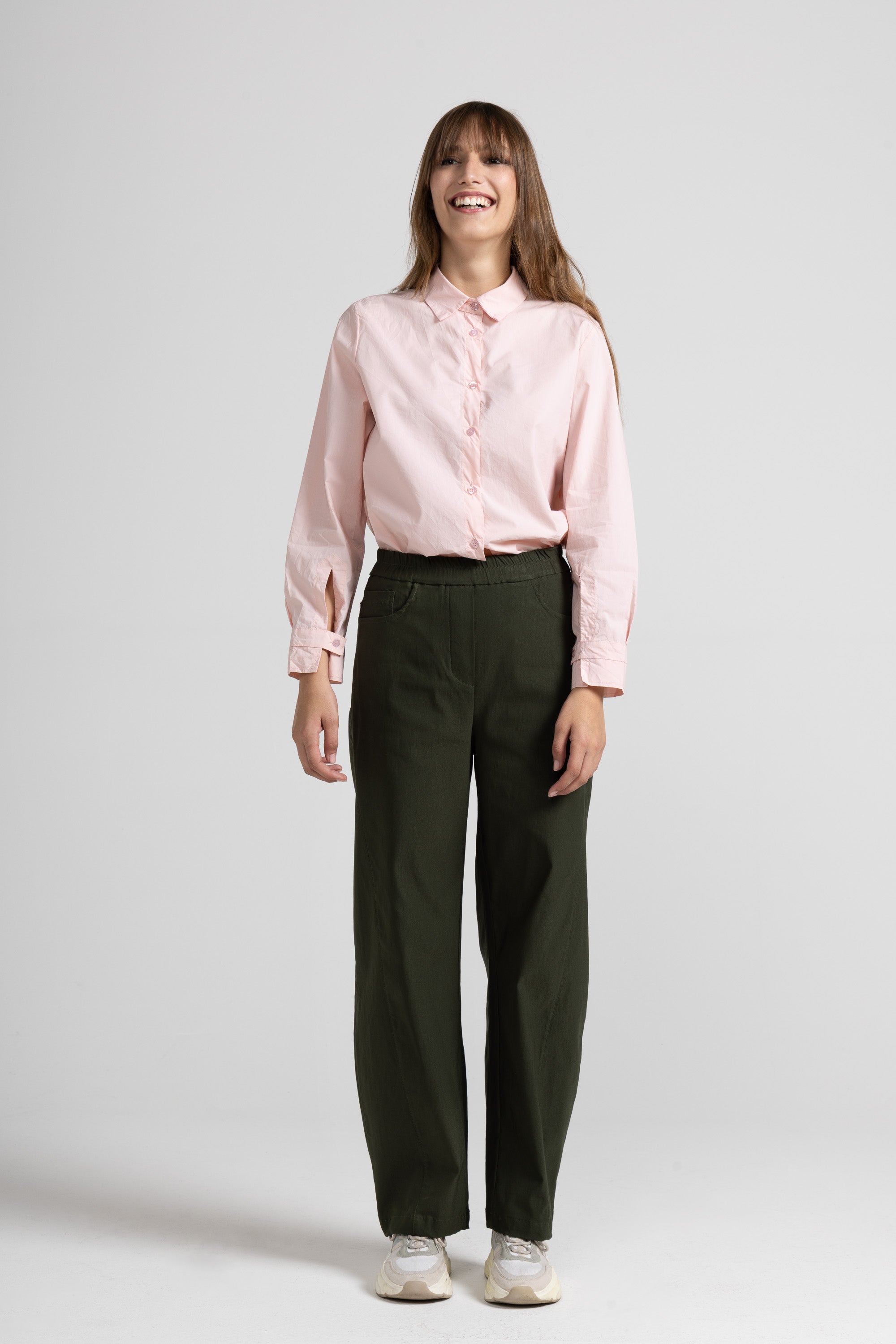 Pantalone in tessuto bengalina di viscosa elasticizzato, elastico in vita, tasche laterali con taschino interno, cuciture tono su tono sul davanti, tasche a toppa applicate sul retro, taglio a uovo. linea ampia e confortevole
