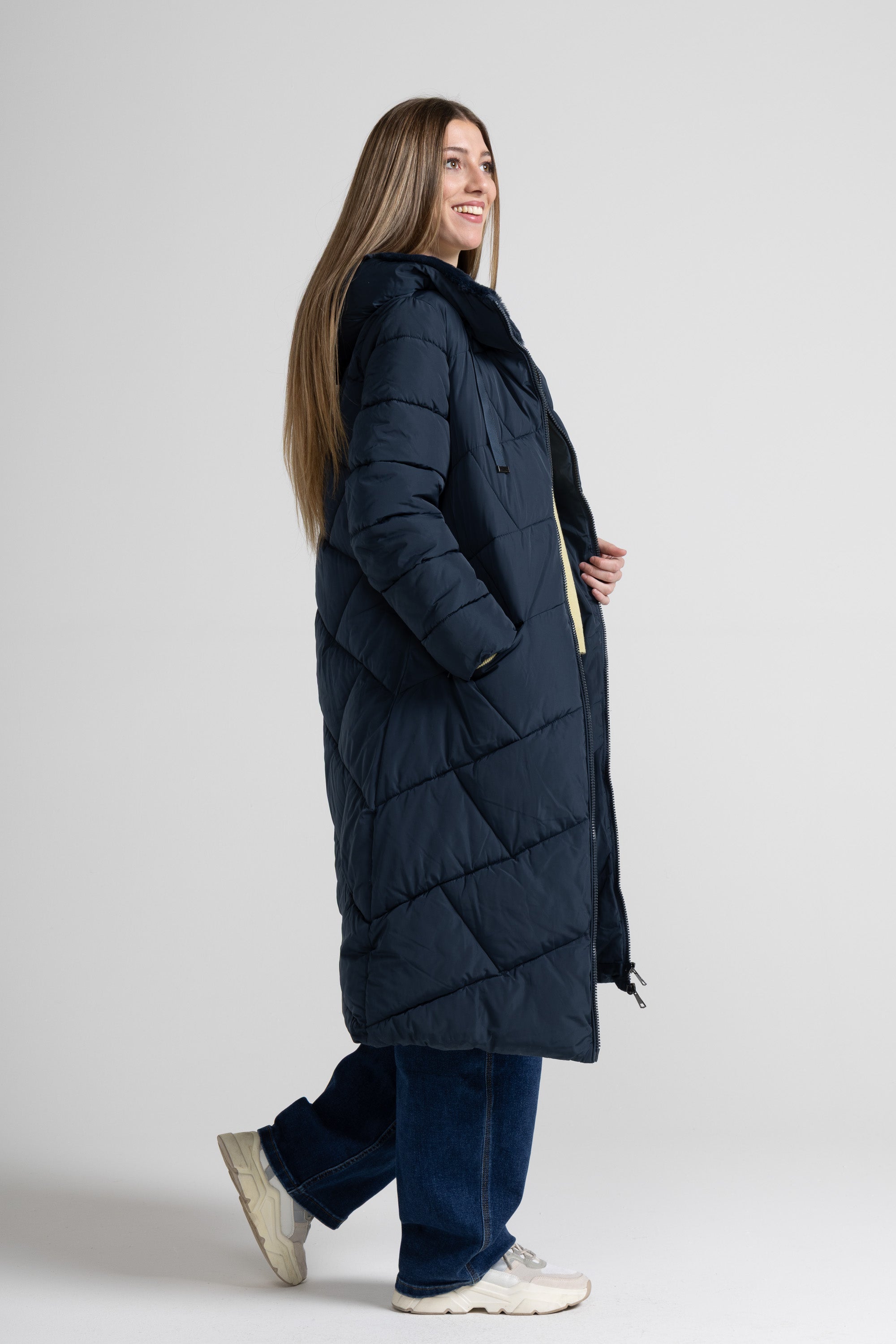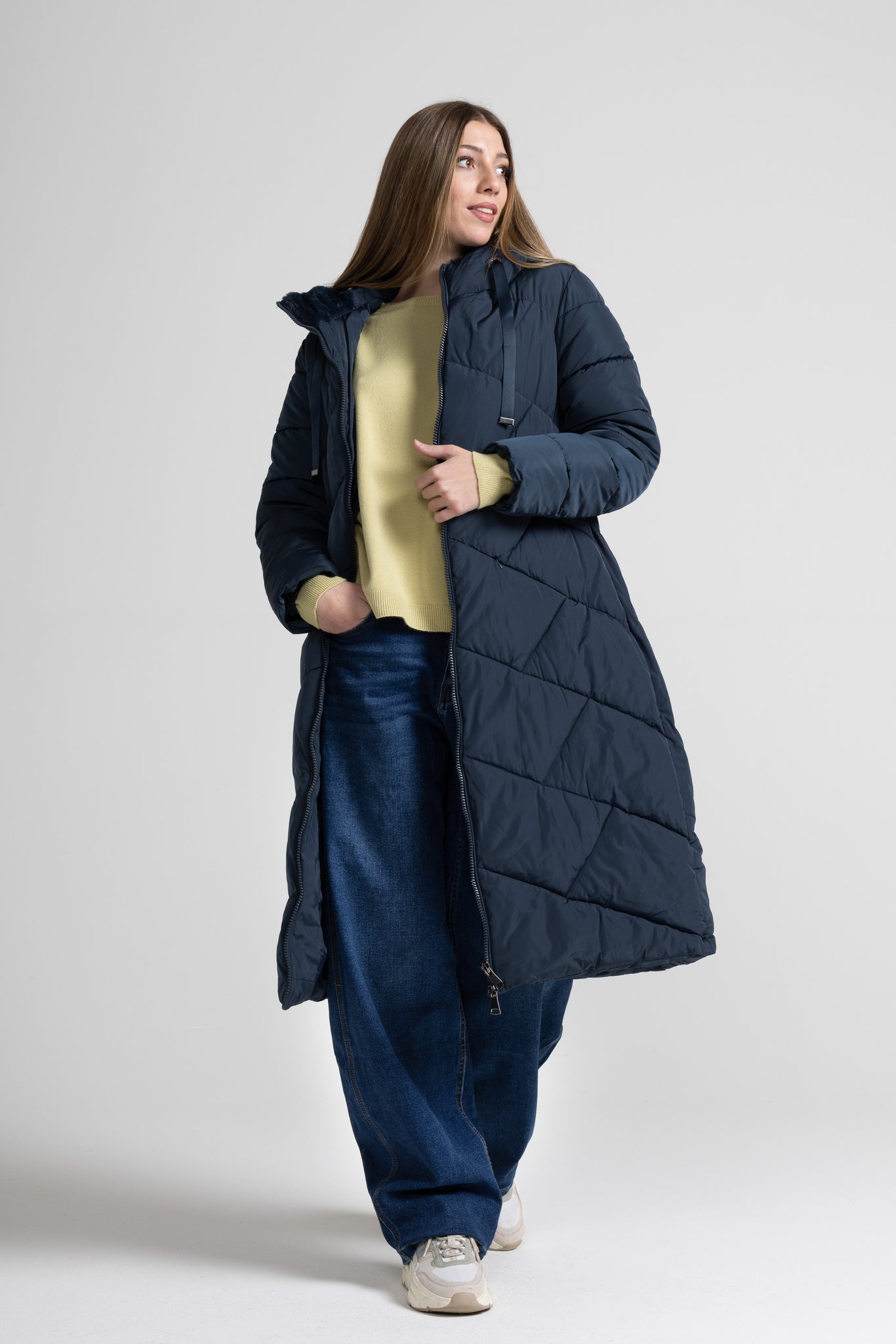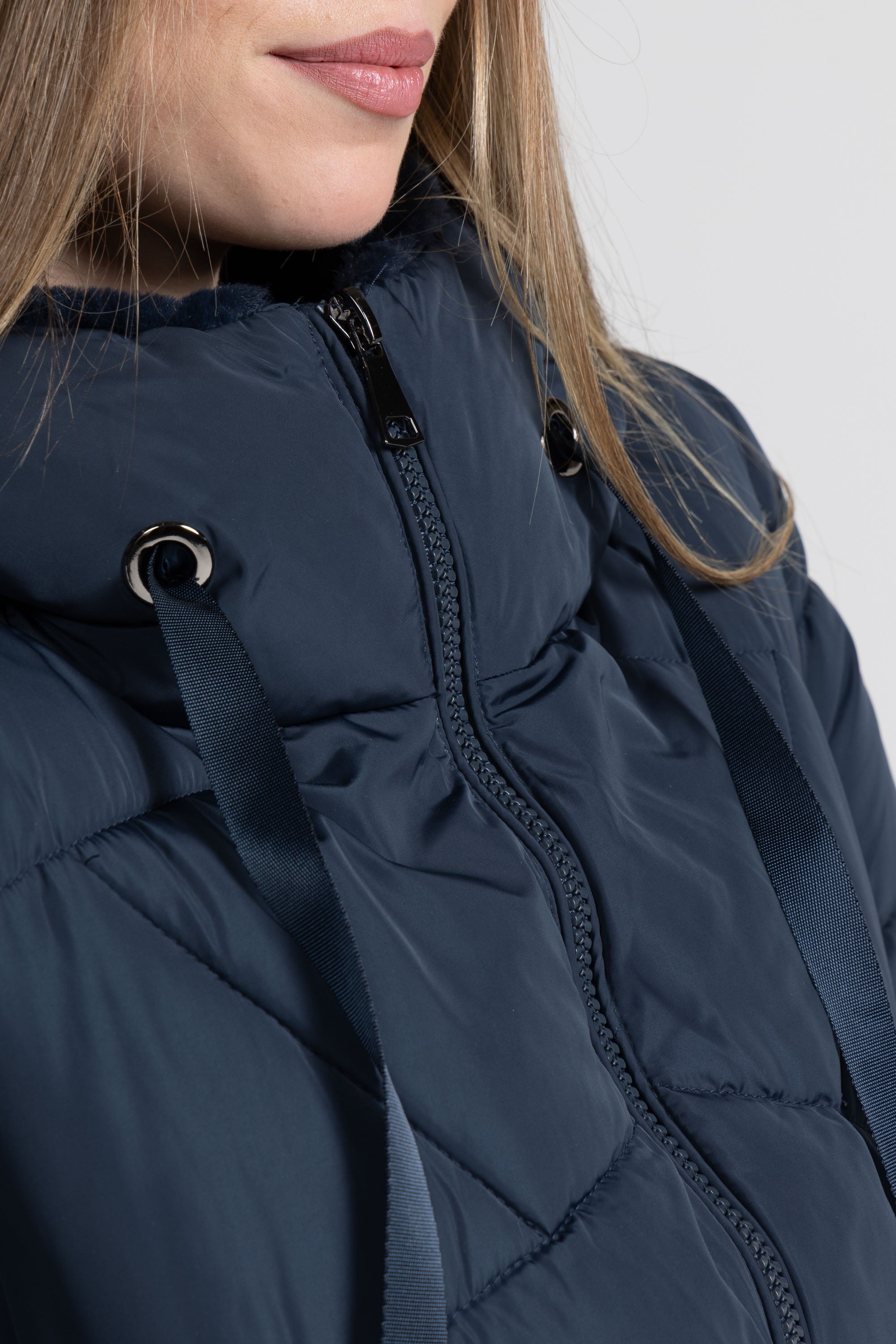 Piumino lungo, cappuccio con eco-pelliccia ampio e avvolgente regolabile con nastri in tono con puntali metallici, zip centrale lunga con doppio cursore, tasche laterali con zip invisibile, dettaglio trapunta su tutto il capo. Linea ampia