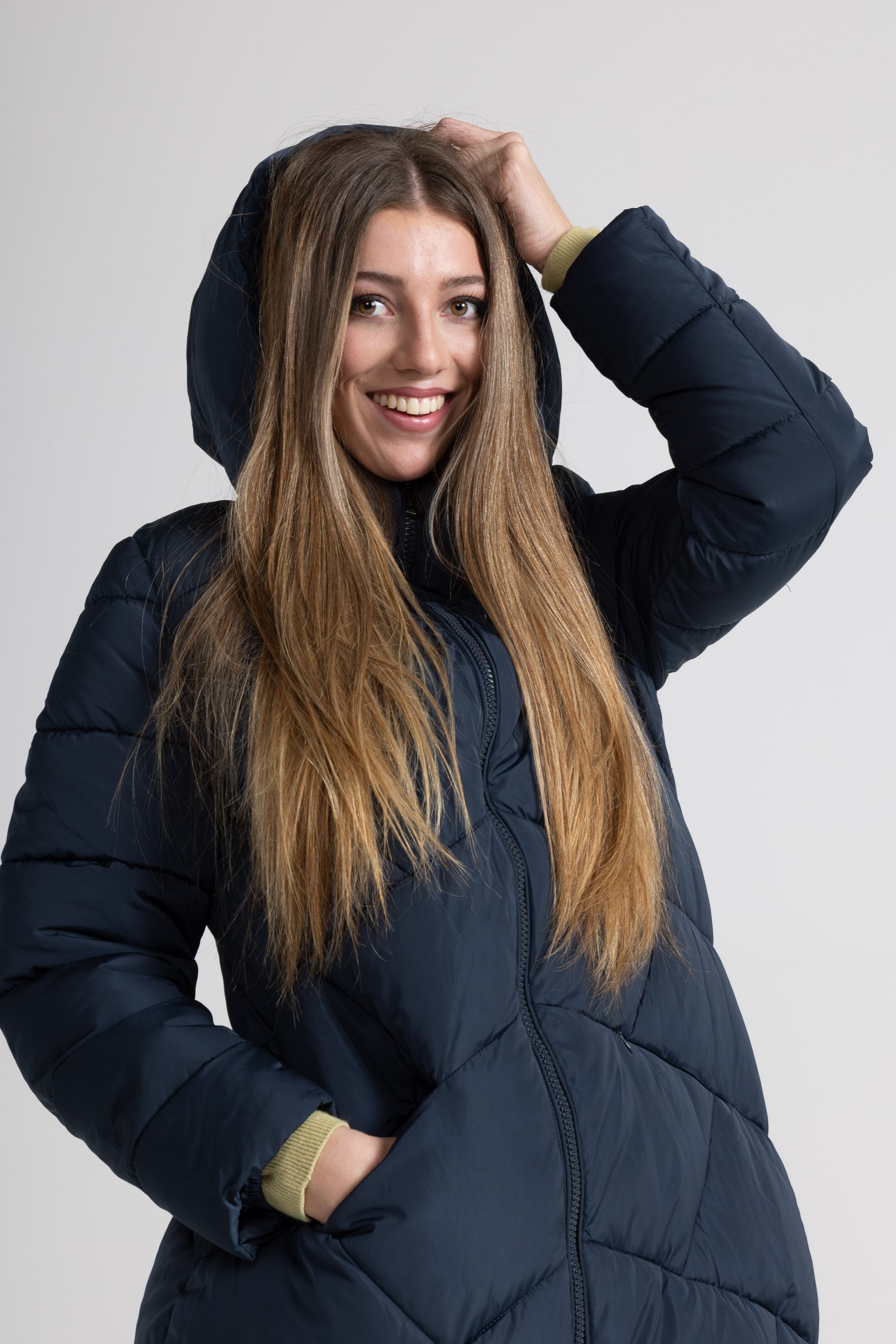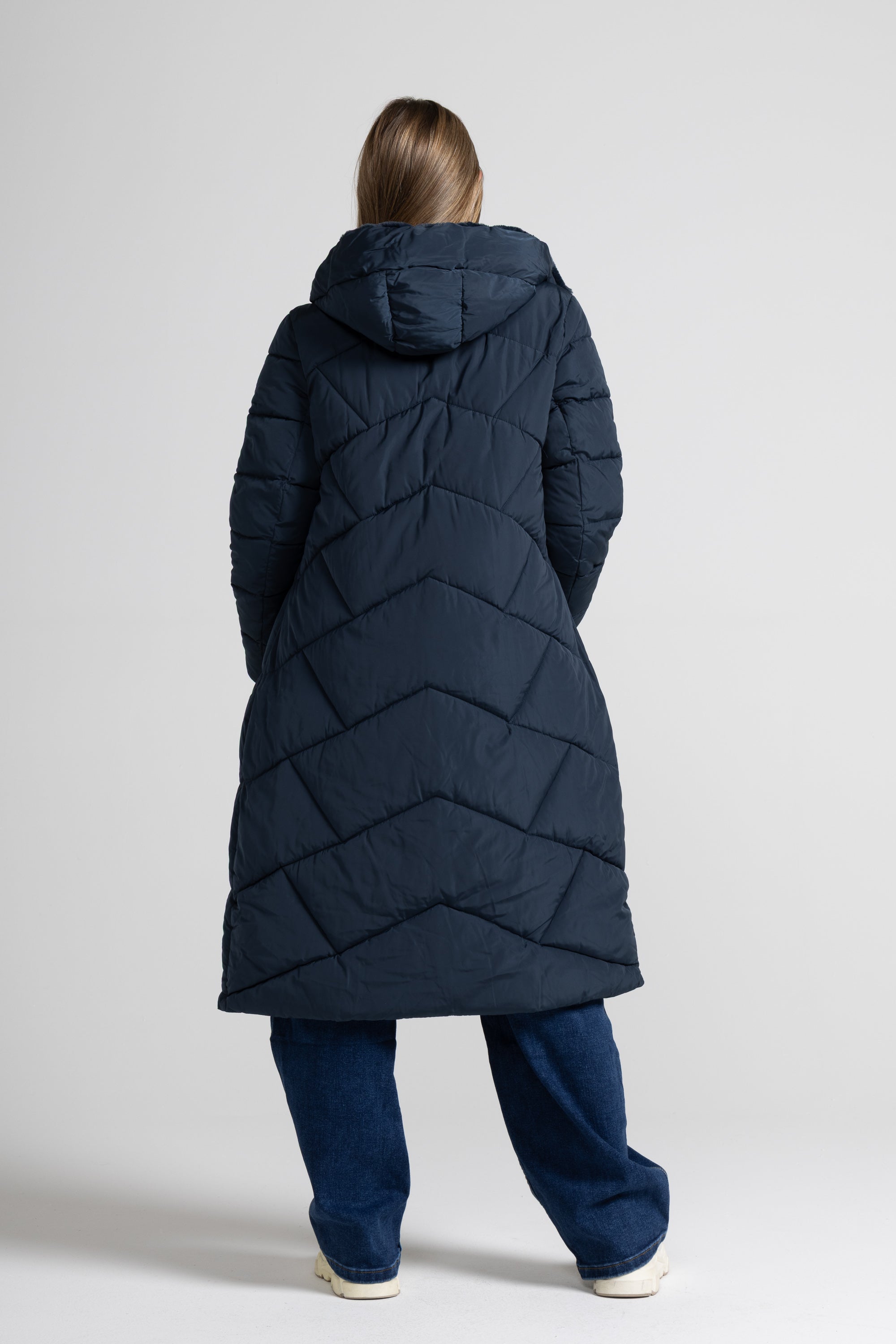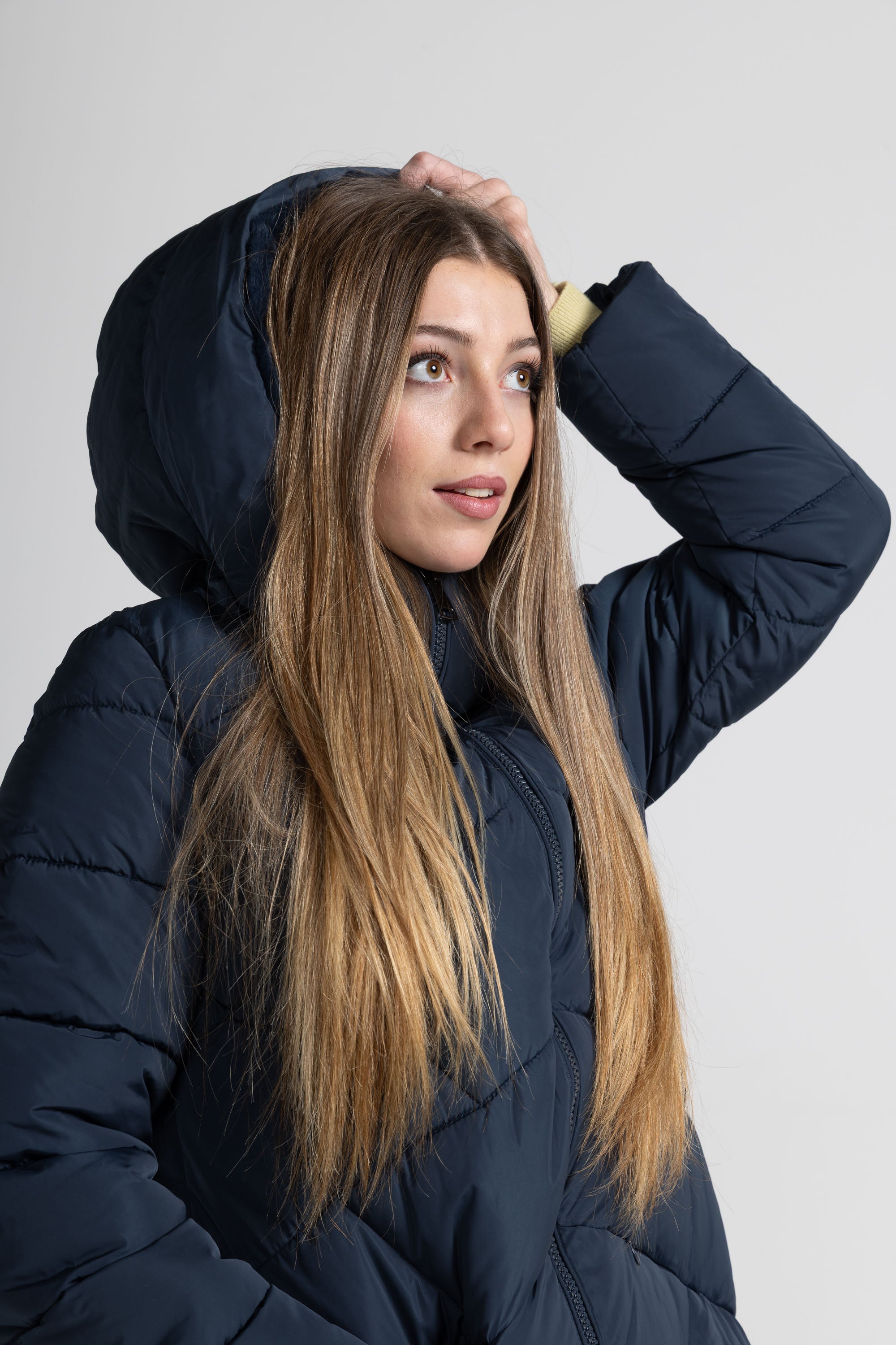 Piumino lungo, cappuccio con eco-pelliccia ampio e avvolgente regolabile con nastri in tono con puntali metallici, zip centrale lunga con doppio cursore, tasche laterali con zip invisibile, dettaglio trapunta su tutto il capo. Linea ampia