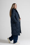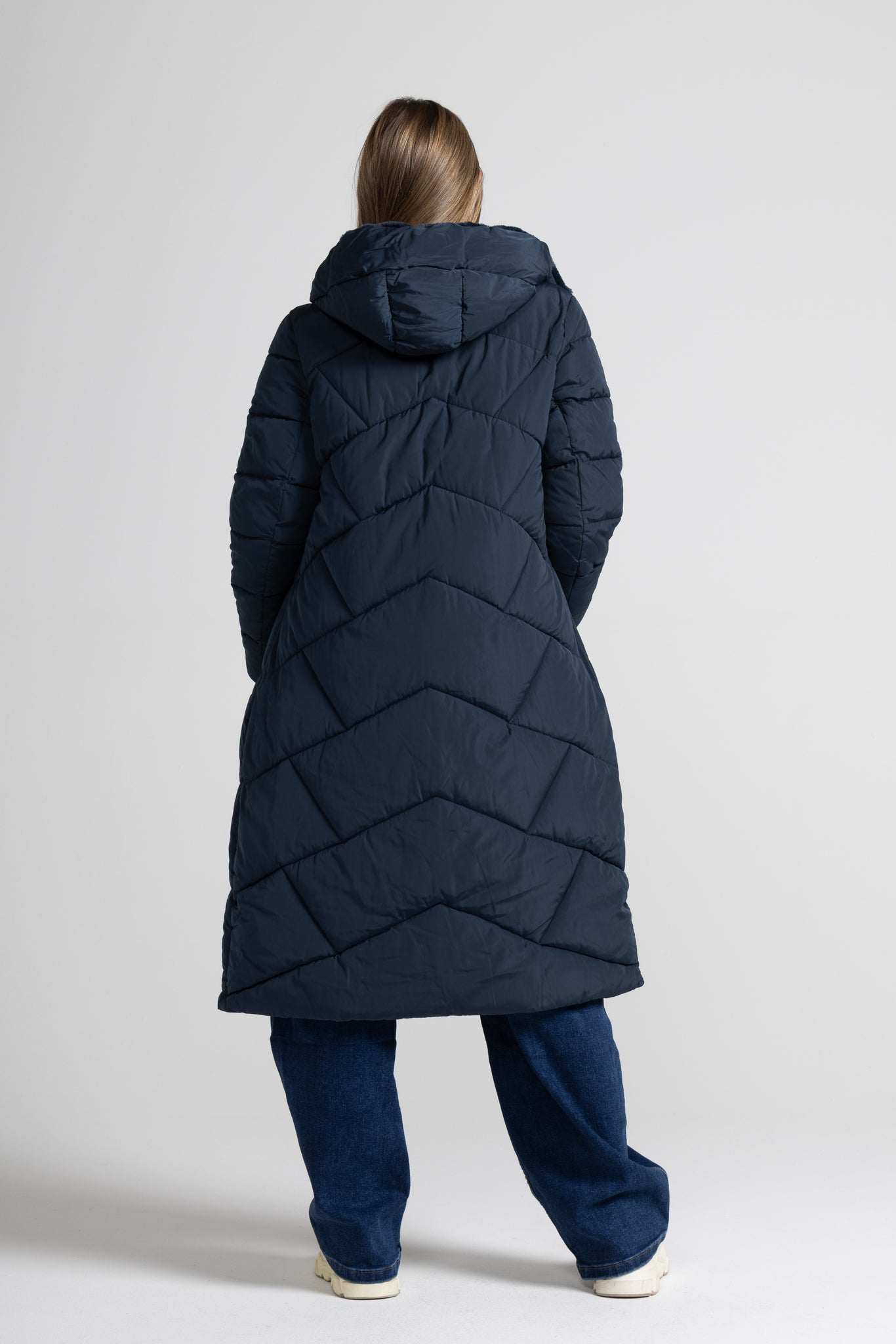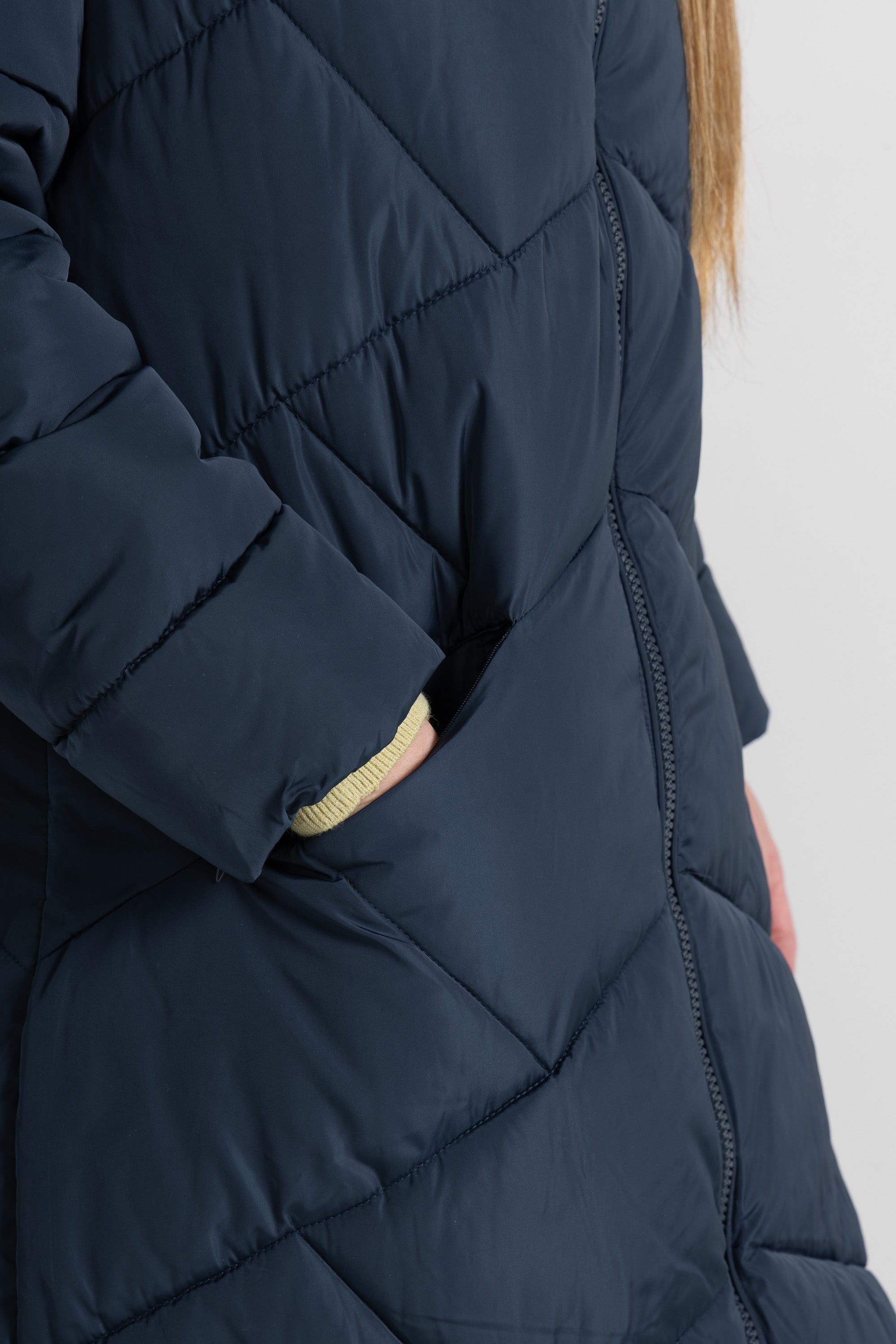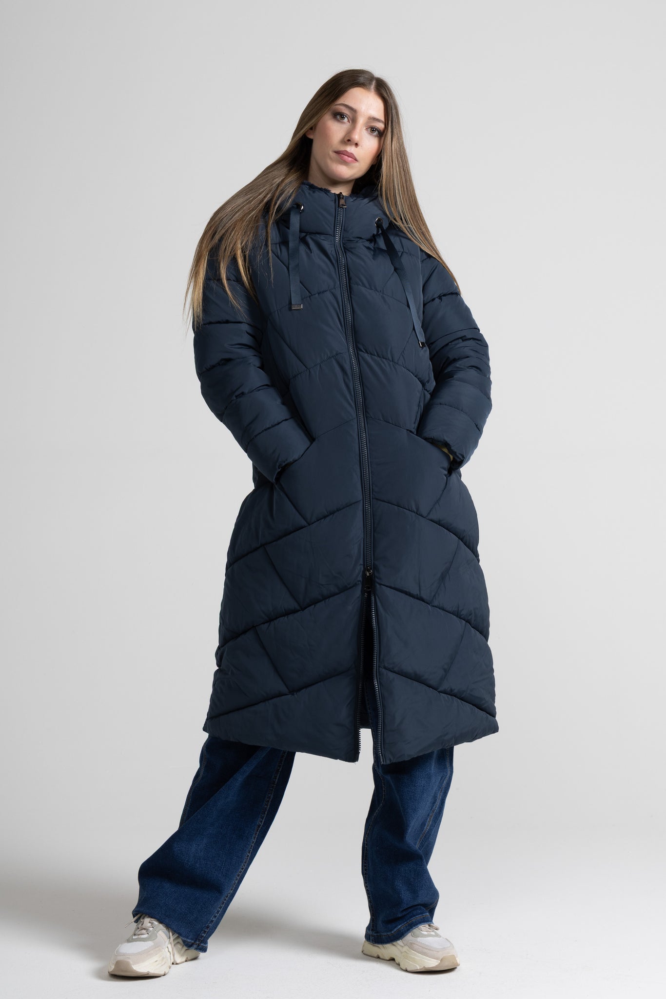 Piumino lungo dal design essenziale ma curato nei dettagli, con una linea leggermente svasata che valorizza la figura e permette una vestibilità comoda anche sopra maglioni o capi più pesanti. La trapuntatura a rombi dona movimento al capo e contribuisce a distribuire uniformemente