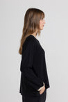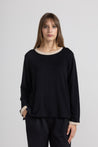 TOP ASSIMETRICO IN MAGLINA DI VISCOSA SMACCHINATA, COLLO AMPIO E ROTONDO , SPACCHETI LATERALI, FONDO RIBTTUTO ALTO, DETTAGLIO COSTINA A CONTRASTO SU COLLO E POLSI. LINEA AMPIA E MORBIDA