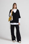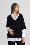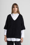 Maglia in viscosa, caratterizzata da linea morbida e vestibilità ampia. Presenta scollo a V profondo rifinito con bordo a costine, maniche corte ampie e cadenti, e fondo anch’esso rifinito con fascia a costine elasticizzata. Un modello essenziale e versatile, ideale sia indossato da solo che come sovrapposizione su camicie o top, perfetto per un look casual-chic.