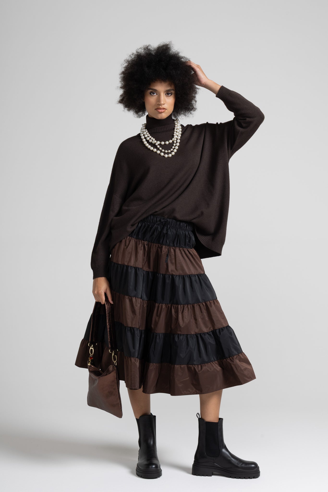 Collo alto e avvolgente a coste elasticizzate, spalle scese, maniche lunghe con polsini alti a  costine elasticizzate, lavorazione a bordo alto a costine compatte sul fondo. Linea ampia