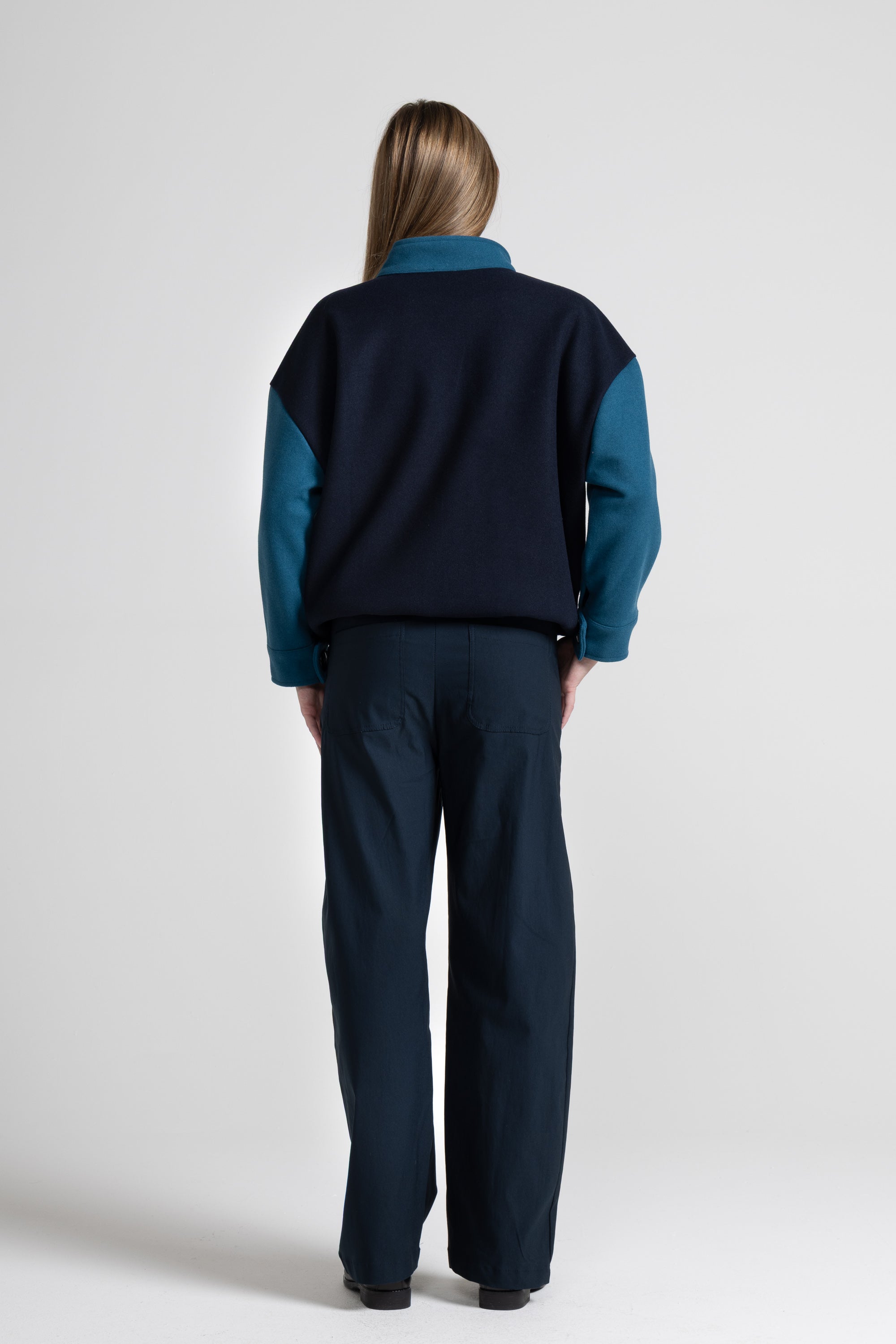 Pantalone in tessuto bengalina di viscosa elasticizzato, elastico in vita, tasche laterali con taschino interno, cuciture tono su tono sul davanti, tasche a toppa applicate sul retro, taglio a uovo. linea ampia e confortevole