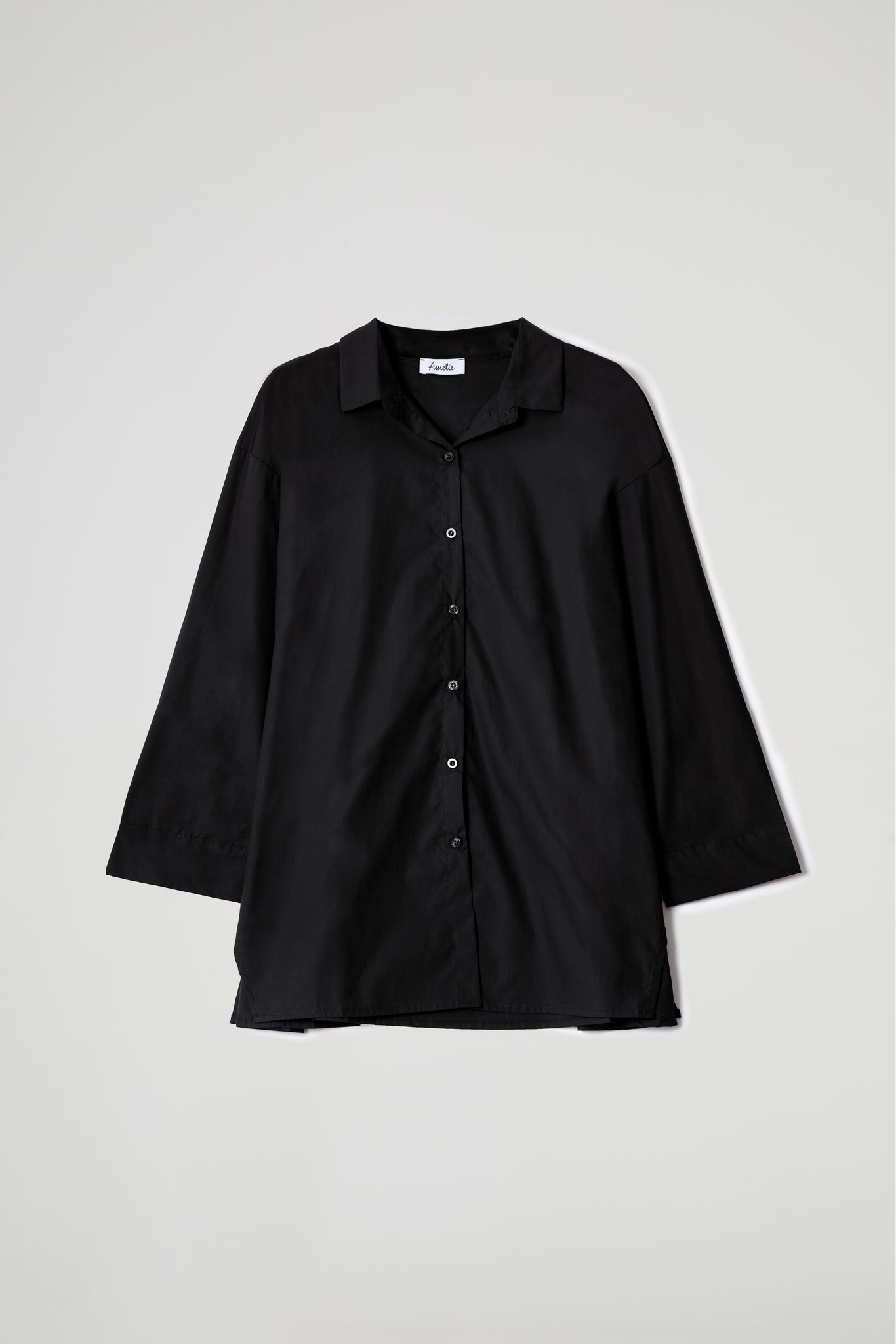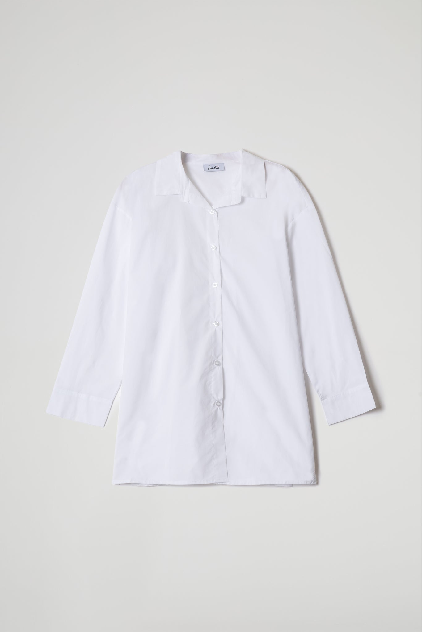 Camicia over in popeline di cotone, collo classico con rever morbido, manica lunga con polso strutturato e bottone singolo, chiusura frontale con bottoni tono su tono, taglio a carrè con piega sul retro, spacchi laterali profondi. Linea ampia.