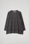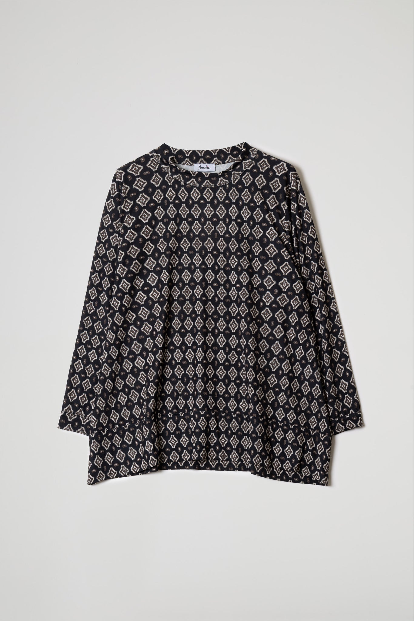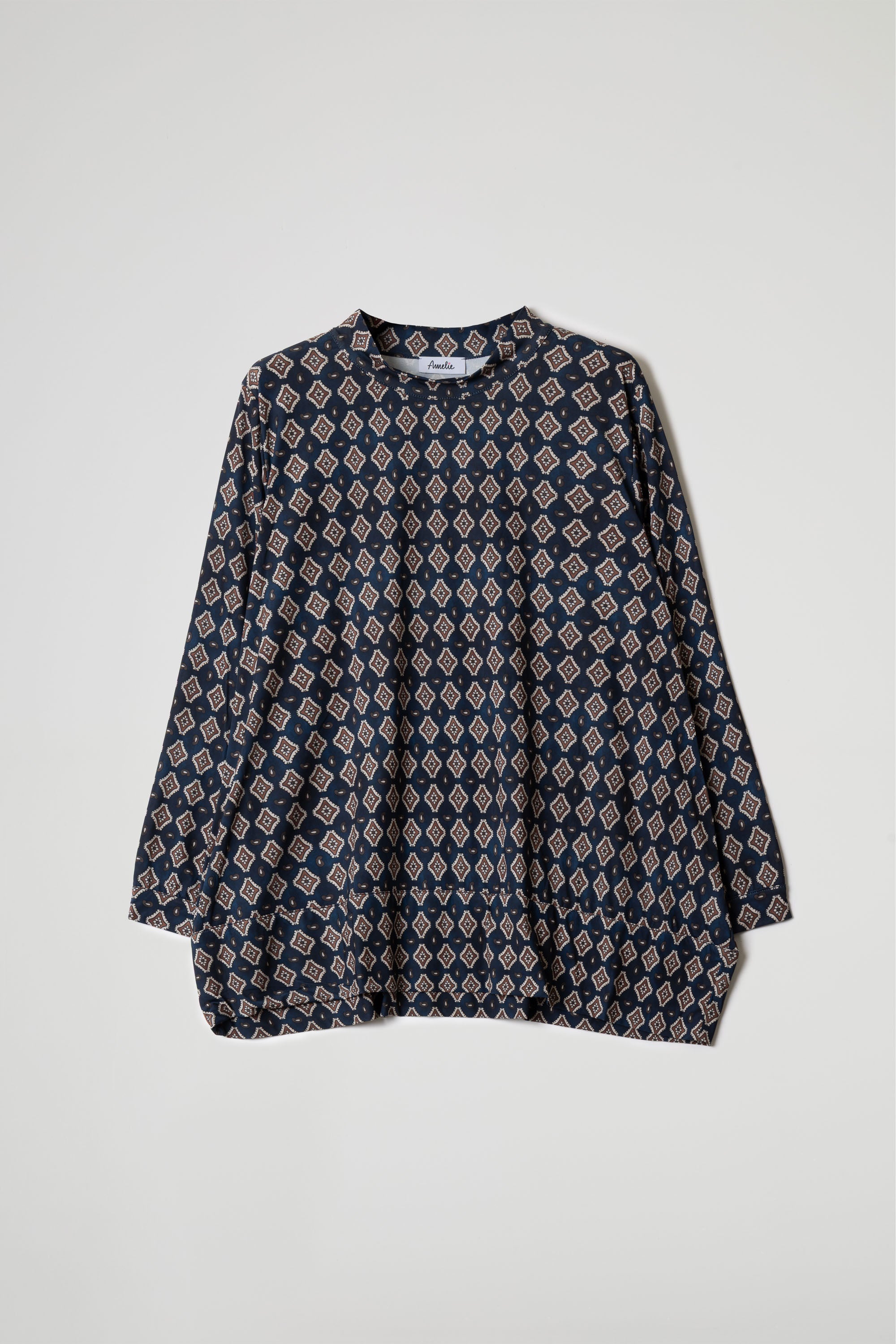 Top over asimmetrico in tessuto tecnico, collo alla coreana, manica lunga leggermente a sbuffo, orlo ribattuto alto su polsi e fondo, fantasia geometrica su tutto il capo. Linea ampia e morbida.