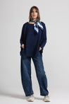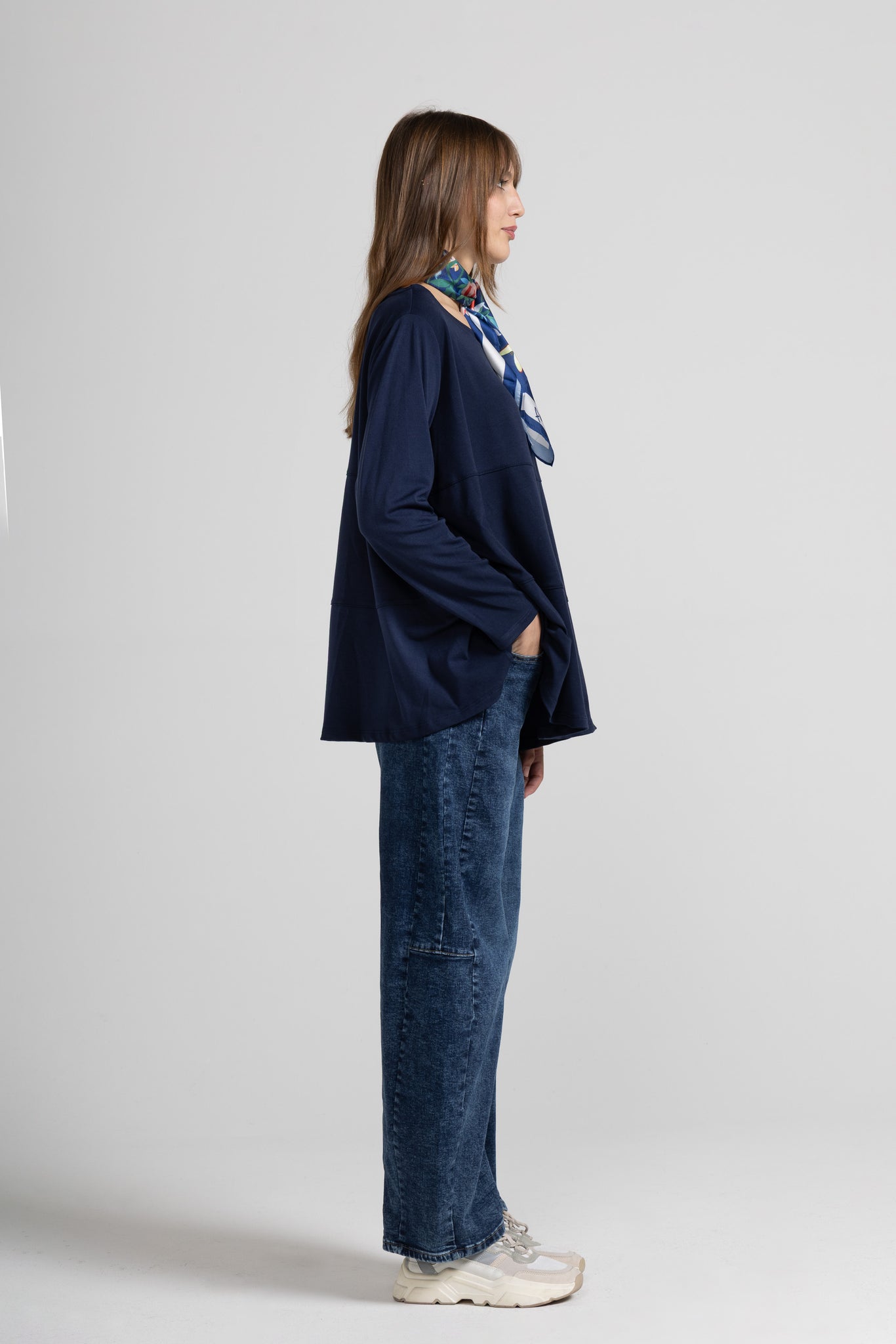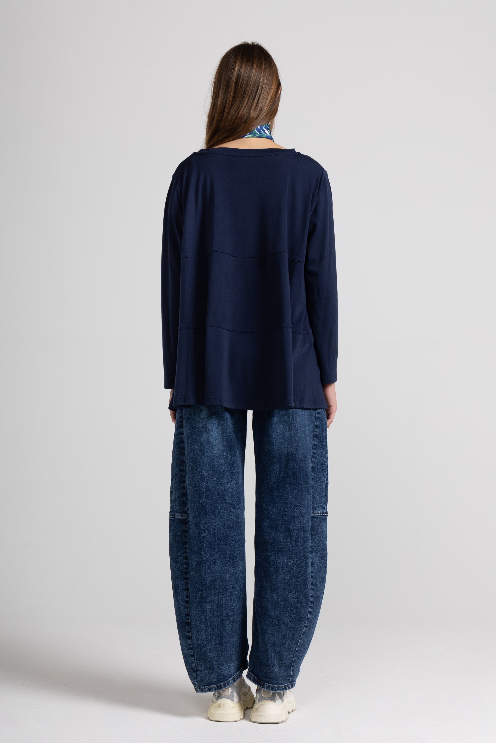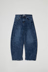 Denim scuro effetto slavato, vita alta con passanti per cintura, chiusura con bottone metallico e zip, 5 tasche classiche, due davanti, due dietro e una piccola tasca portamonete, vestibilità molto ampia e svasata, con gamba larga e taglio morbido che si restringe leggermente verso il fondo. Inoltre, sono presenti cuciture verticali evidenti che danno struttura e un effetto geometrico al design.