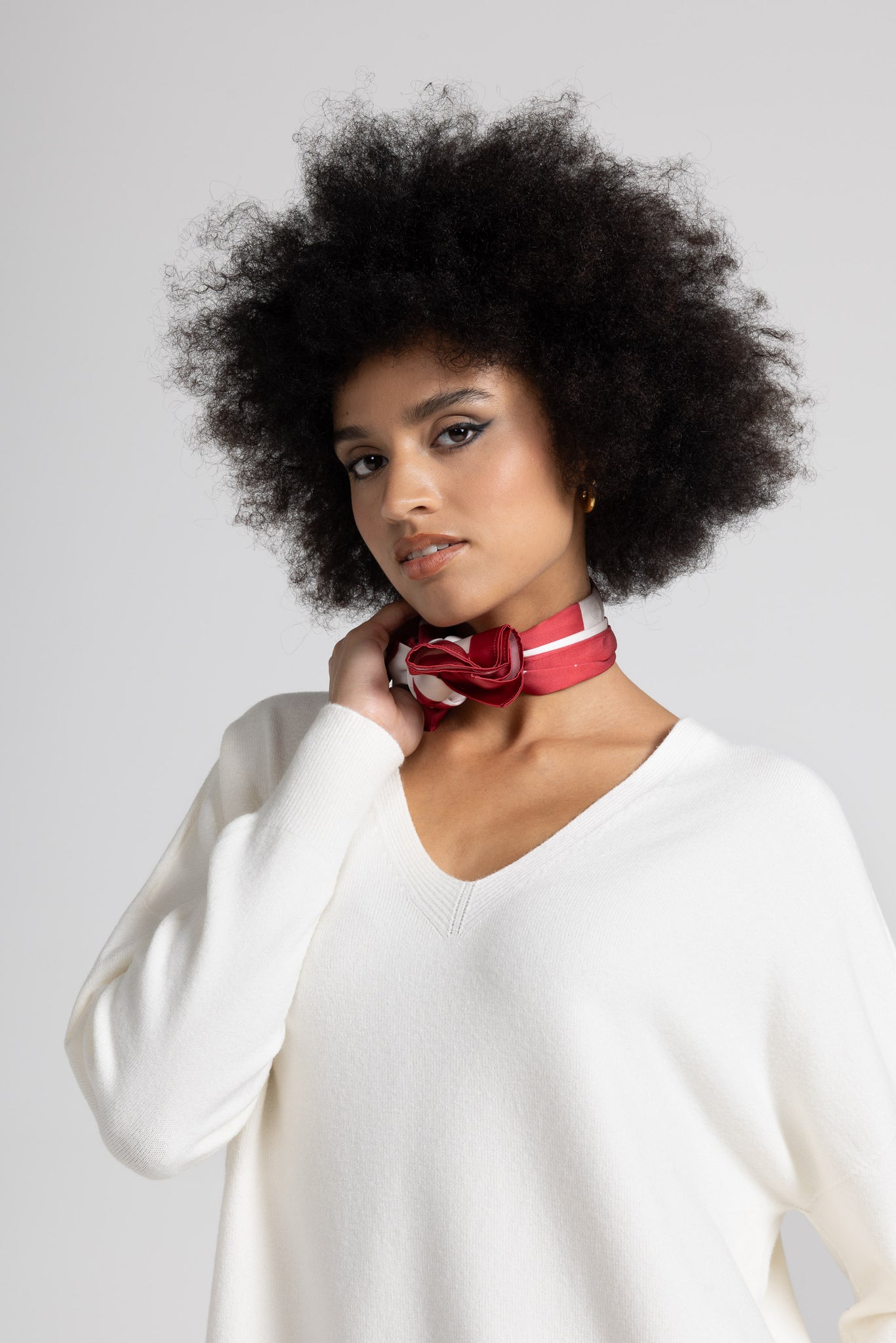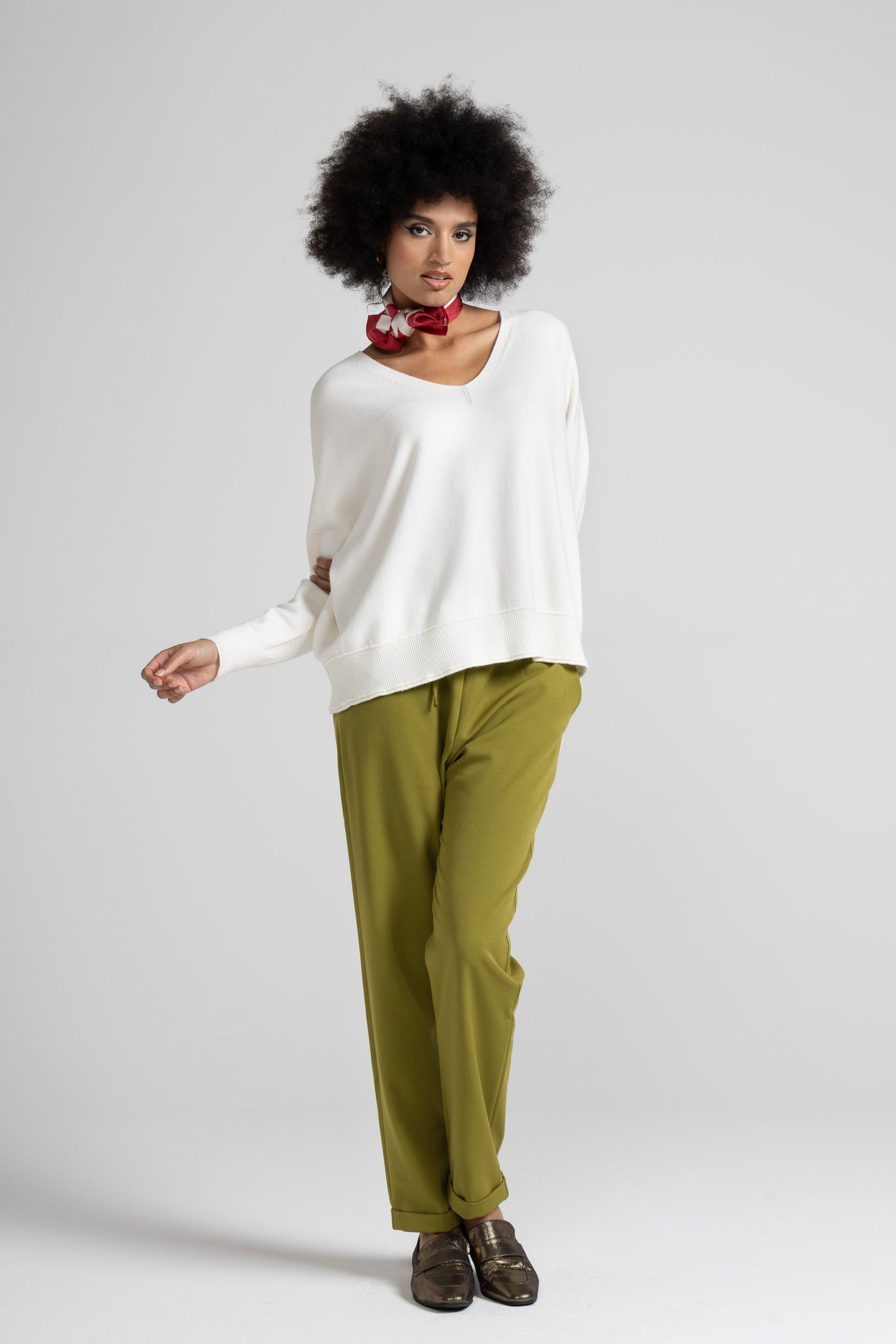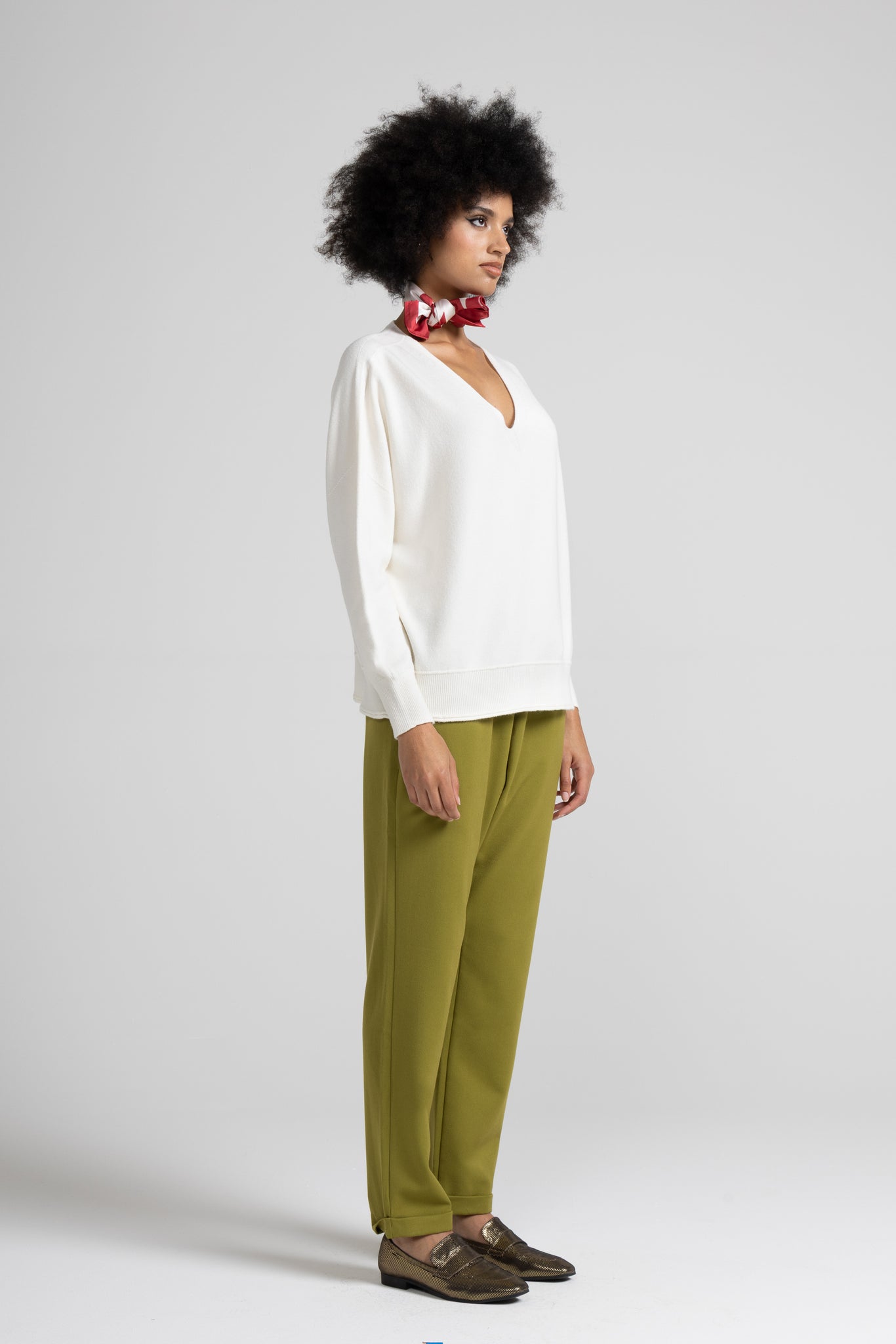 Scollo a V con dettaglio a coste sottili con rinforzo centrale a doppio filo, spalla leggermente scesa, maniche lunghe con polsini a costina alta, sul fondo lavorazione a bordo alto con motivo sagomato. Linea comfort