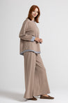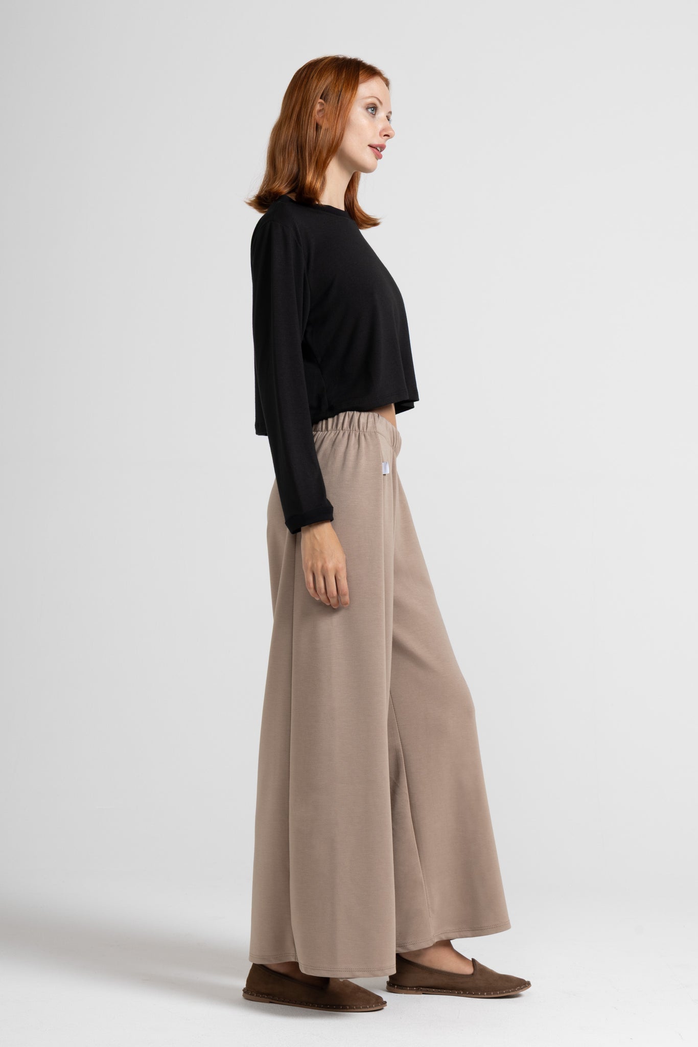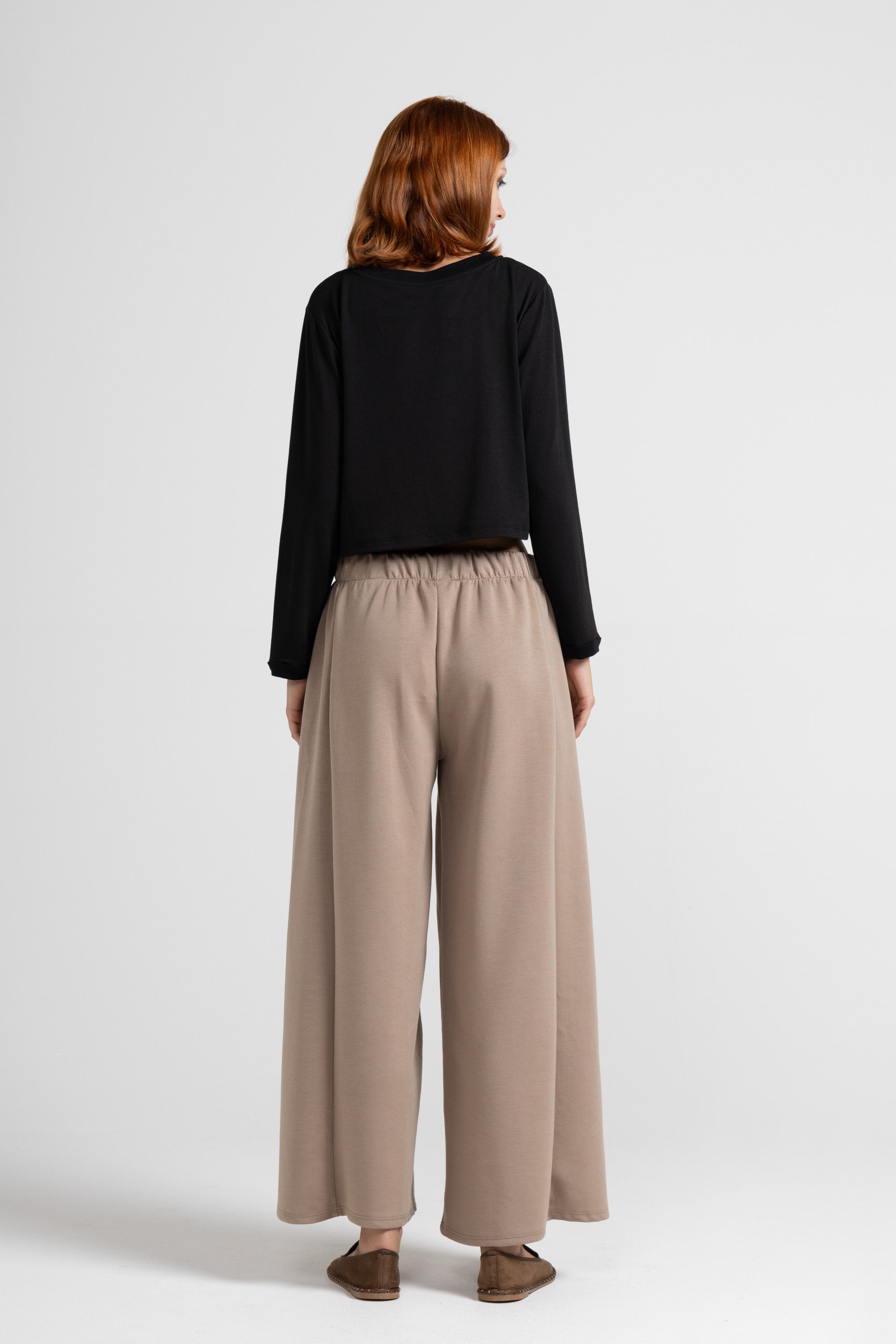 PANTALONE PALAZZO IN TESSUTO FLUIDO DI VISCOSA, DETTAGLIO TAGLIO SU FIANCO, ELASTICO IN VITA.