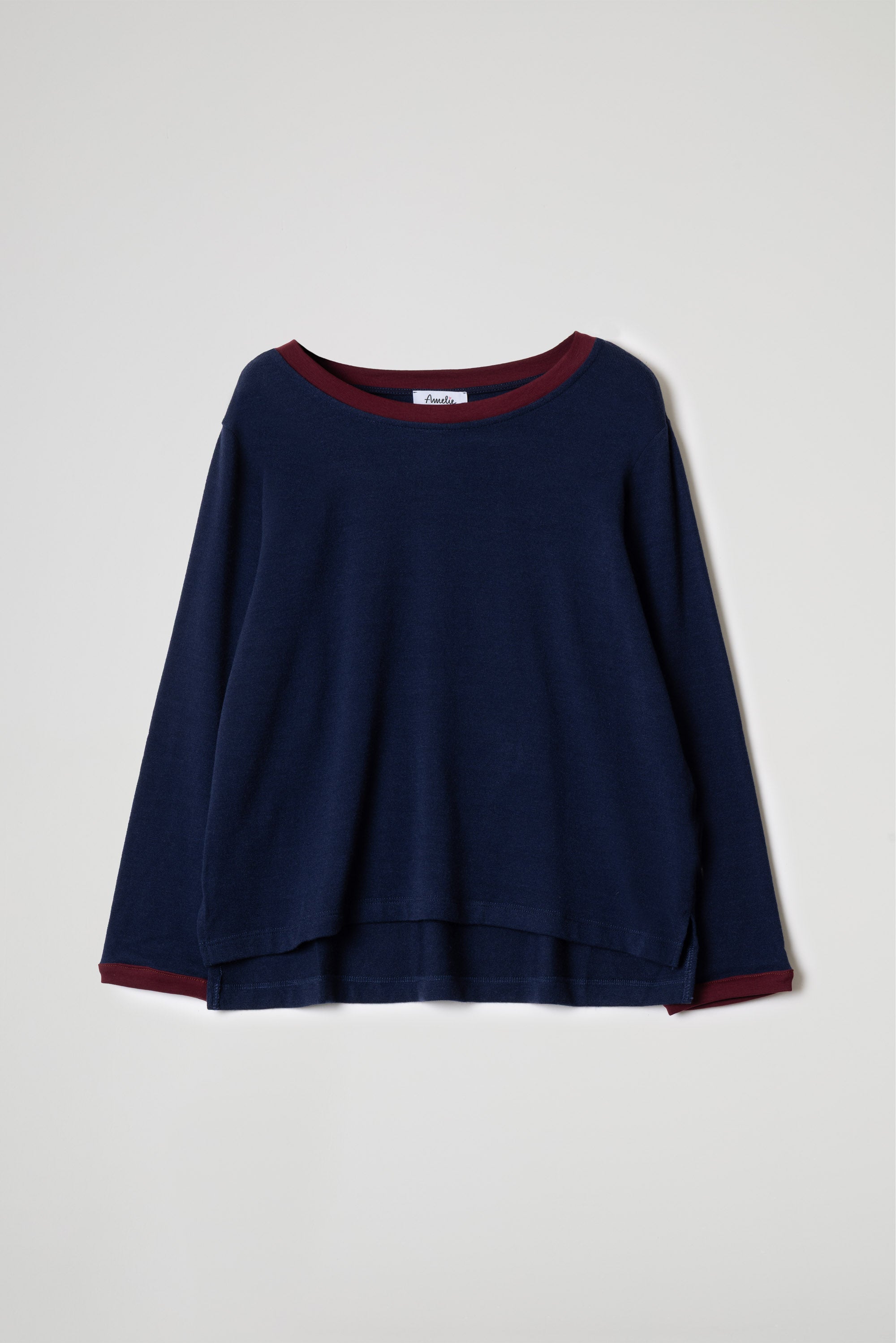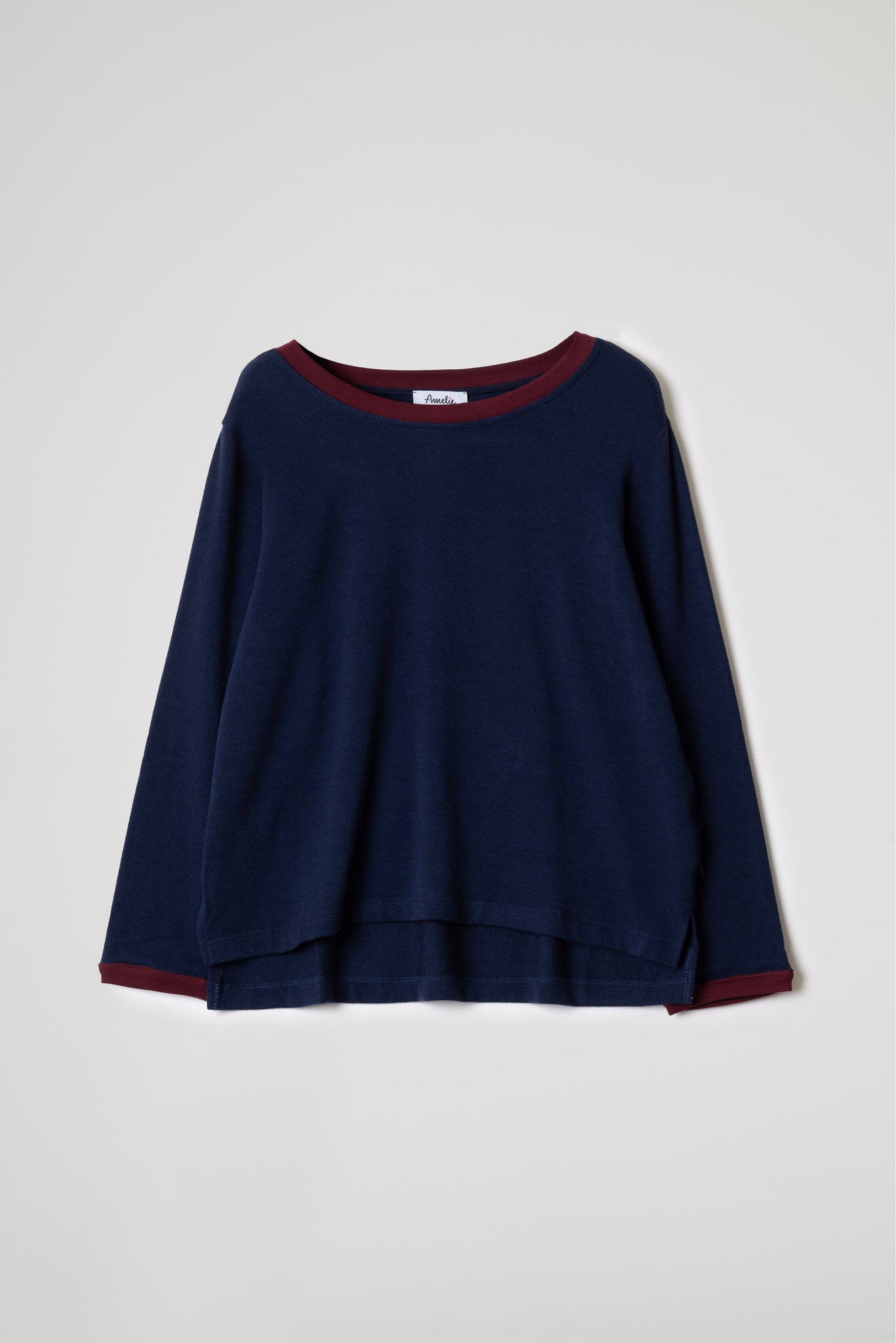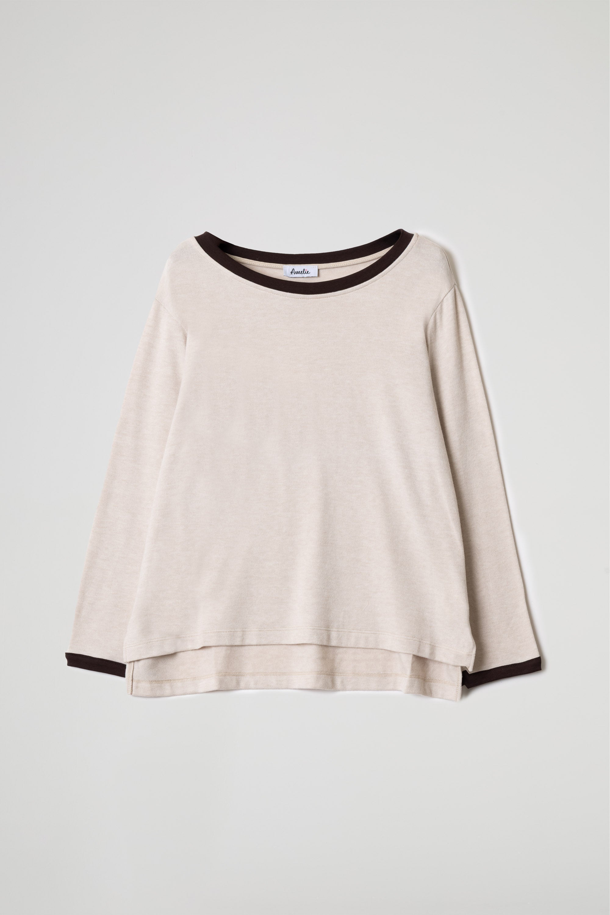 TOP ASSIMETRICO IN MAGLINA DI VISCOSA SMACCHINATA, COLLO AMPIO E ROTONDO , SPACCHETI LATERALI, FONDO RIBTTUTO ALTO, DETTAGLIO COSTINA A CONTRASTO SU COLLO E POLSI. LINEA AMPIA E MORBIDA