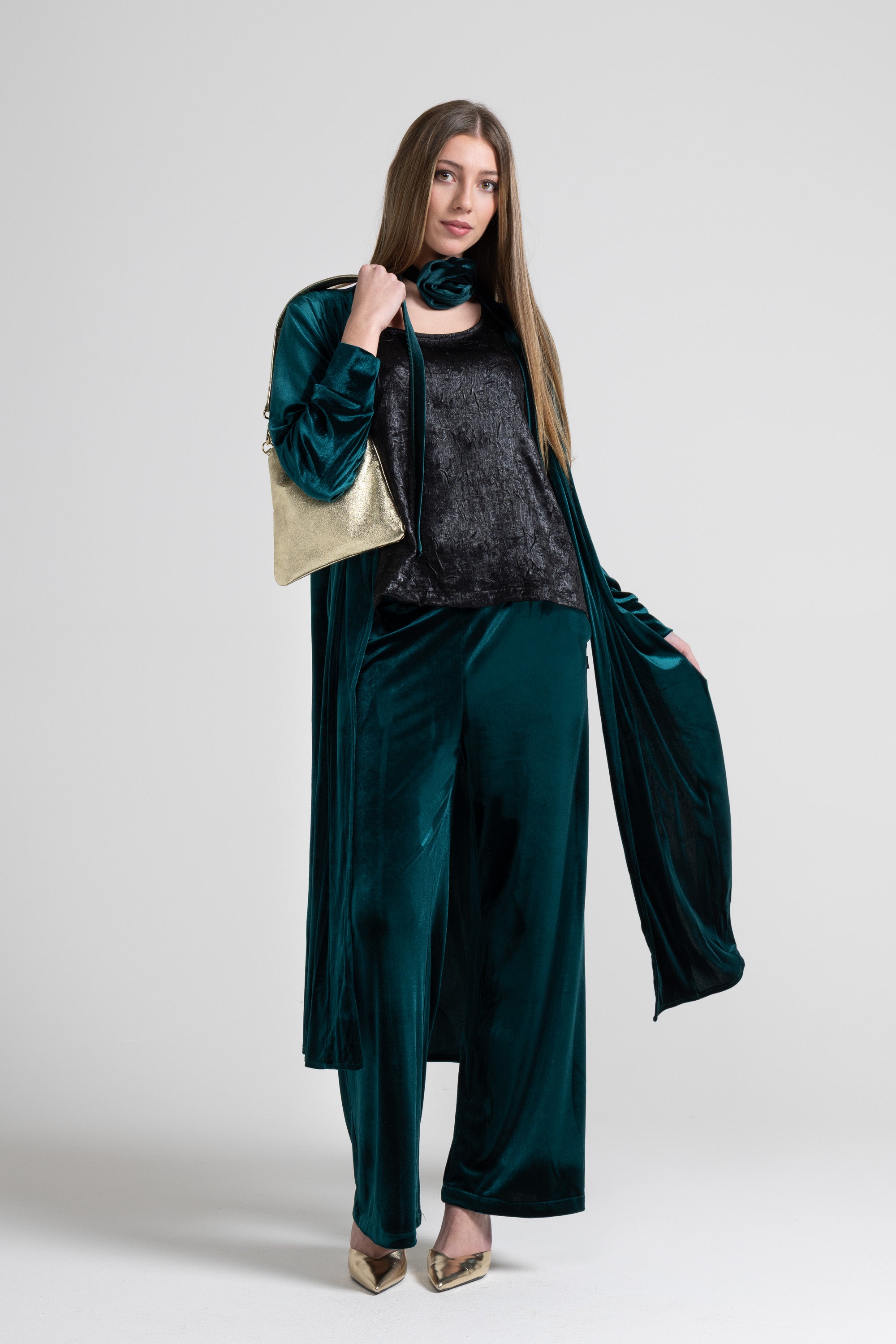 Soprabito lungo in morbido tessuto di velluto, raffinato e versatile, un modello elegante ma disinvolto, ideale per impreziosire qualsiasi outfit con un tocco di sofisticata luminosità.