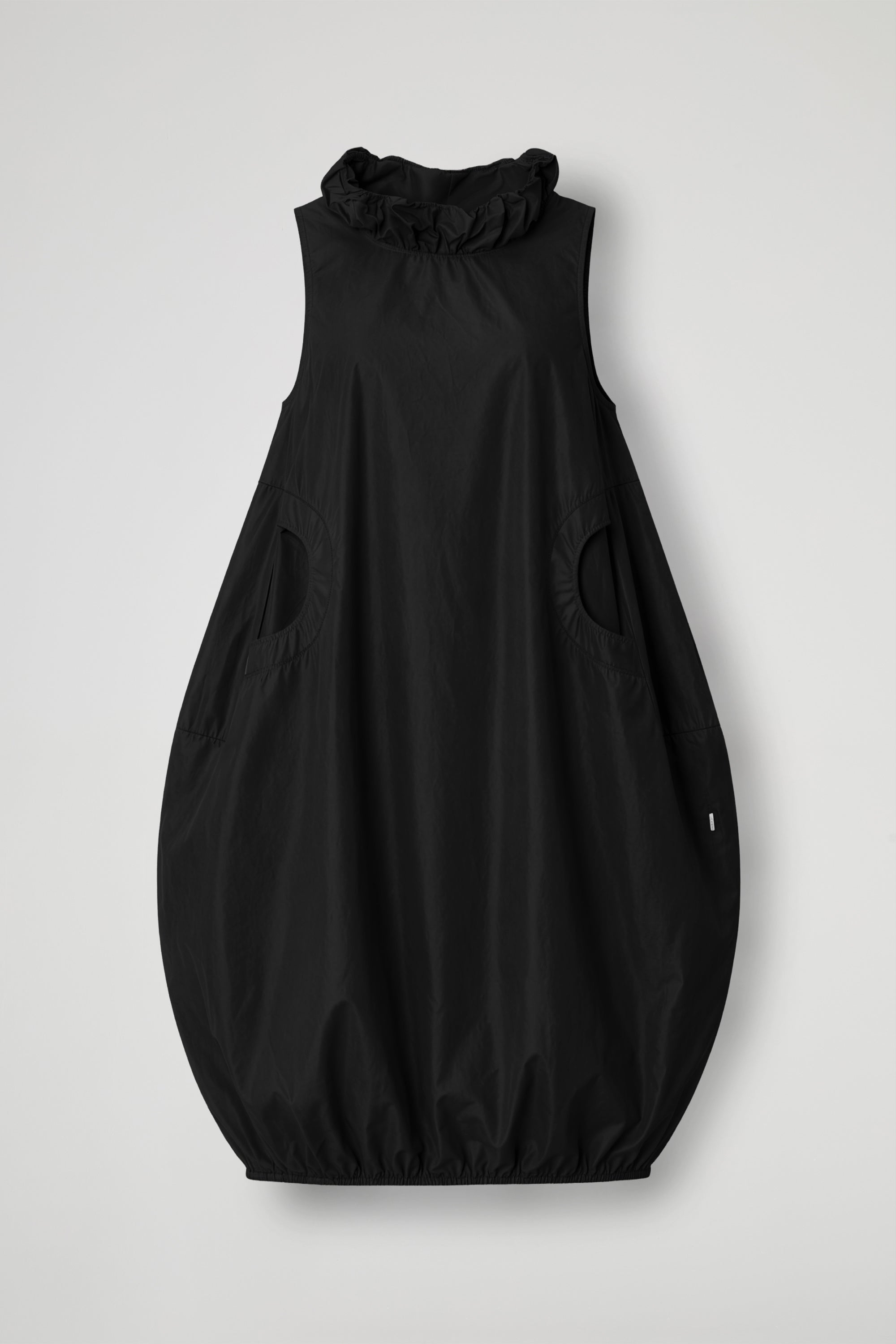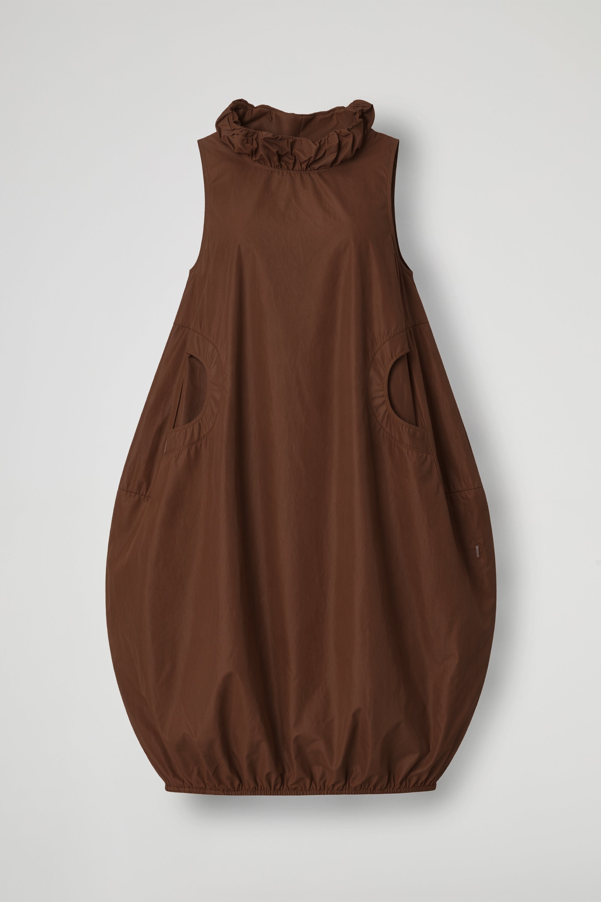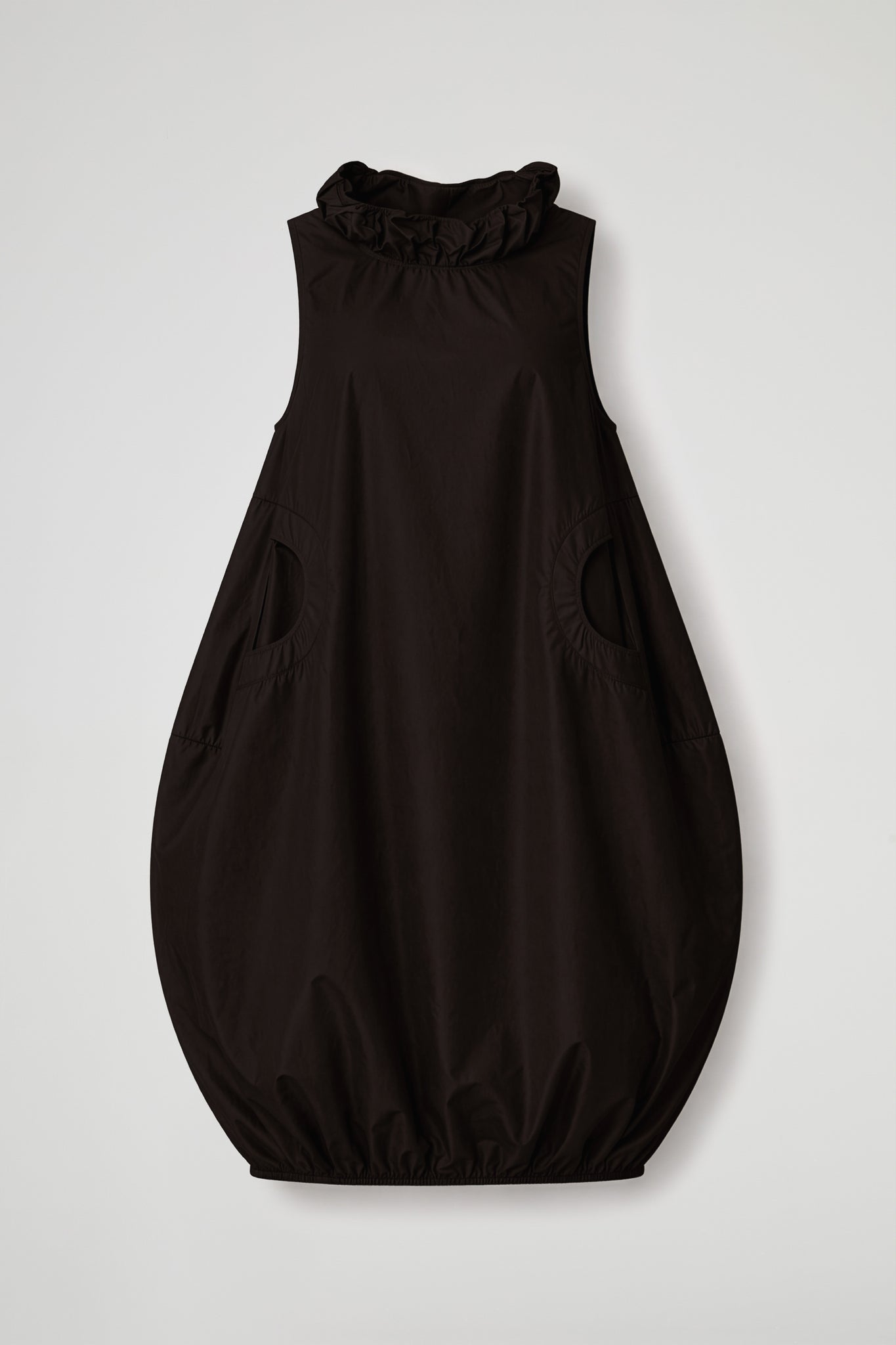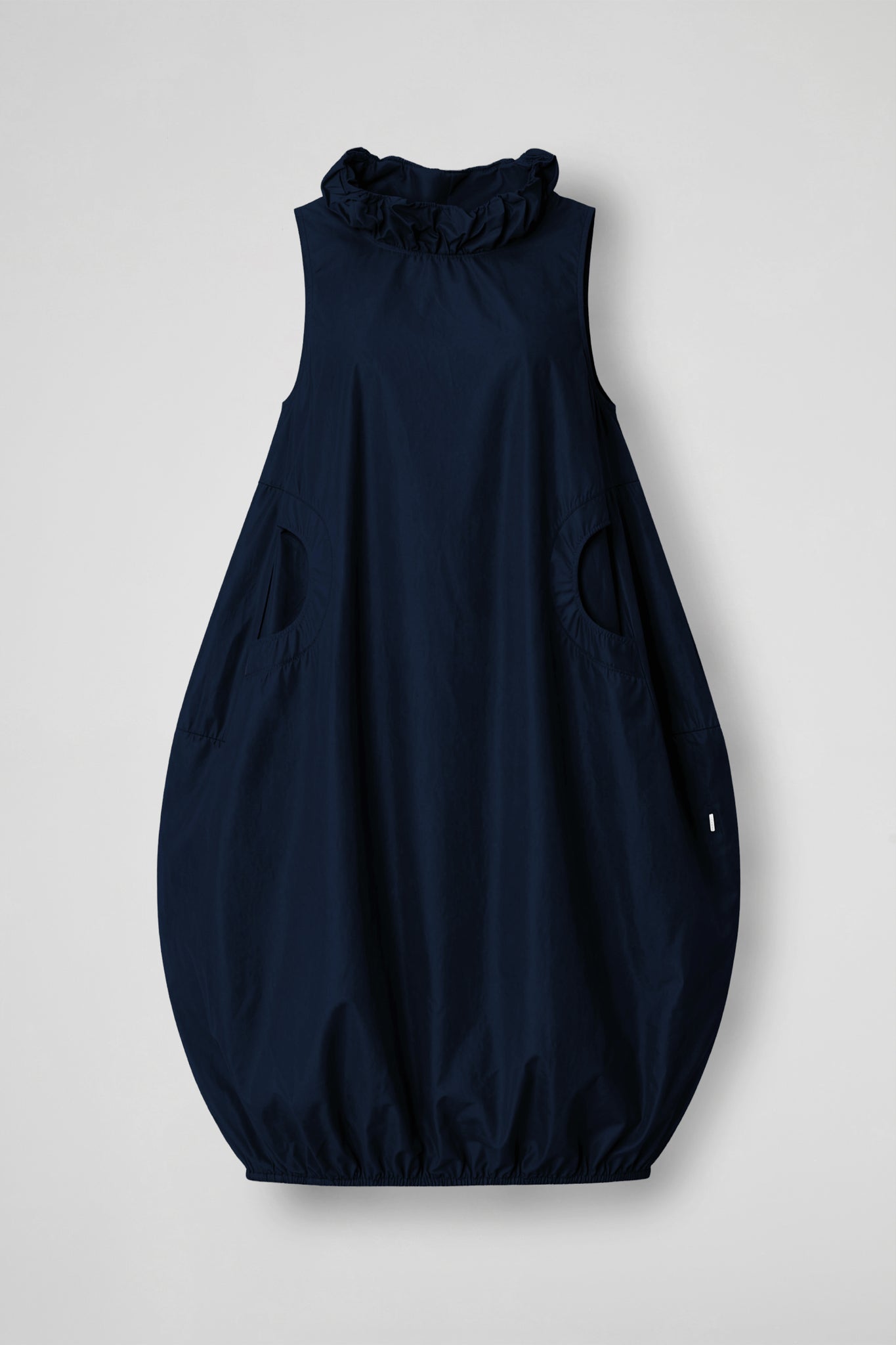 Abito lungo in tessuto tecnico effetto nacré, dal finish leggermente cangiante che dona luce e profondità; La linea è morbida e voluminosa, con costruzione “a uovo” che scivola sul corpo e si chiude in un fondo arricciato per un effetto balloon contemporaneo.