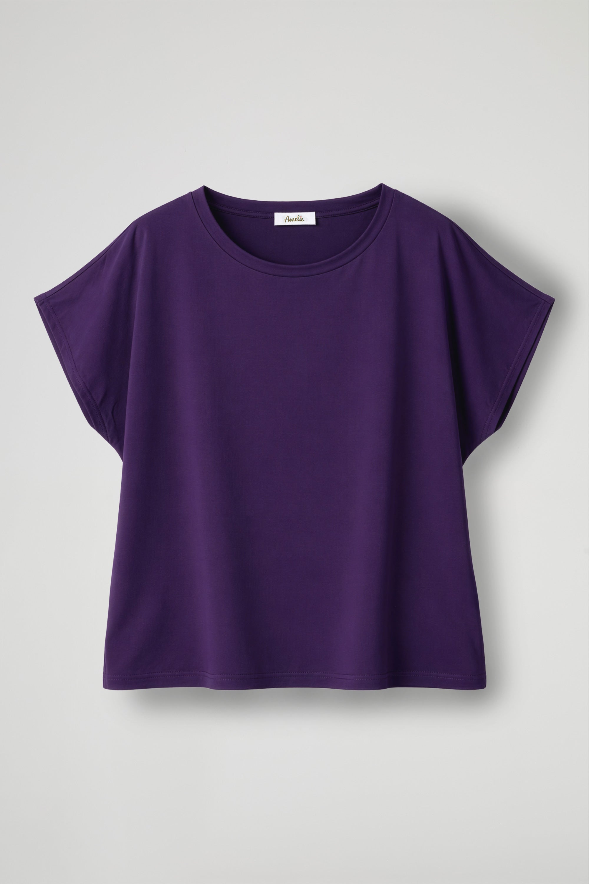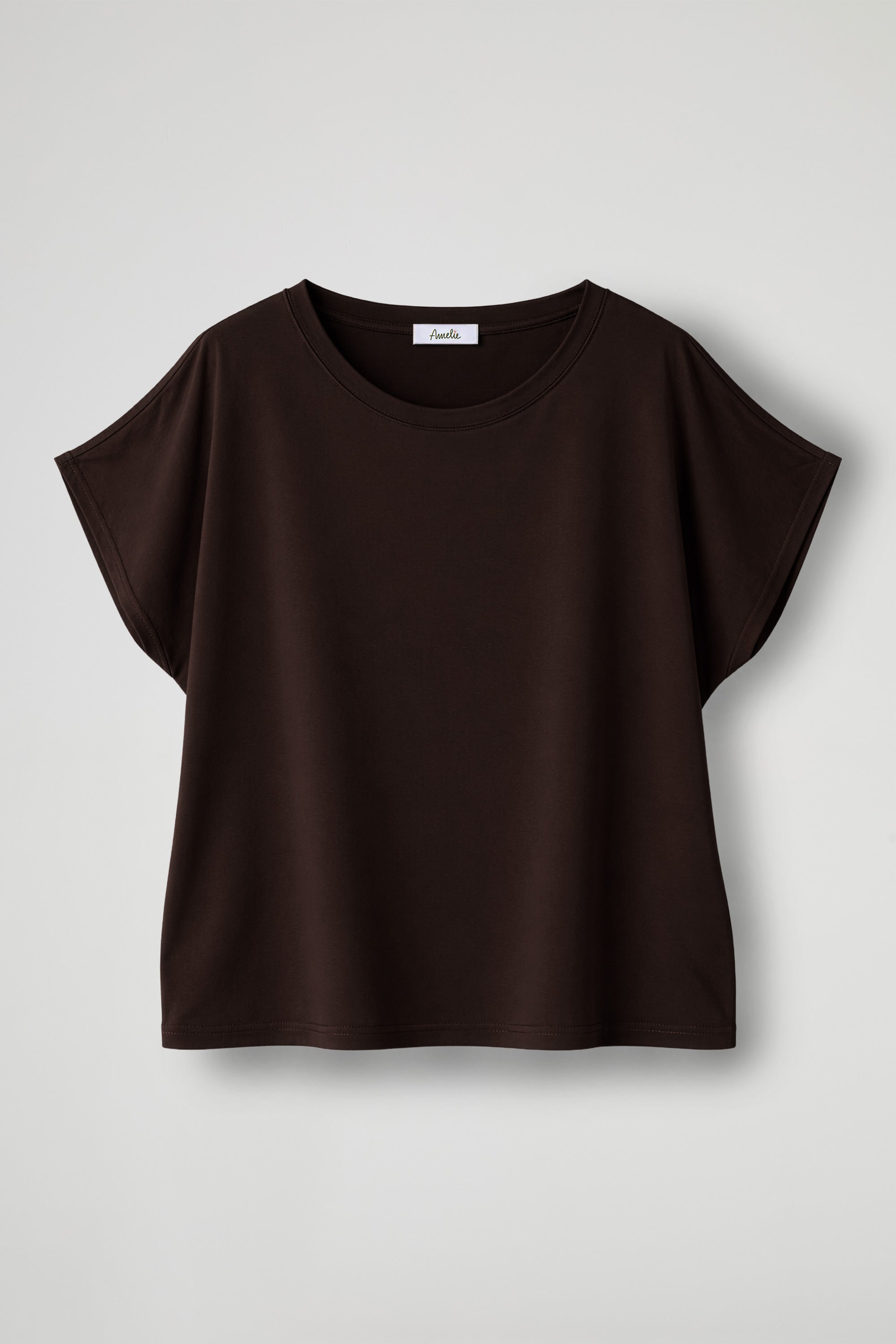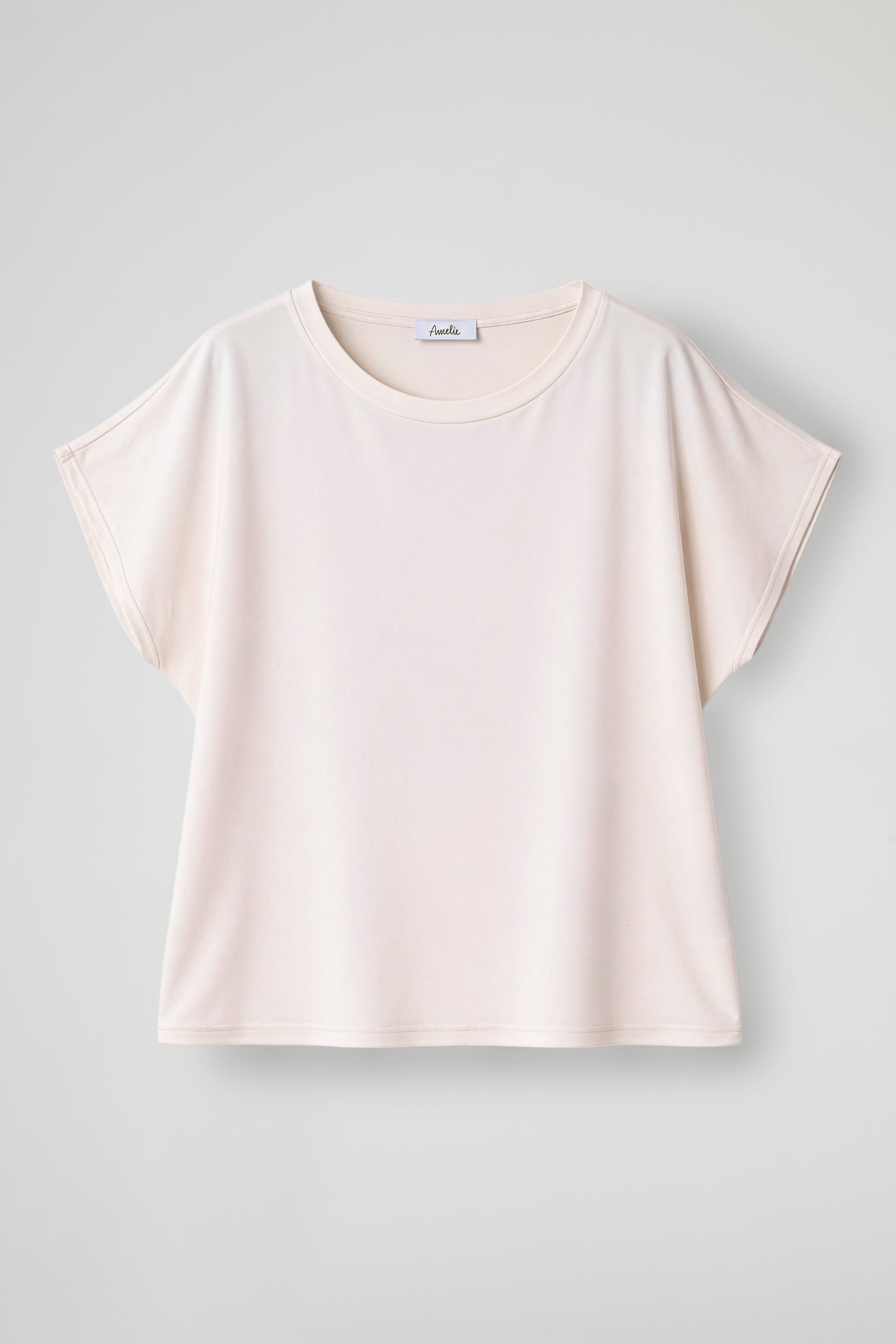 T-shirt con scollo rotondo rifinito, maniche corte con taglio ampio e spalla scesa. Fondo dritto;