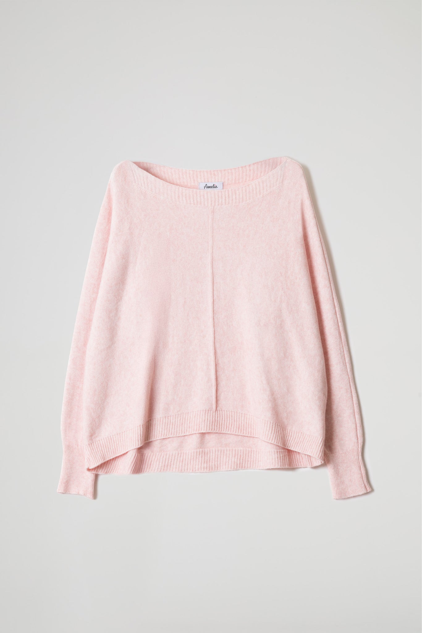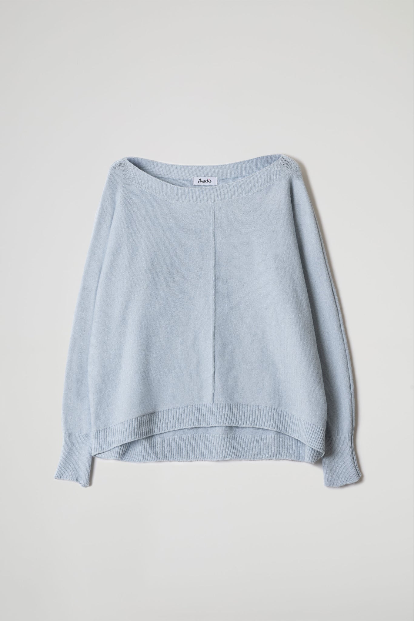 Maglia realizzata in morbida maglina di viscosa, girocollo ampio con lavorazione a coste che ne valorizza la struttura, spalle scesa, maniche lunghe con polsini a costine elasticizzate, dettaglio cucitura centrale , finitura a coste leggermente più ampia con retro lievemente più lungo, per una caduta fluida e armoniosa.