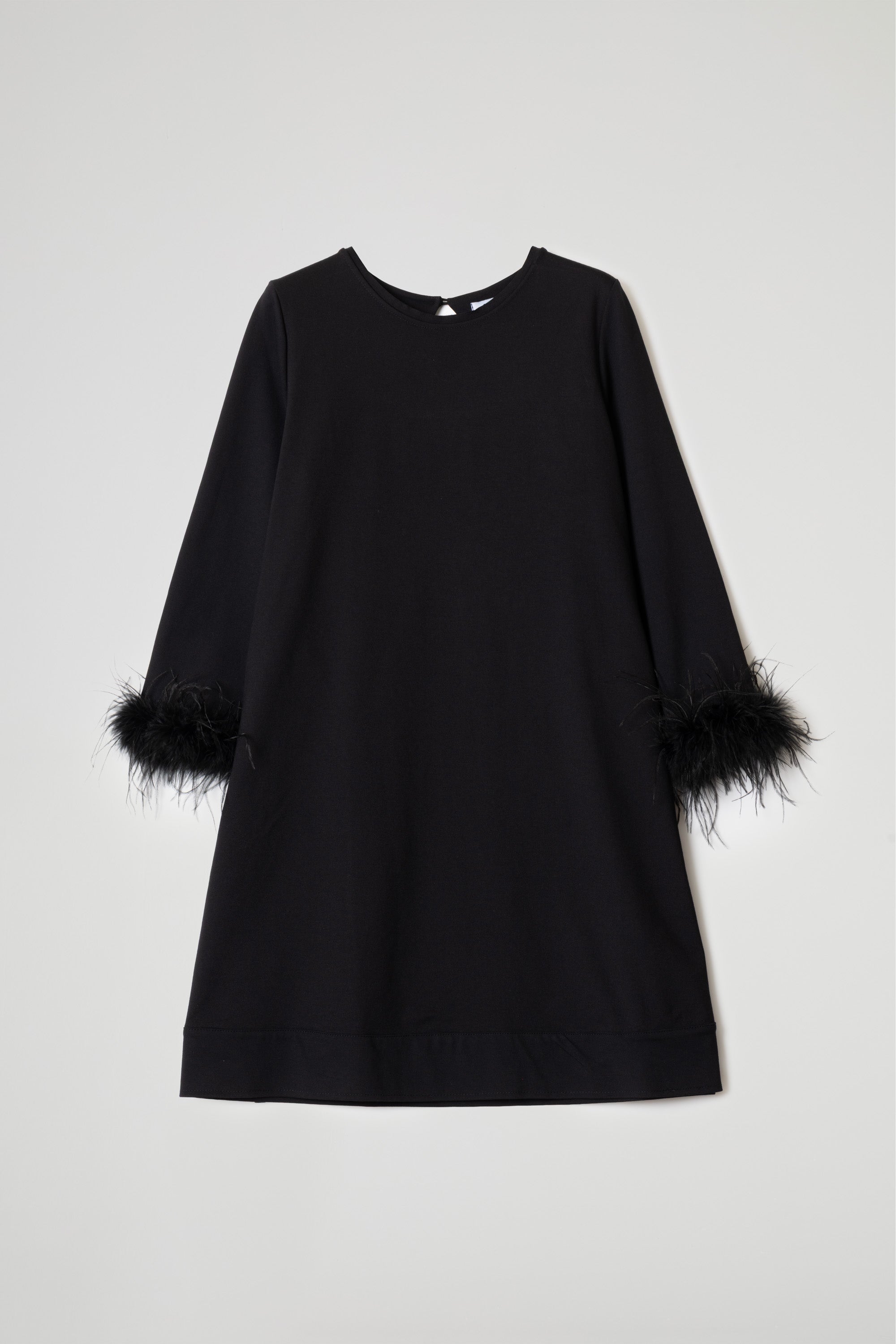 Midi dress, simple crew neck at the front, teardrop opening at the back closed with a small tone-on-tone button, three-quarter sleeves embellished with black feathers, welt pockets, slightly flared line towards the bottom with a high finished hem. Wide line
