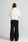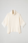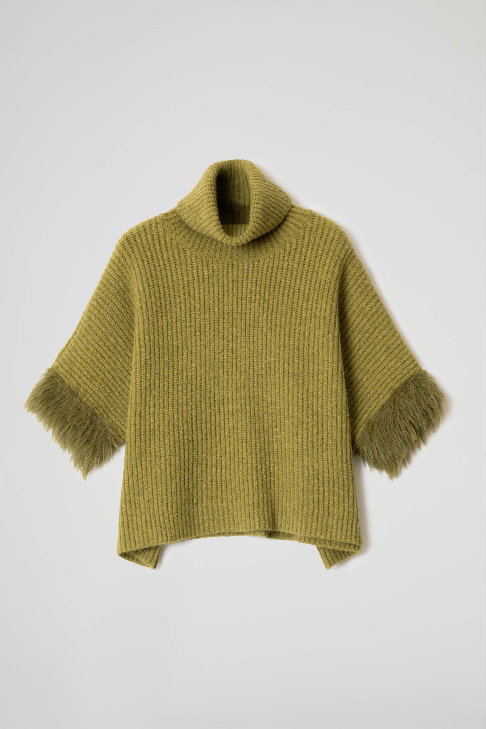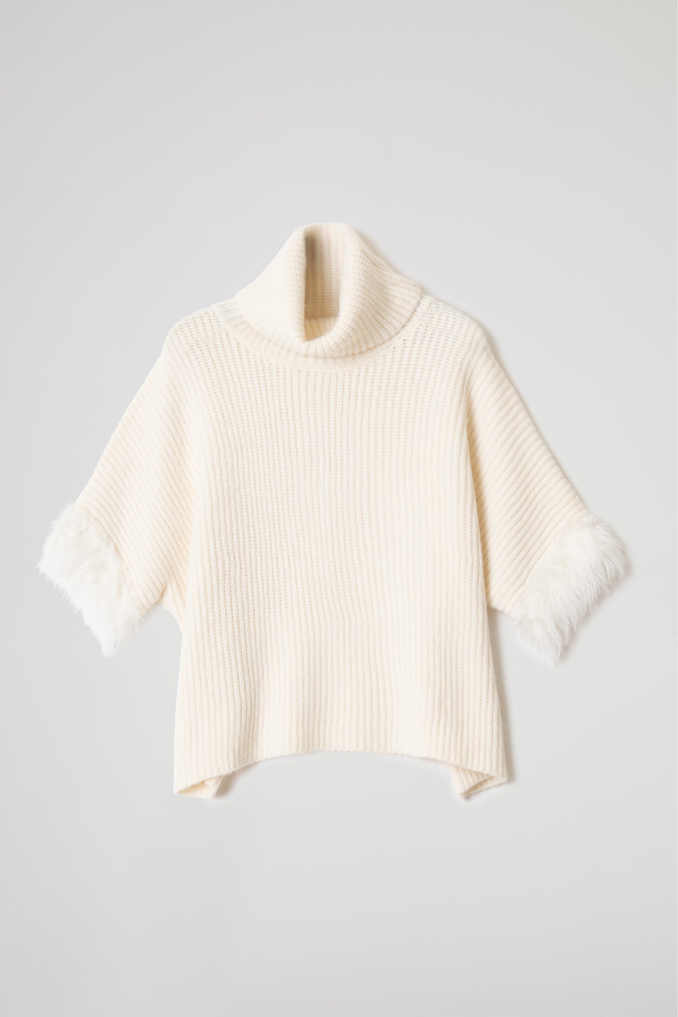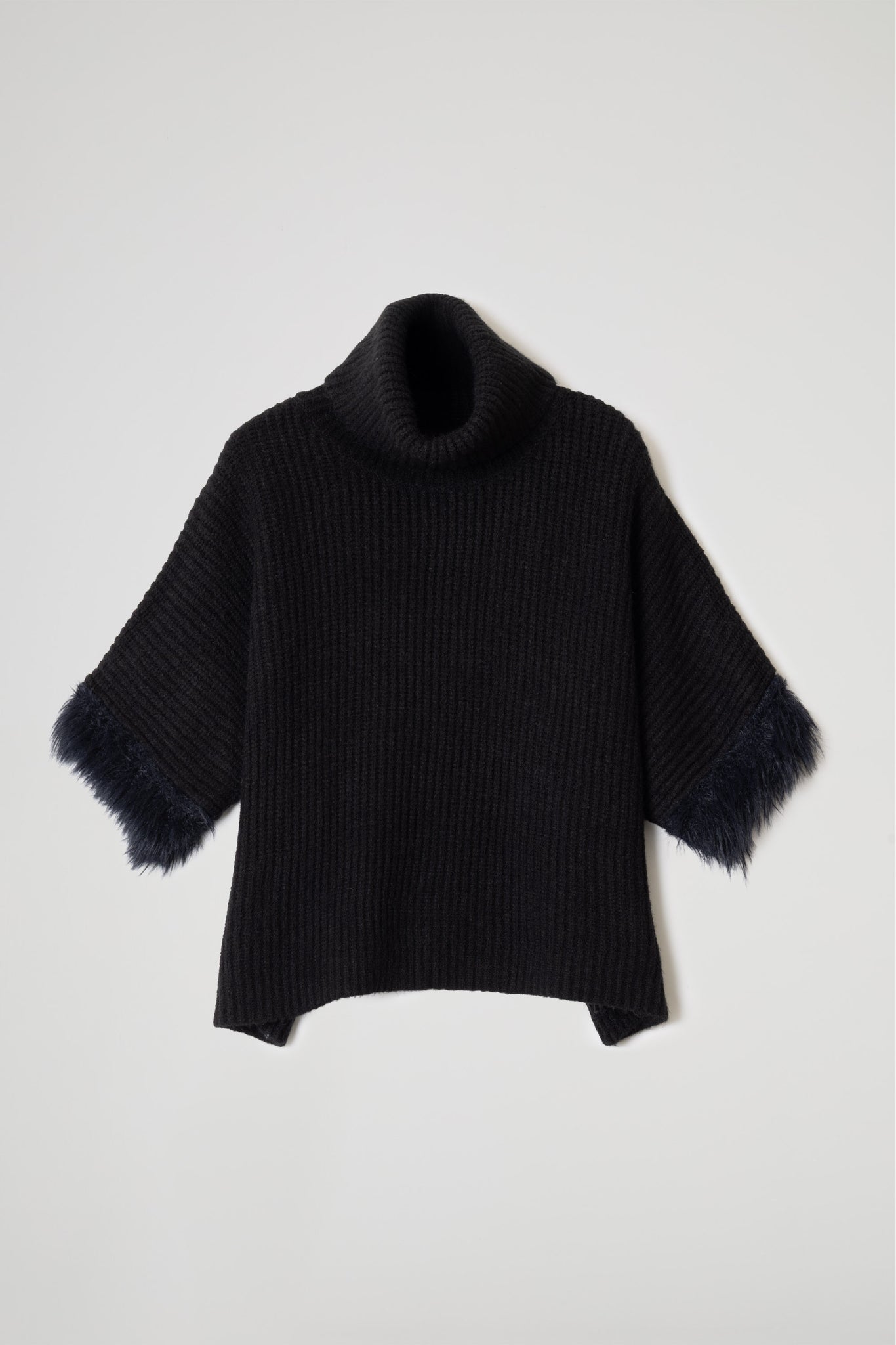 Ribbed turtleneck sweater, boxy fit, roll neck, dropped shoulders, 3/4 wide batwing sleeves enriched with faux fur insert. Wide fit