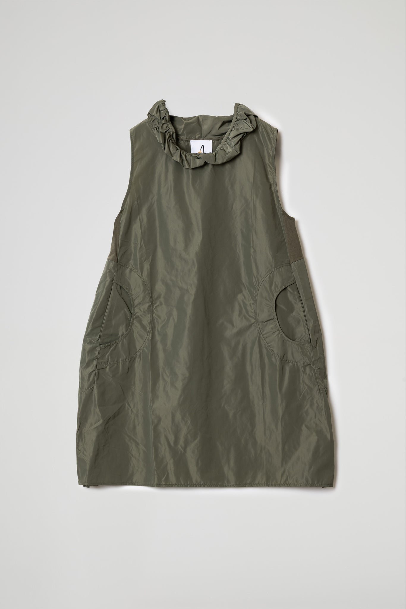 SHORT SLEEVELESS DRESS IN NACRE-EFFECT TAFFETA FABRIC, HIGH NECK WITH RUFFLES, WELT POCKETS, PORTHOLE DETAIL ON THE HIPS, VISCOSE KNITTED DETAIL ON THE ARMHOLES TO ALLOW FOR A MORE COMFORTABLE FIT. WIDE AND COMFORTABLE LINE