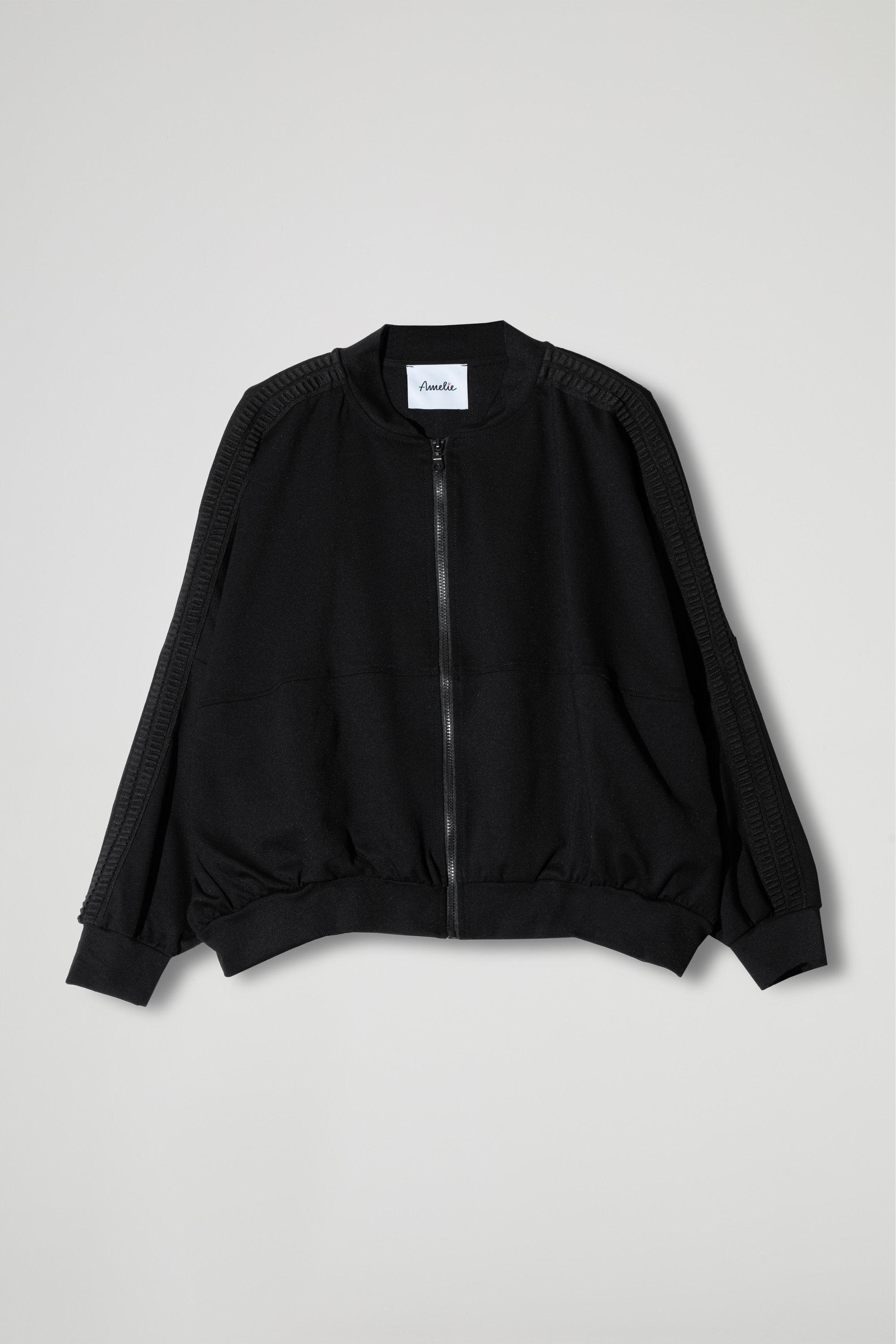 BOMBER JACKET IN MILAN STITCH IN VISCOSE, CENTRAL FOLDED CUT DETAIL, LONG SLEEVES, HIGH FOLDED CUFFS AND BOTTOM, PASSMANDER DETAIL ALONG THE LENGTH OF THE SLEEVE.
