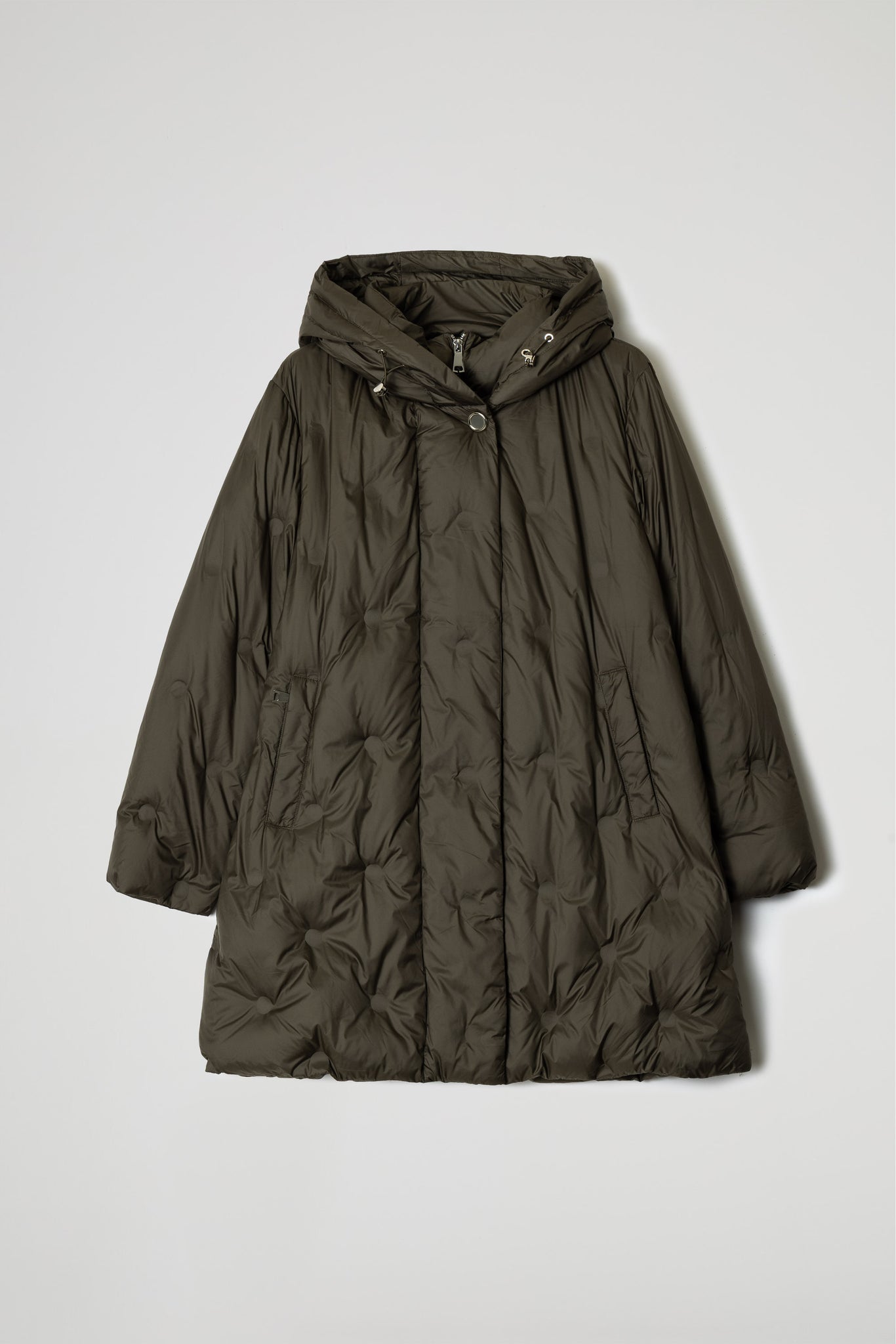 Long oversized down jacket featuring a soft, enveloping line, the circular stitch quilting throughout the garment offers a modern style, the slightly flared line at the bottom allows for greater freedom of movement.