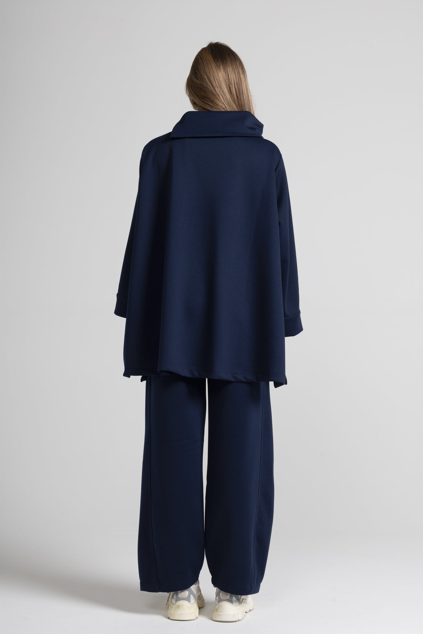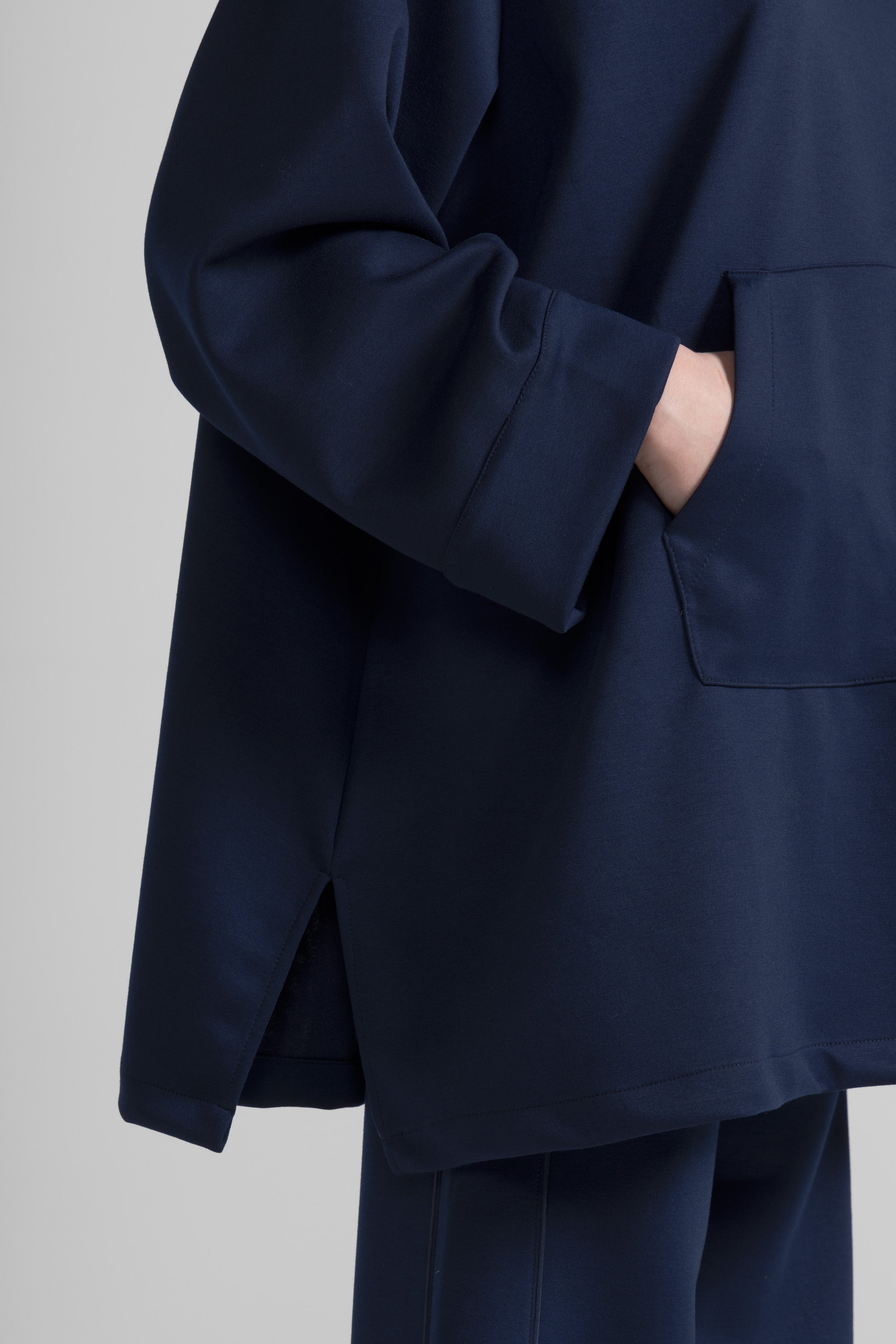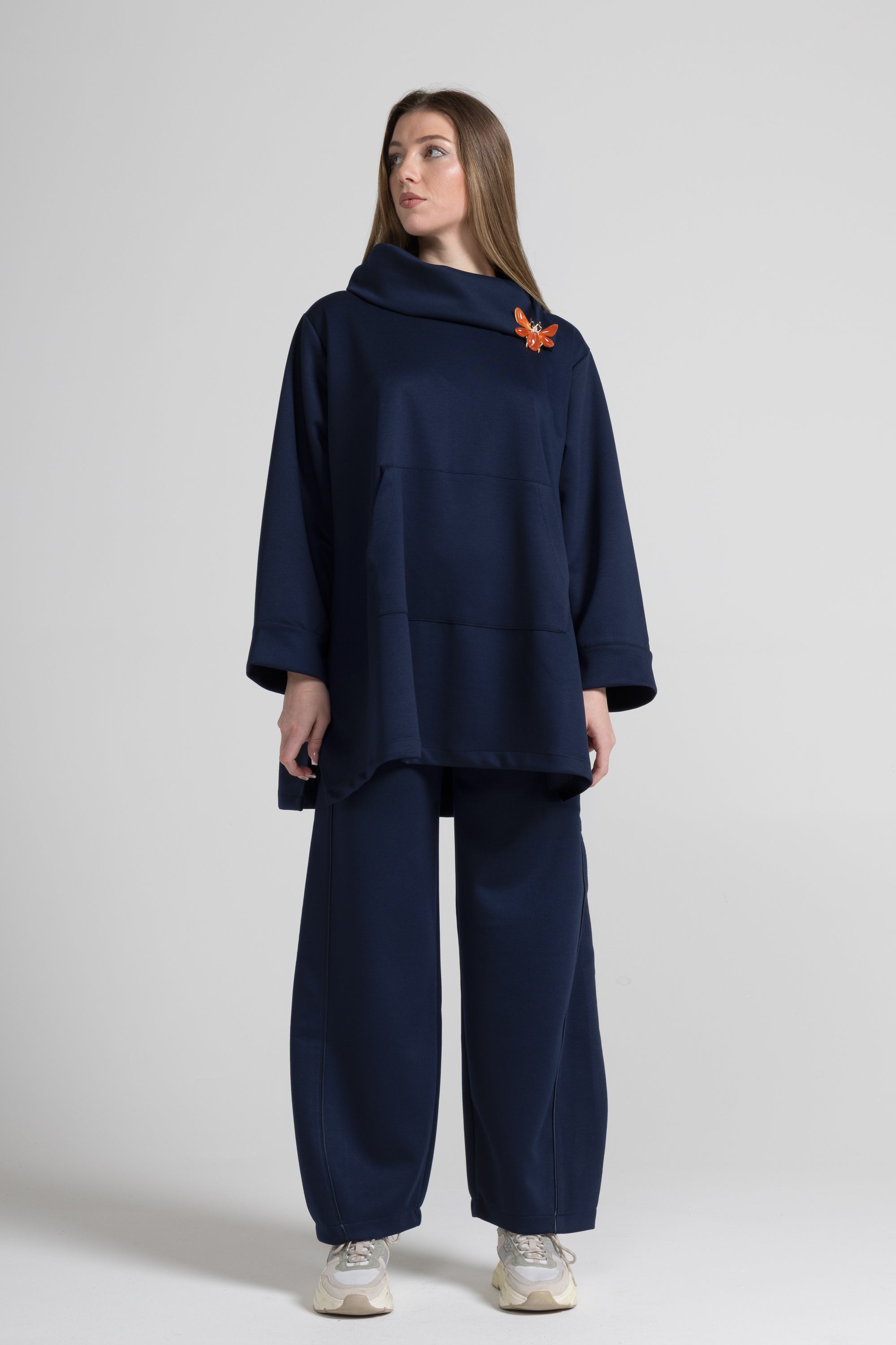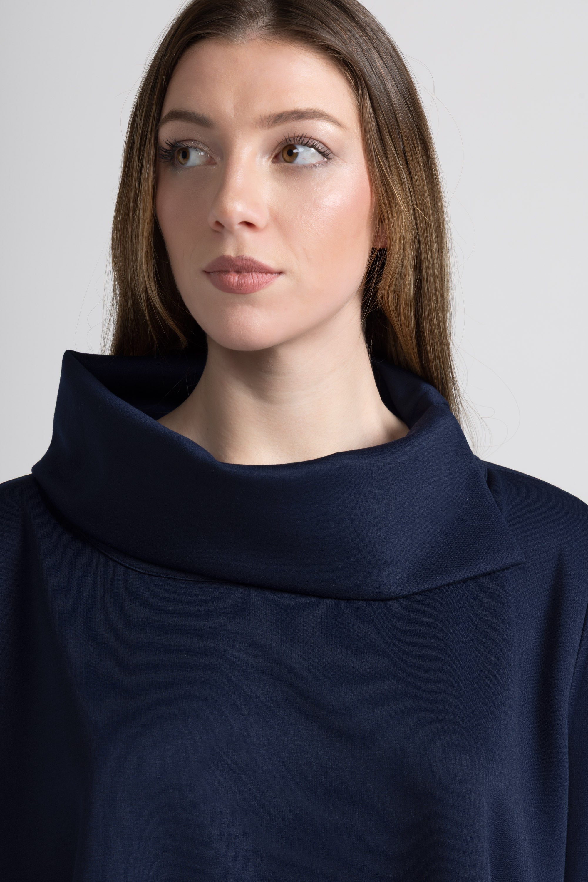 Felpa a trapezio, collo alto drappeggiato con spacchetto laterale, manica lunga con risvolto sul fondo, maxi tasca a marsupio frontale, spacchetti sul fondo. Linea ampia