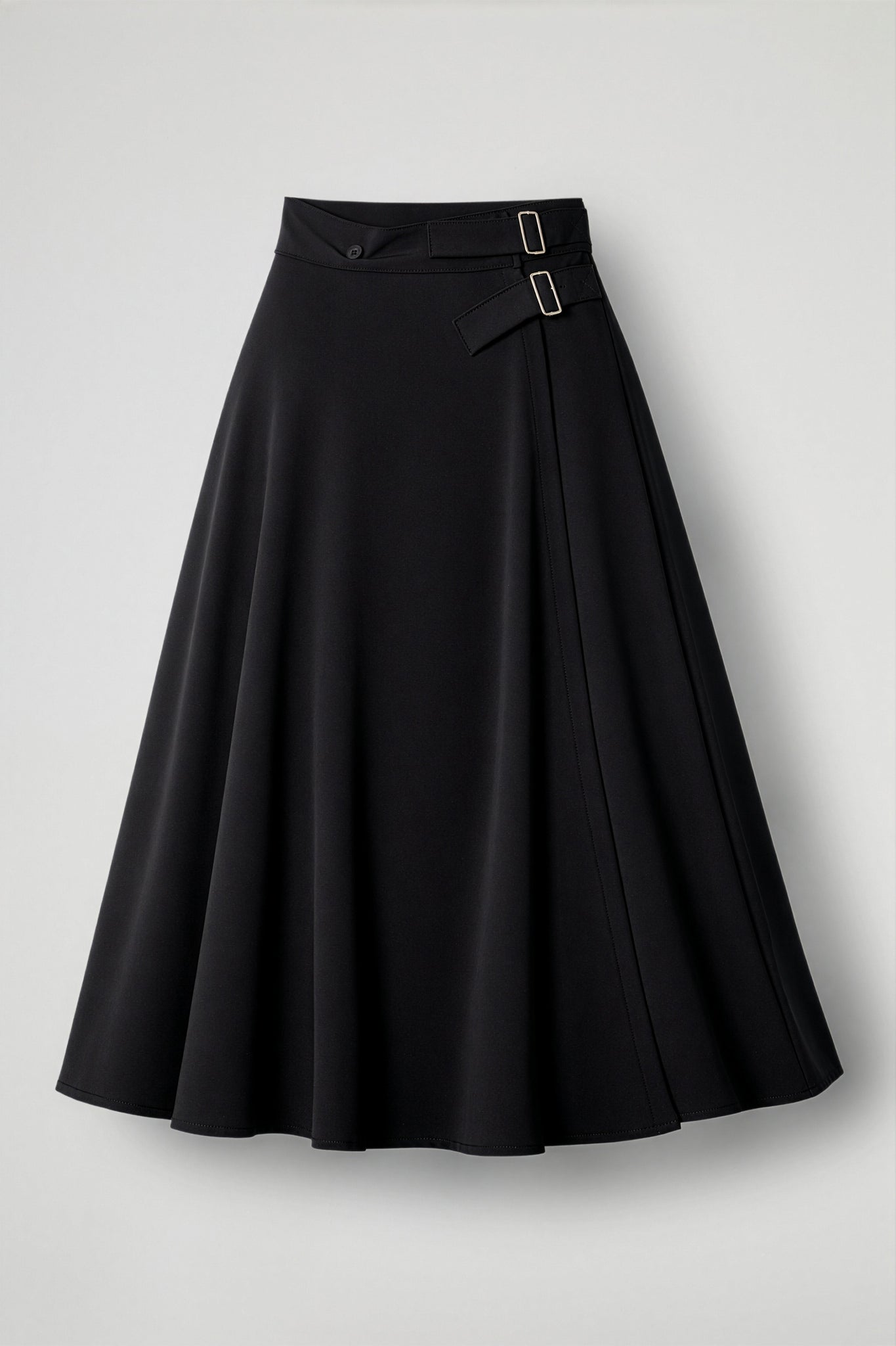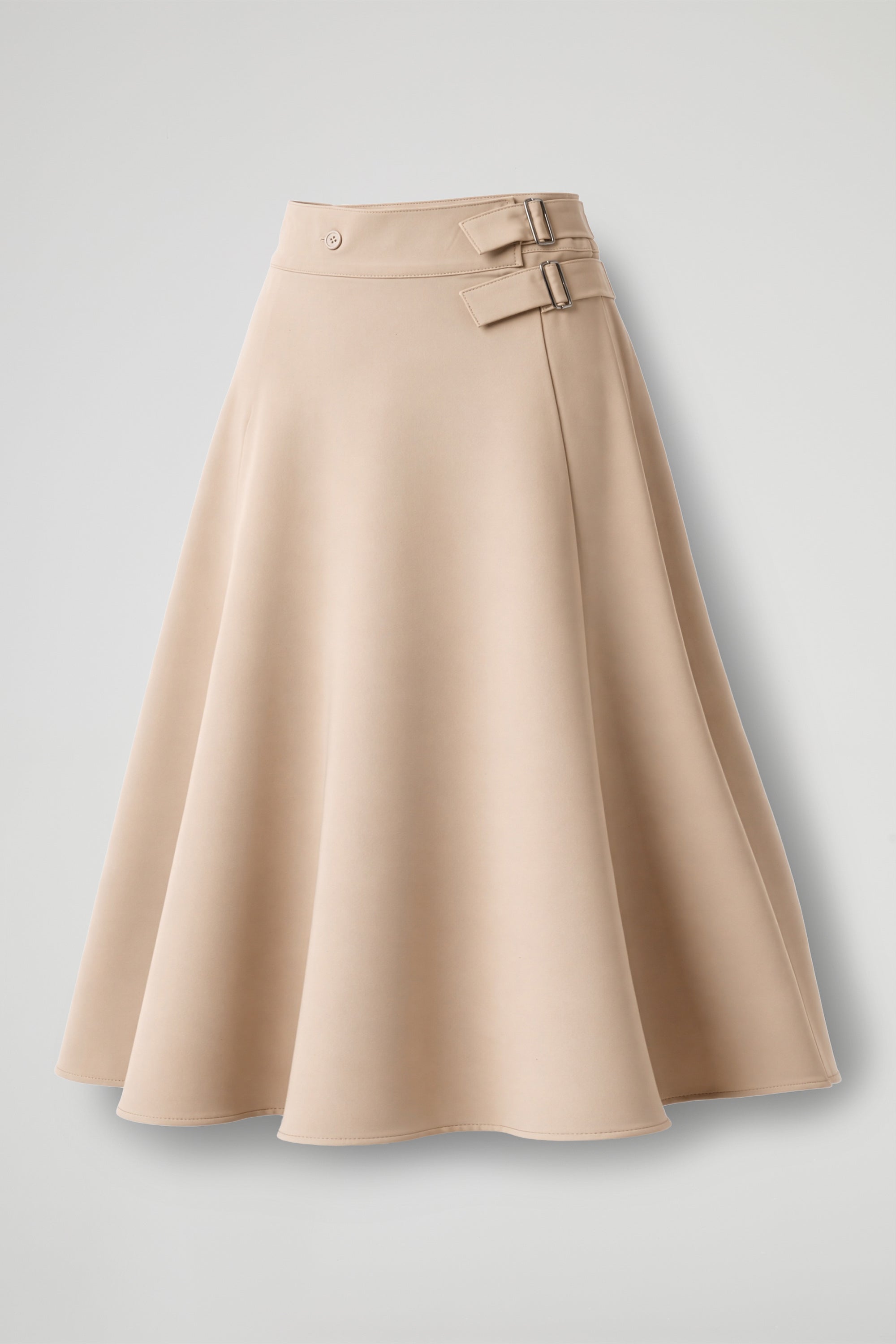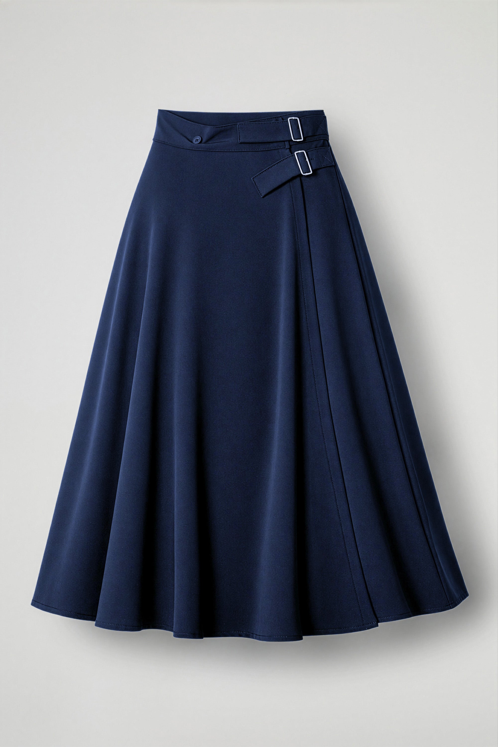 Midi skirt in flowing fabric, flared fit, structured waist with decorative buckled straps, and welt pockets. Comfortable fit.