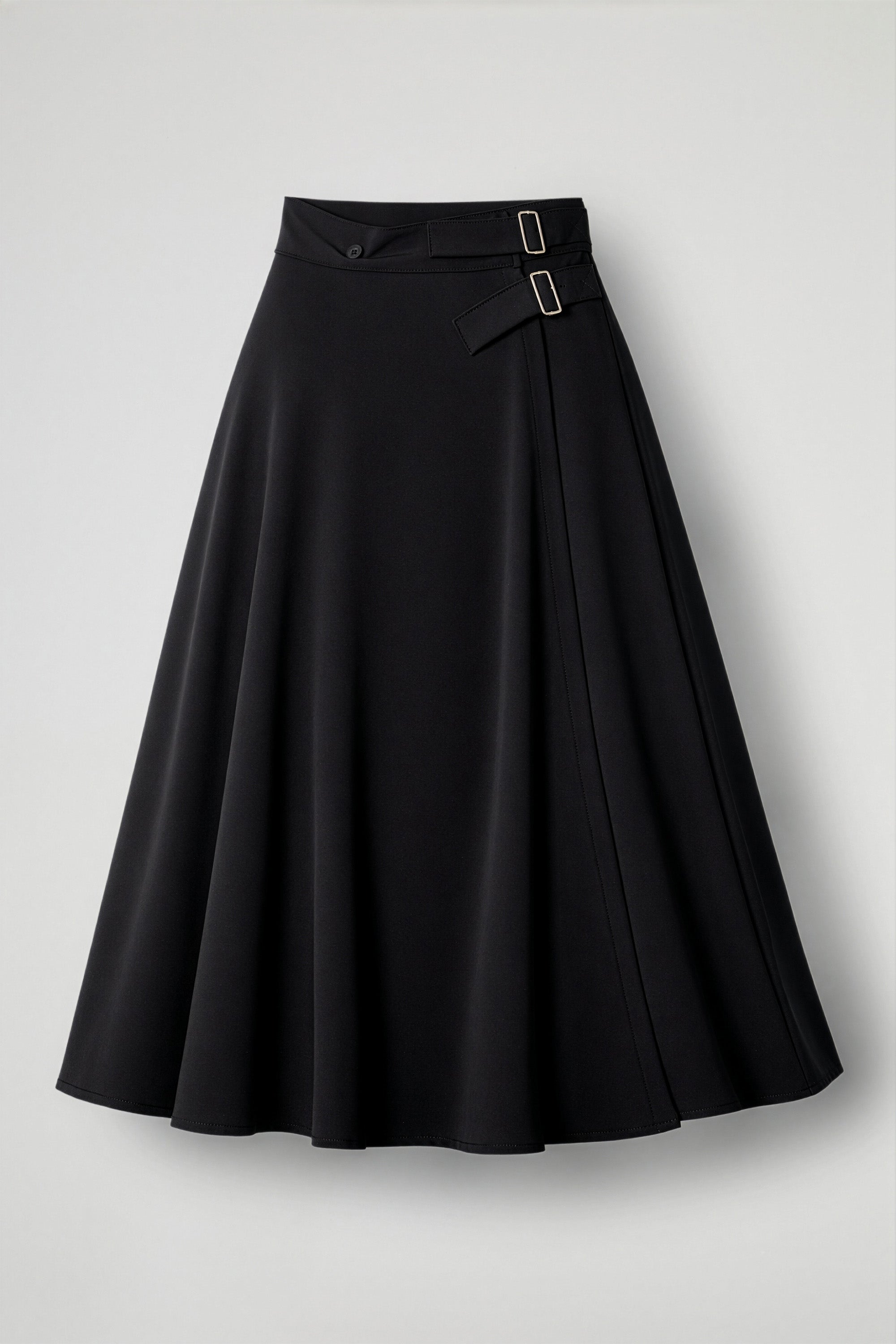 Midi skirt, crafted from soft, flowing fabric , that flows lightly with your step, creating a refined and feminine effect. The wide, flared line gives harmony to the figure, while the asymmetrical waist and decorative straps with metal buckles add a distinctive and trendy detail, making the garment unique and modern. The waist is structured to ensure a comfortable and well-defined fit.