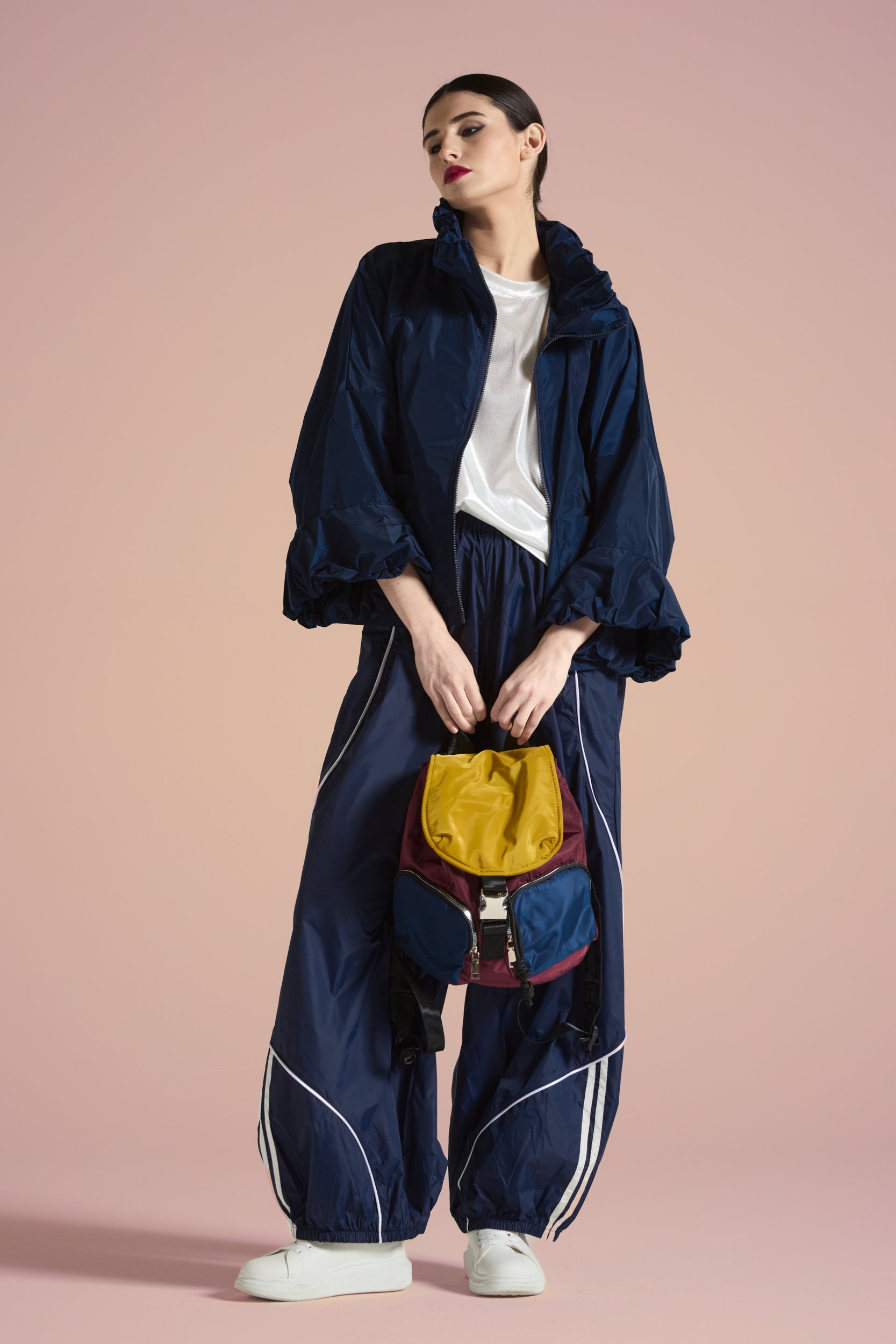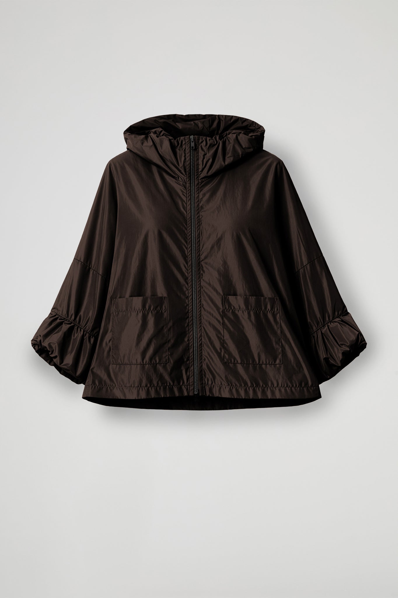 Giacca in tessuto tecnico effetto nacrè, collo alto arricciato, spalle scese con manica ampia e dettaglio arricciatura sul fondo, chiusura frontale con zip nera, due tasche applicate sul davanti. Linea ampia