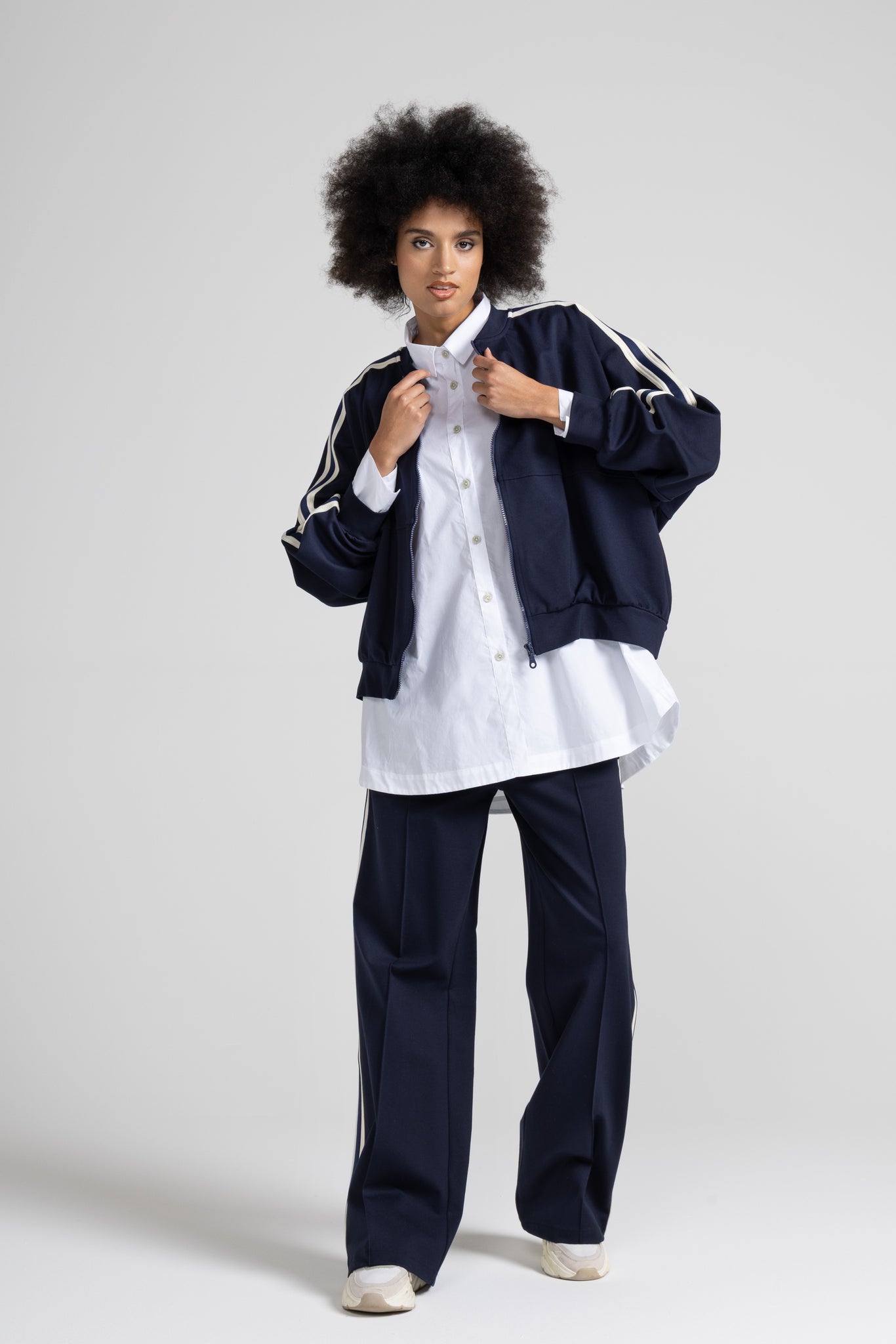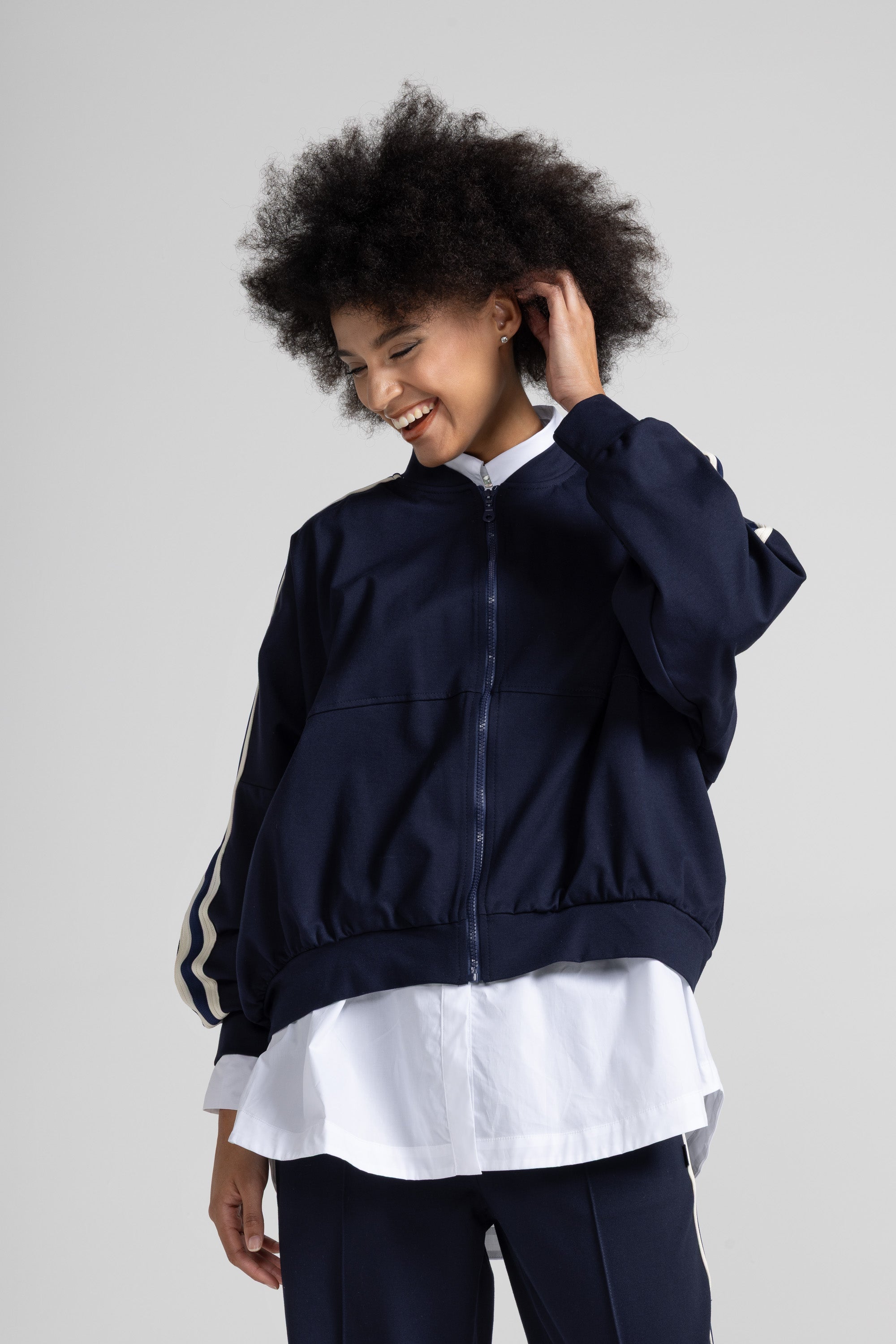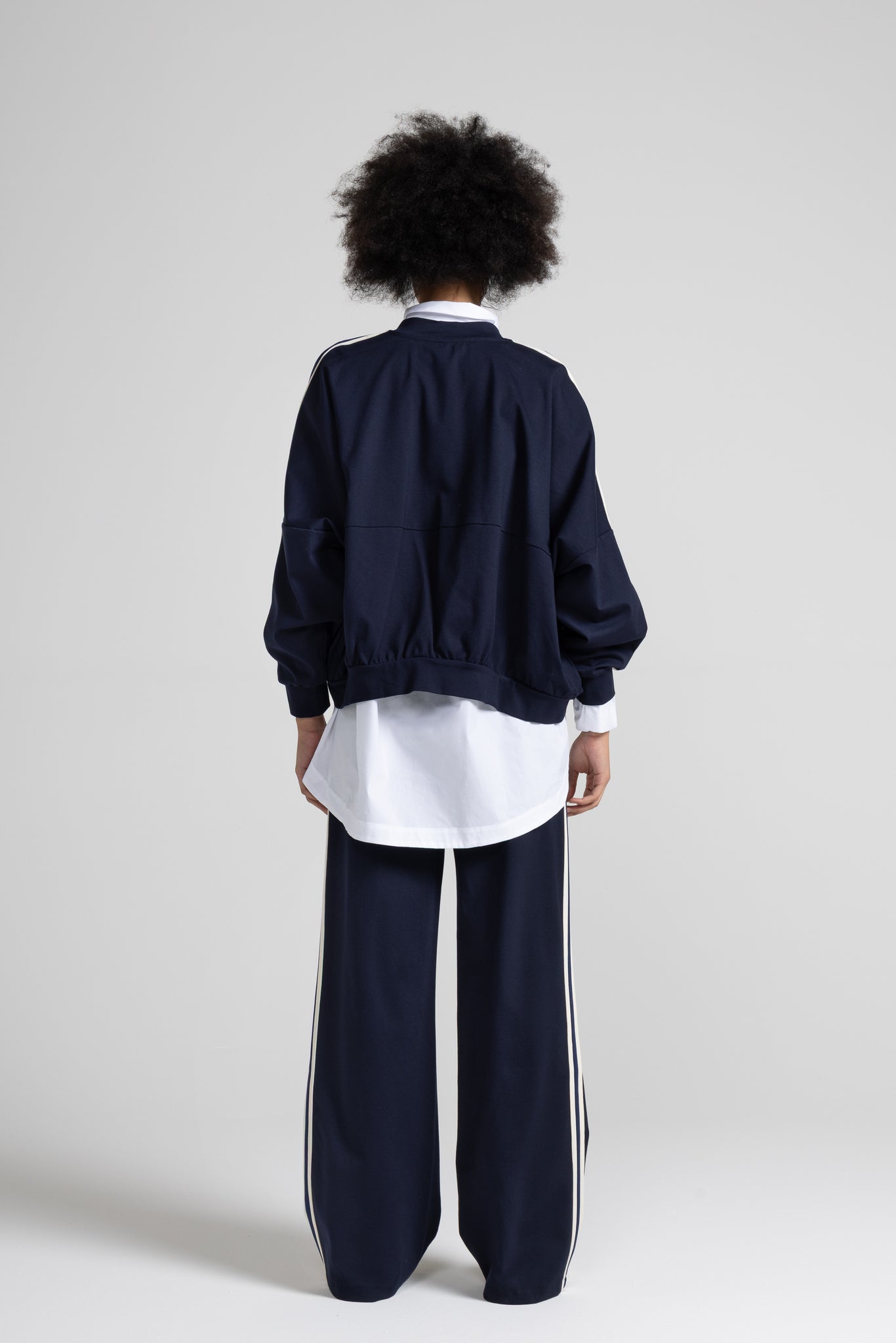 BOMBER JACKET IN MILAN STITCH IN VISCOSE, CENTRAL FOLDED CUT DETAIL, LONG SLEEVES, HIGH FOLDED CUFFS AND BOTTOM, PASSMANDER DETAIL ALONG THE LENGTH OF THE SLEEVE.