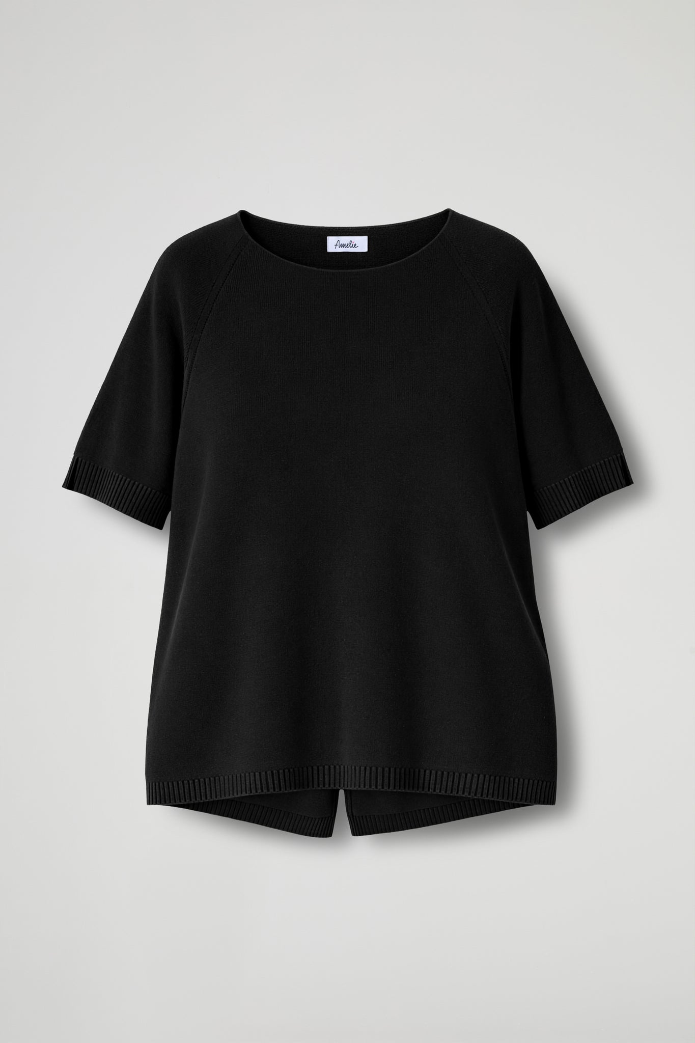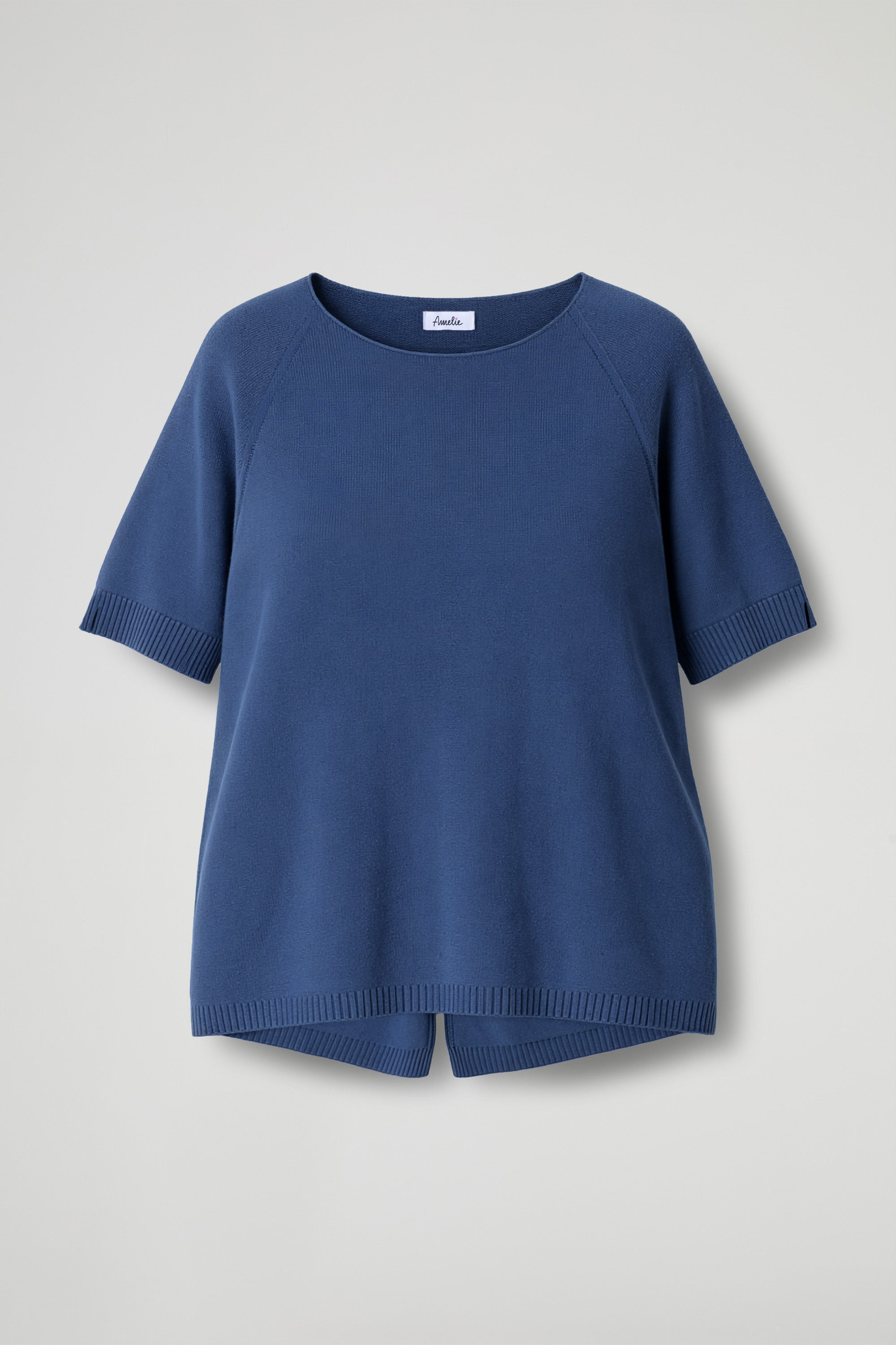 Asymmetrical oversized sweater in soft viscose jersey, wide neckline, short raglan sleeves with ribbed detail at the bottom, central slit at the back, ribbed hem. Loose fit.