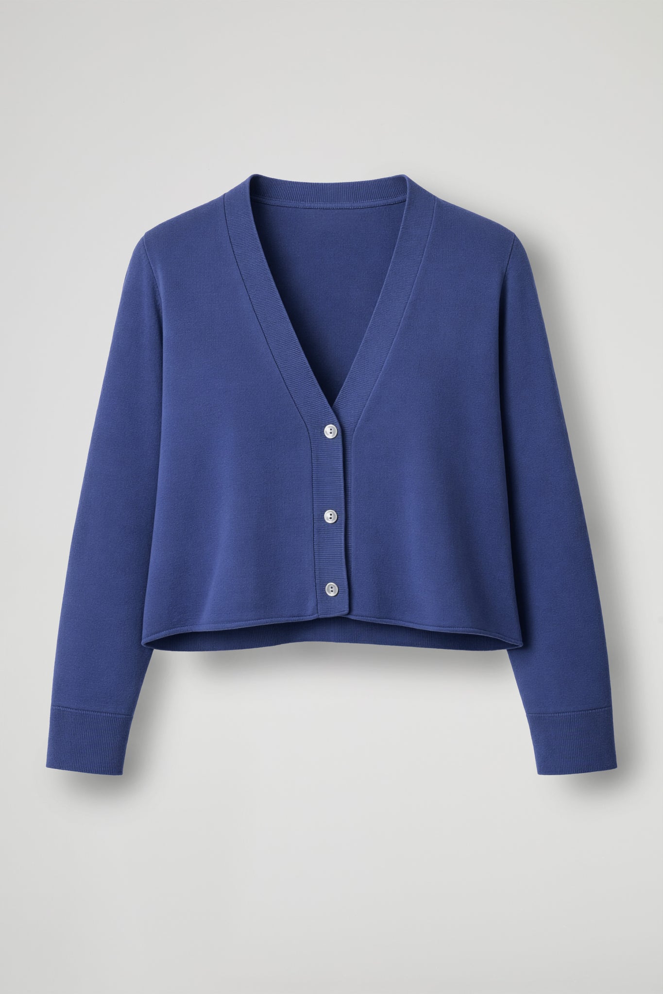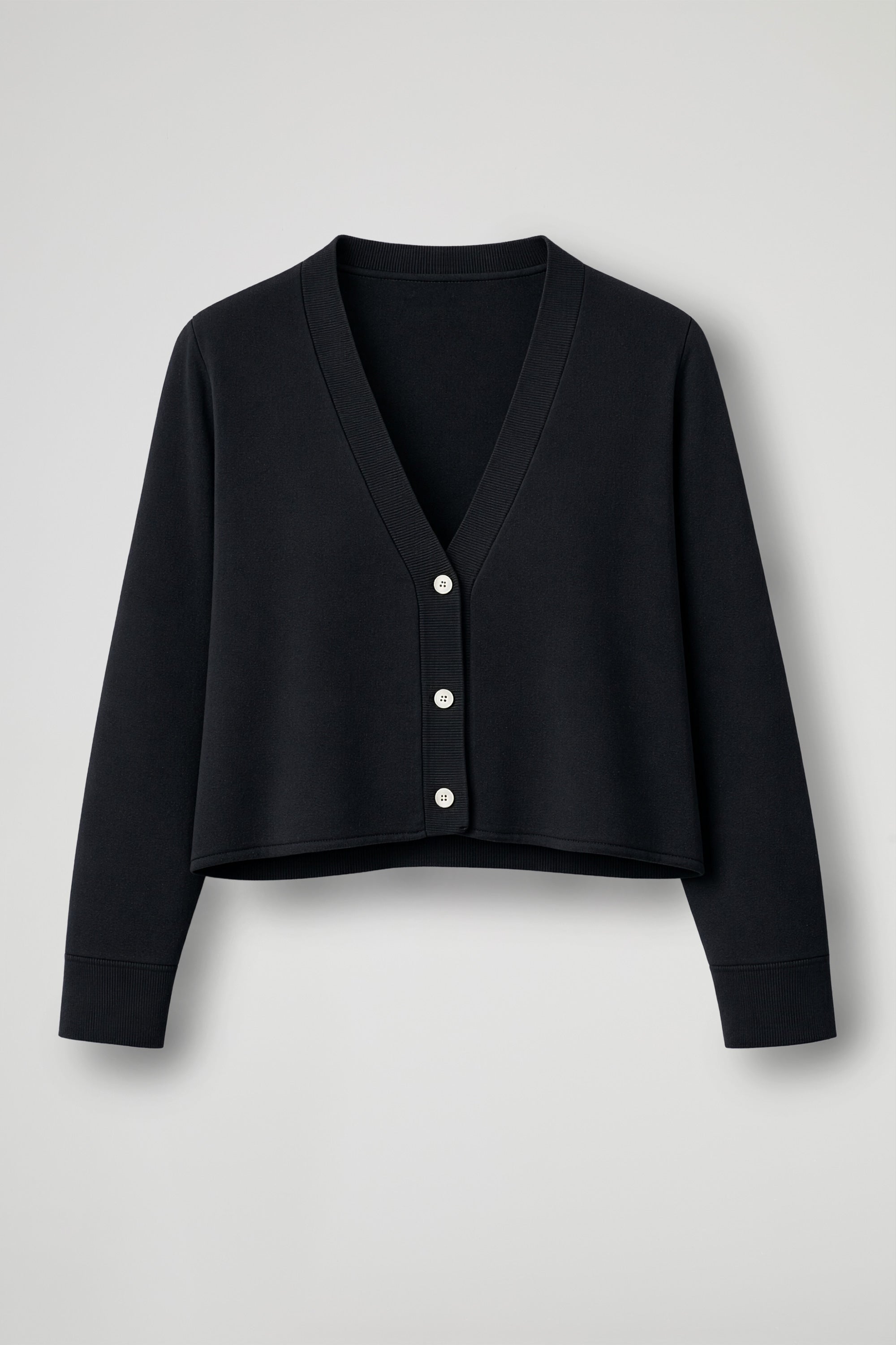 Asymmetrical boxy cardigan in soft viscose jersey, dropped shoulders, long sleeves with high cuff detail, v-neck with ribbed detail, front opening with mother-of-pearl buttons, raw cut hem.