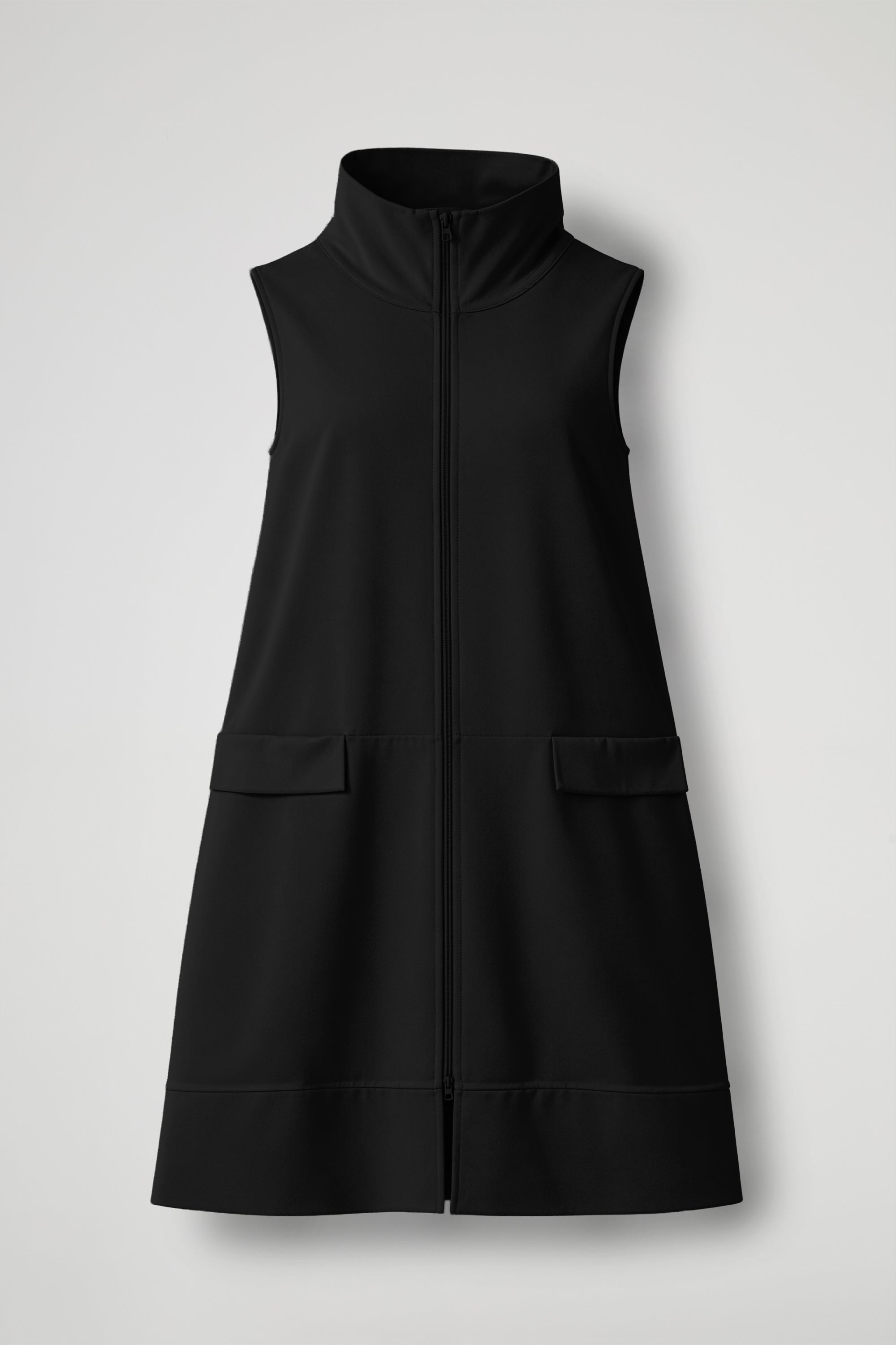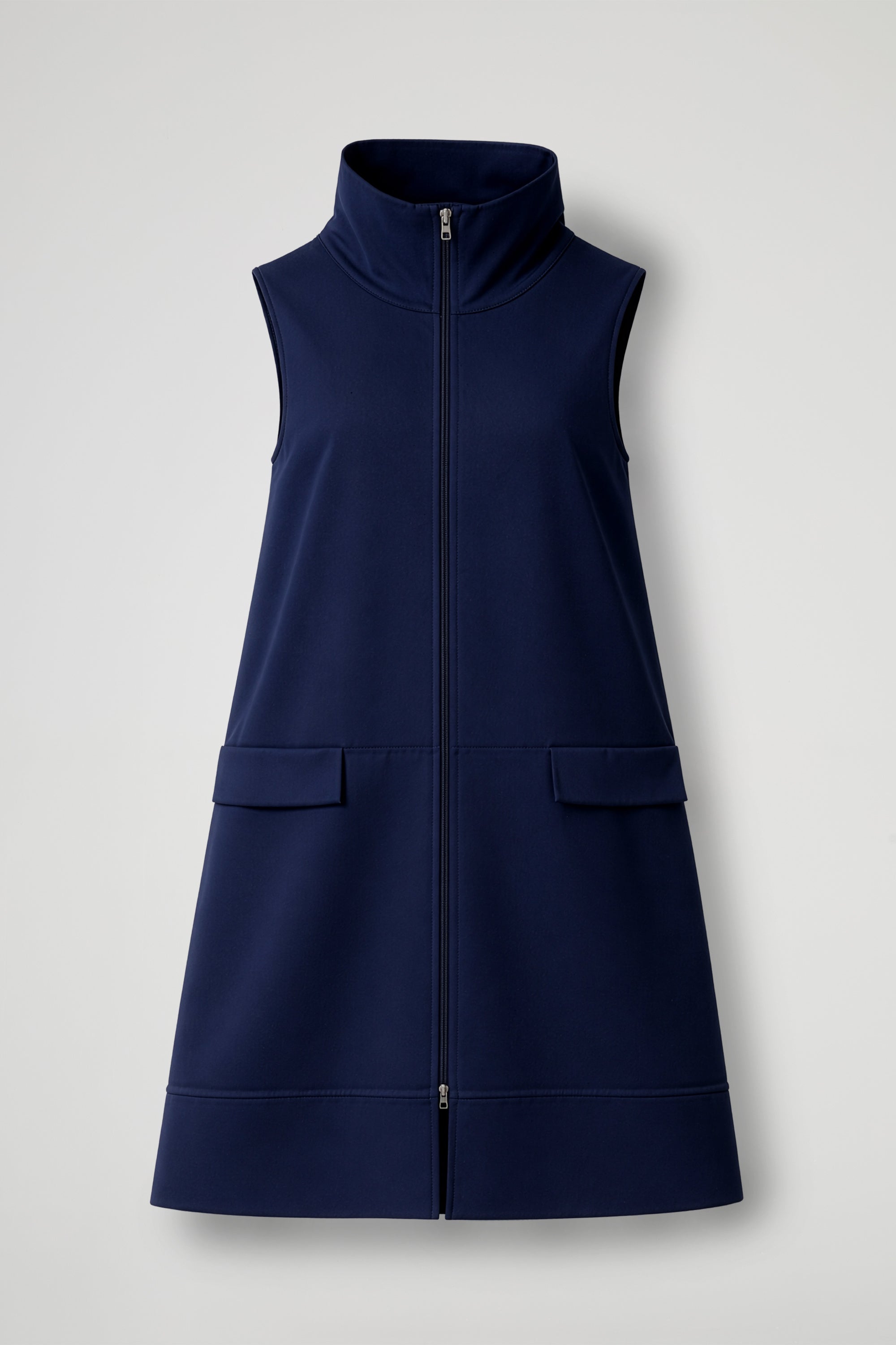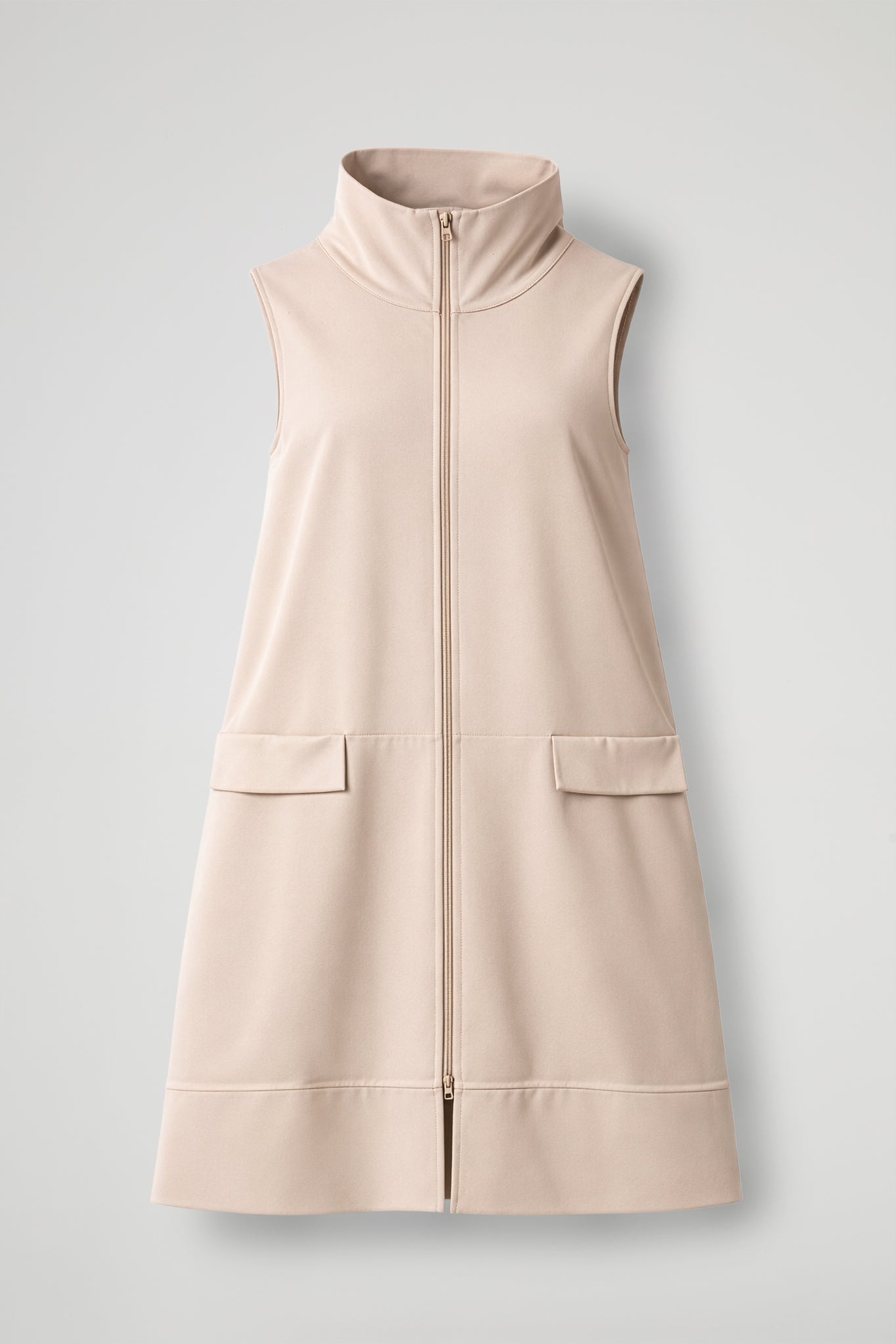 LONG SLEEVELESS DUSTER COAT IN MILAN STITCH VISCOSE FABRIC, WIDE COWL NECK, TONE-ON-TONE ZIP, SLIT POCKETS WITH REVERSE FLAP, HIGH FOLDED HEM. TRAPEZE SHAPE