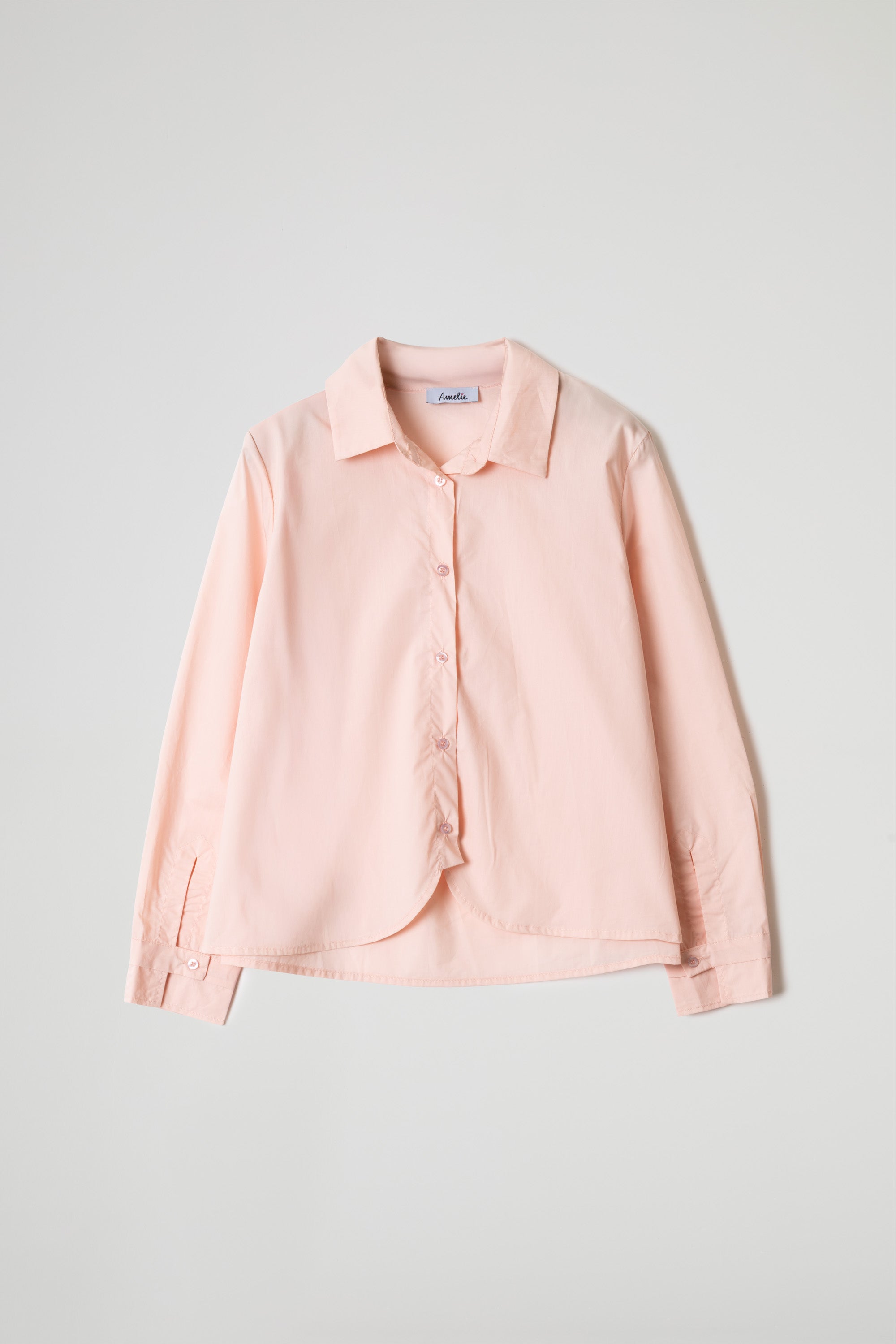 CAMICIA CORTA IN POPELINE COTONE, COLLETTO ALLA FRANCESE, CHIUSURA CON BOTTONCINI,ORLO A PETALO, MANICA LUNGA CON POLSO RIBATTUTO ALTO E DUE BOTTONCINI PER REGOLARE CHIUSURA, TAGLIO CARRE’ CON PIEGA SUL RETRO. LINEA BOXY