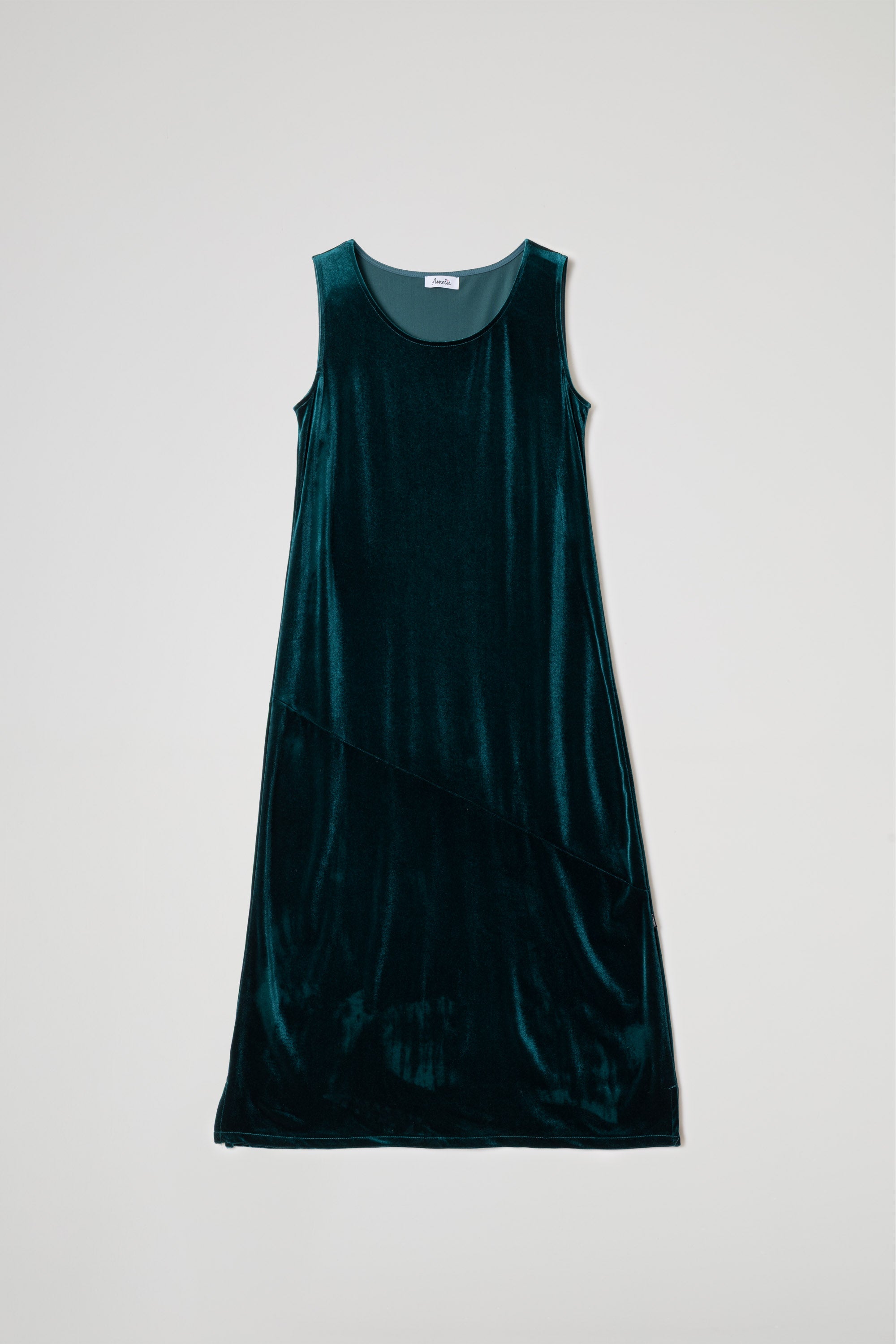 Long sleeveless dress in soft velvet, classic crew neck, slightly wide, decorative oblique cut that crosses the garment, straight fit, with a slight flare towards the hem, slits at the bottom.