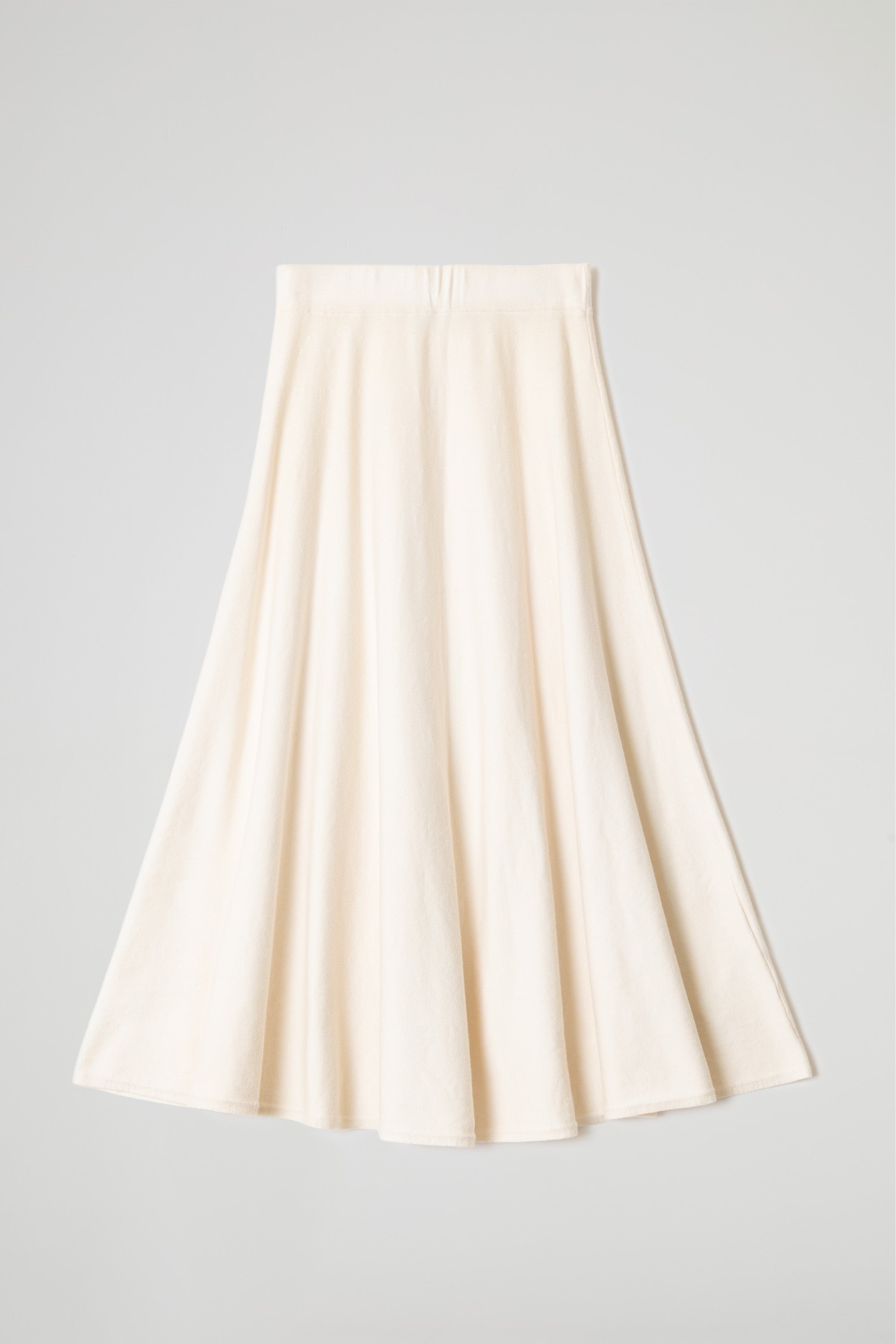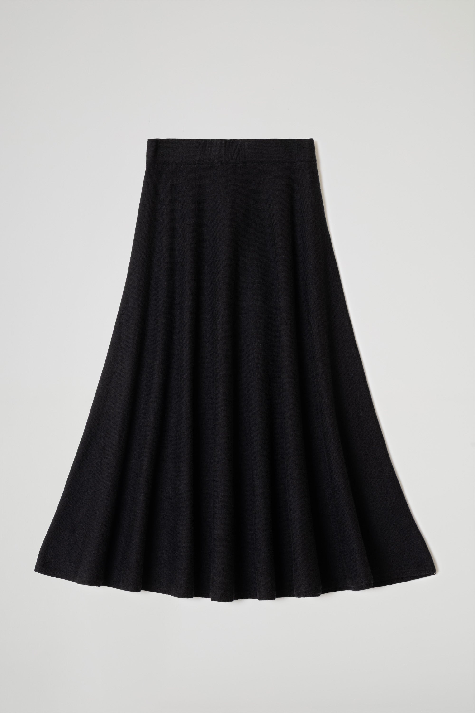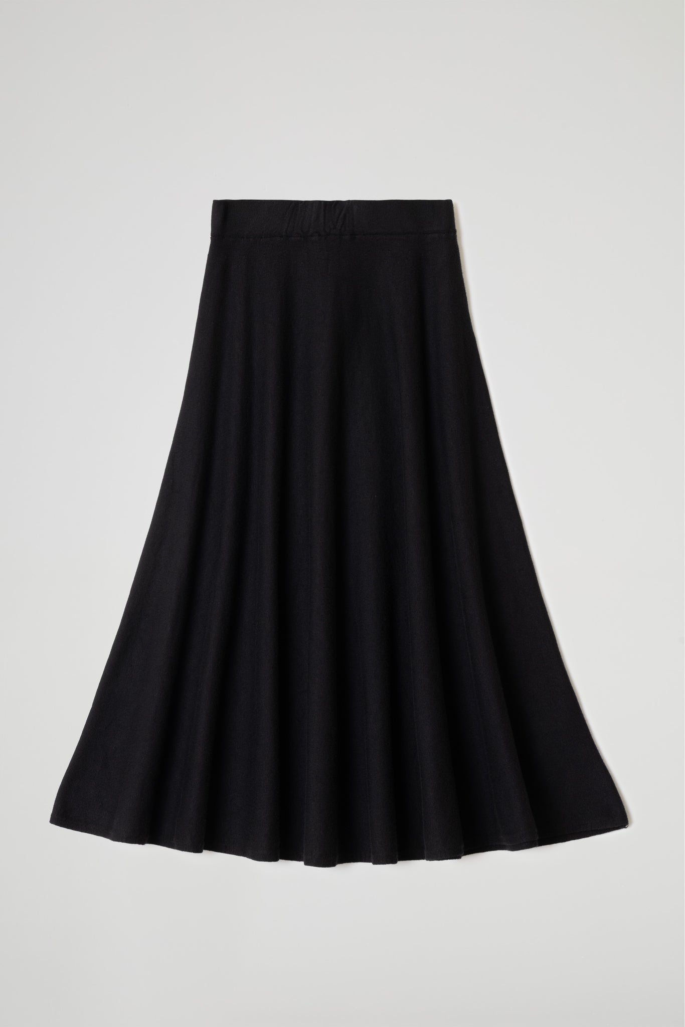 Midi skirt in soft, fine-woven viscose jersey, featuring a smooth, elasticated waistband and a flared, wide fit that gradually opens towards the hem, creating a soft, slightly wavy effect. Soft fit.