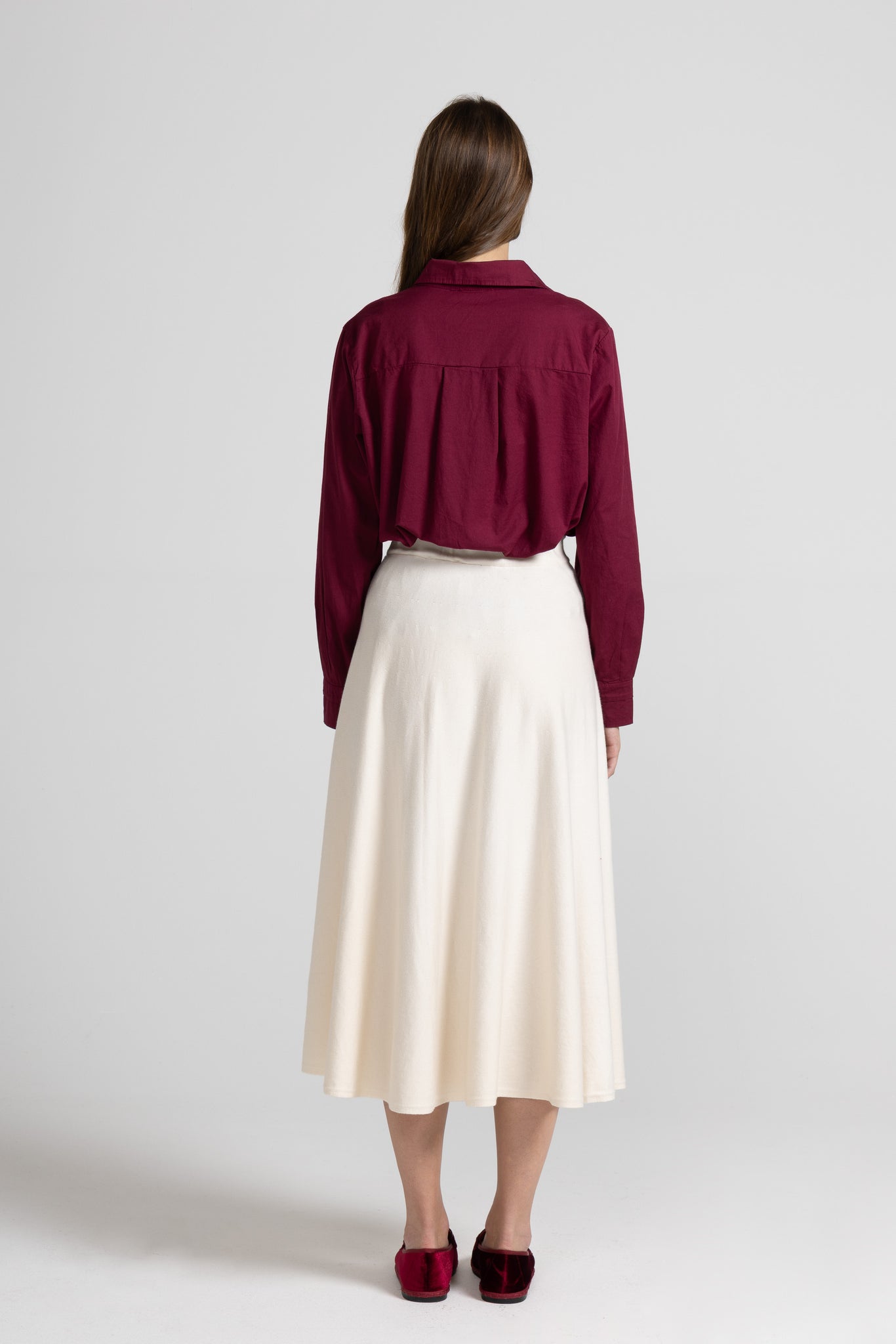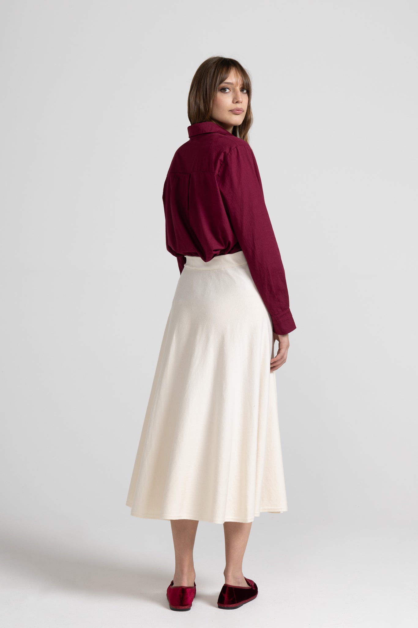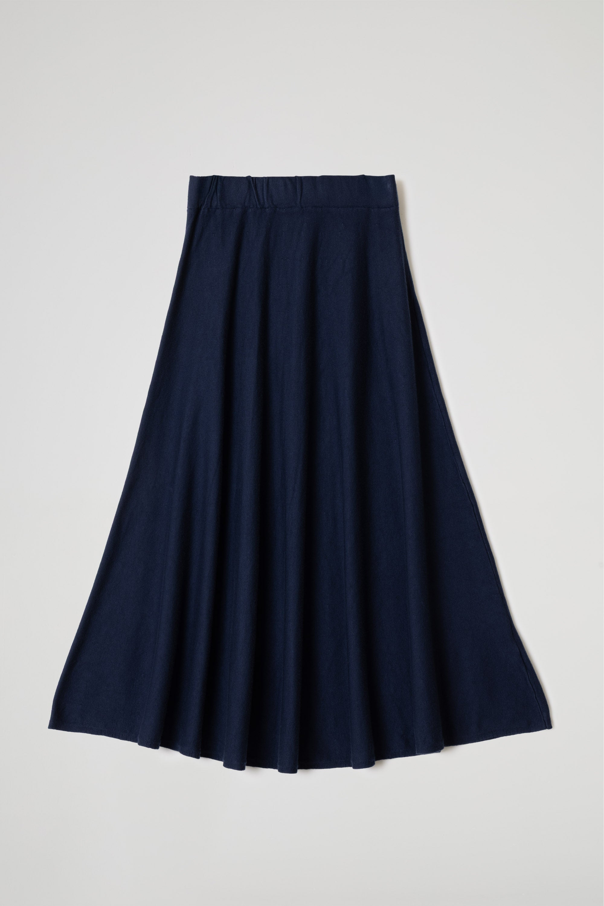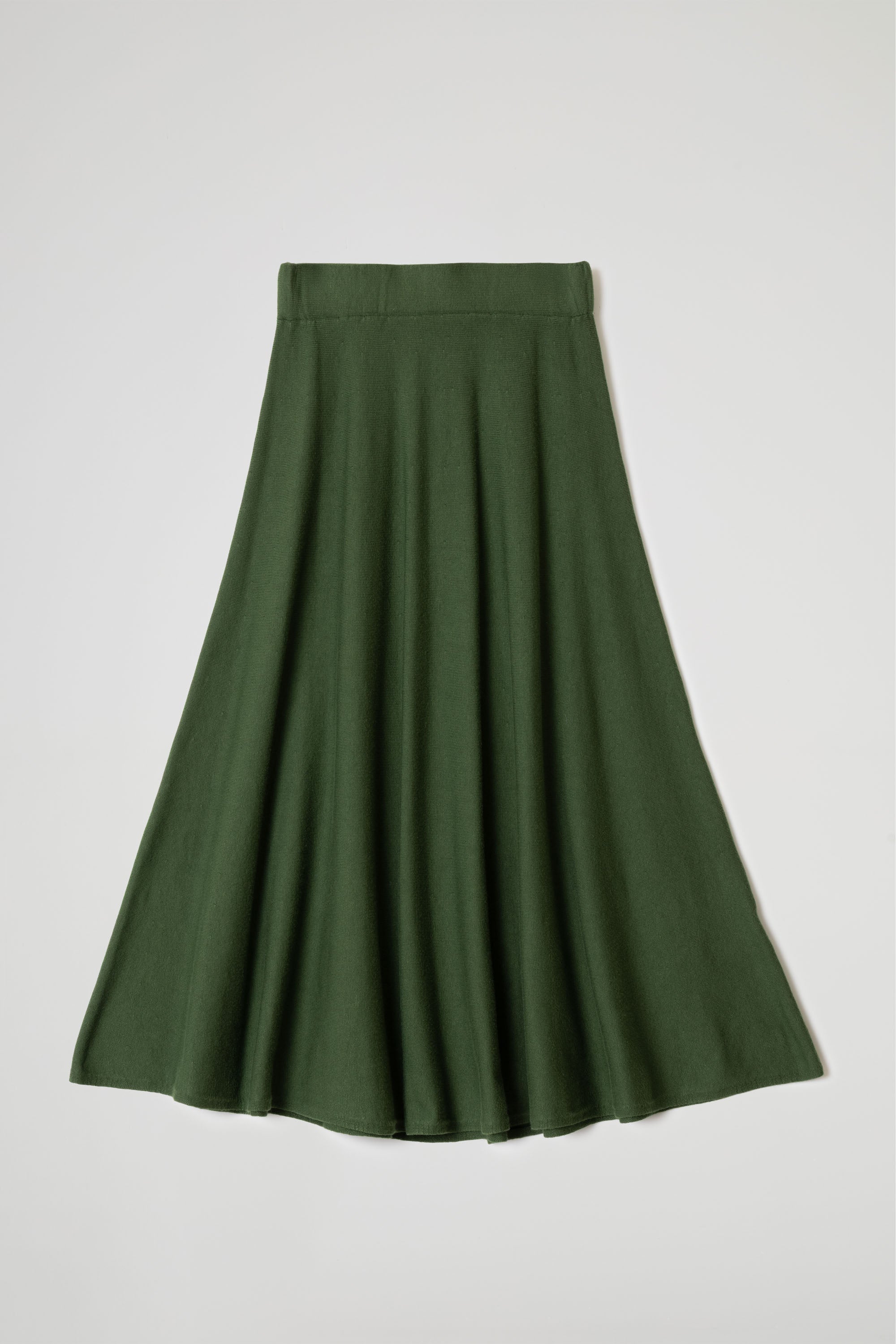 Midi skirt in soft, fine-woven viscose jersey, featuring a smooth, elasticated waistband and a flared, wide fit that gradually opens towards the hem, creating a soft, slightly wavy effect. Soft fit.