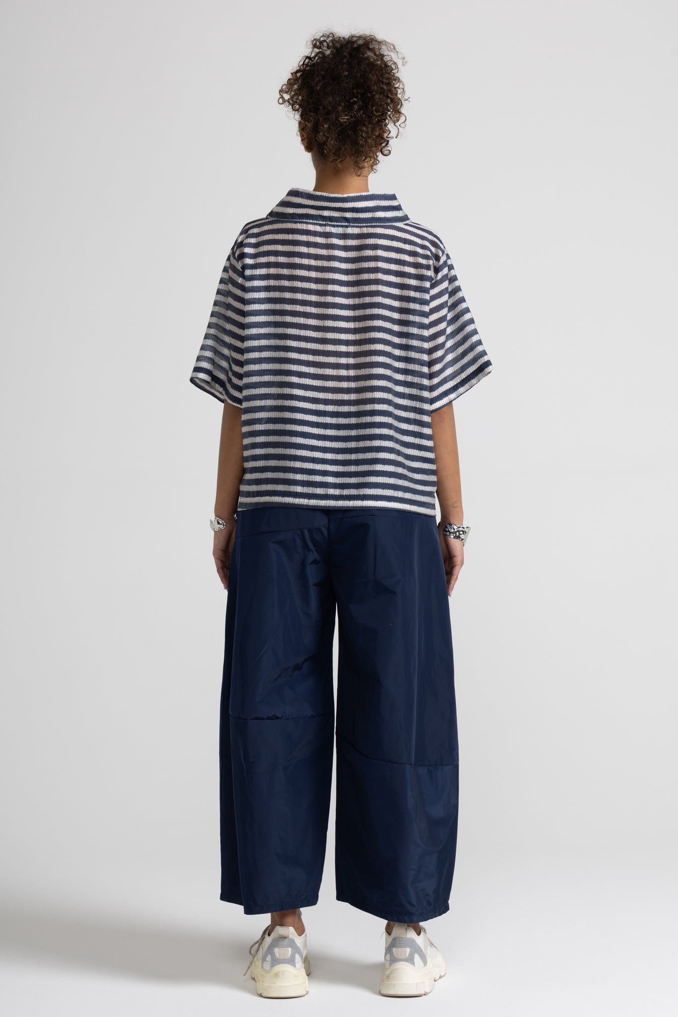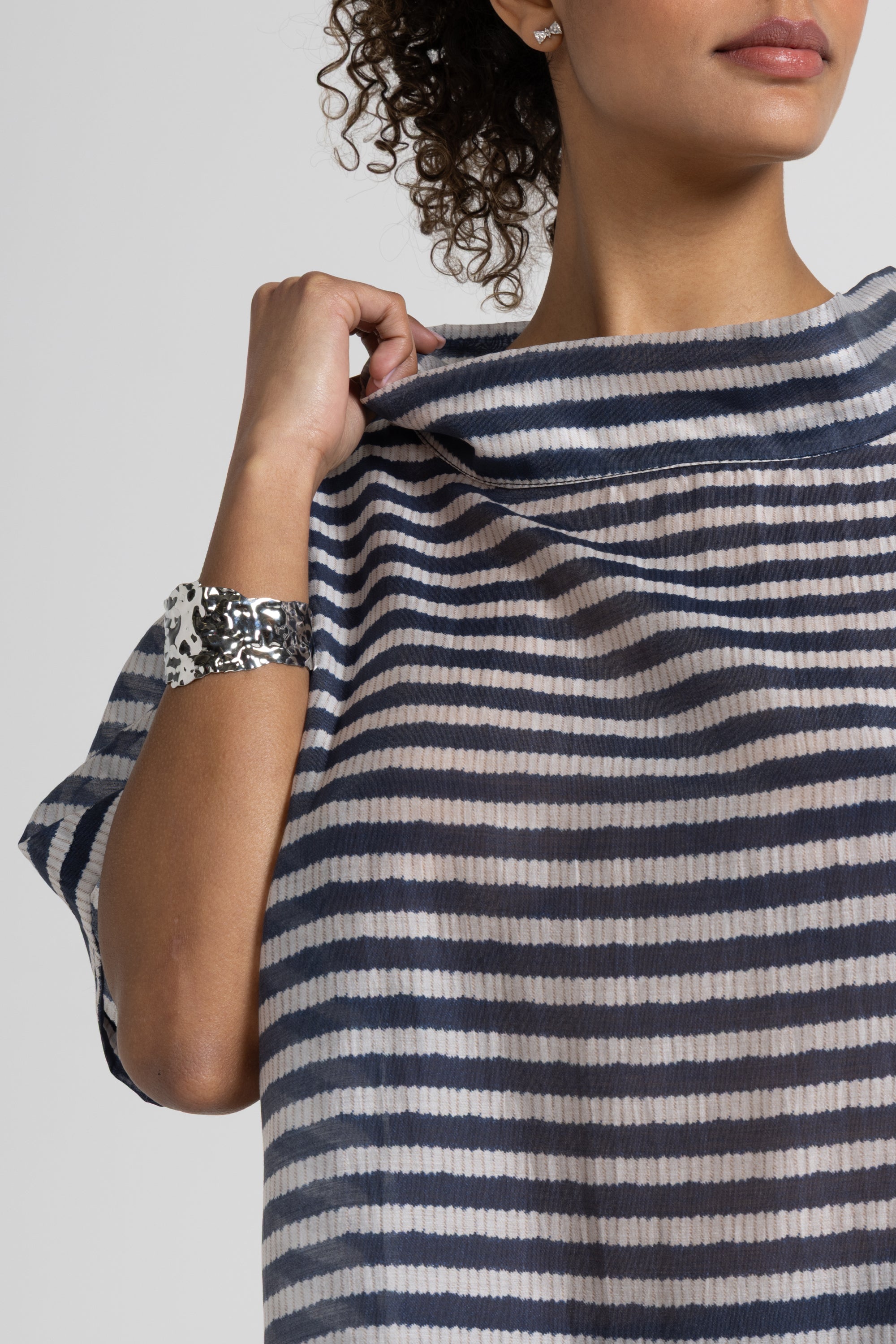 Striped top with a fresh and contemporary feel. Made from soft and comfortable fabric, it features short sleeves and a distinctive, slightly wide, soft collar that adds movement and character. The fit is comfortable and slightly boxy, with small side slits at the hem for greater freedom of movement. A casual and versatile piece, perfect for completing everyday looks with a touch of style.