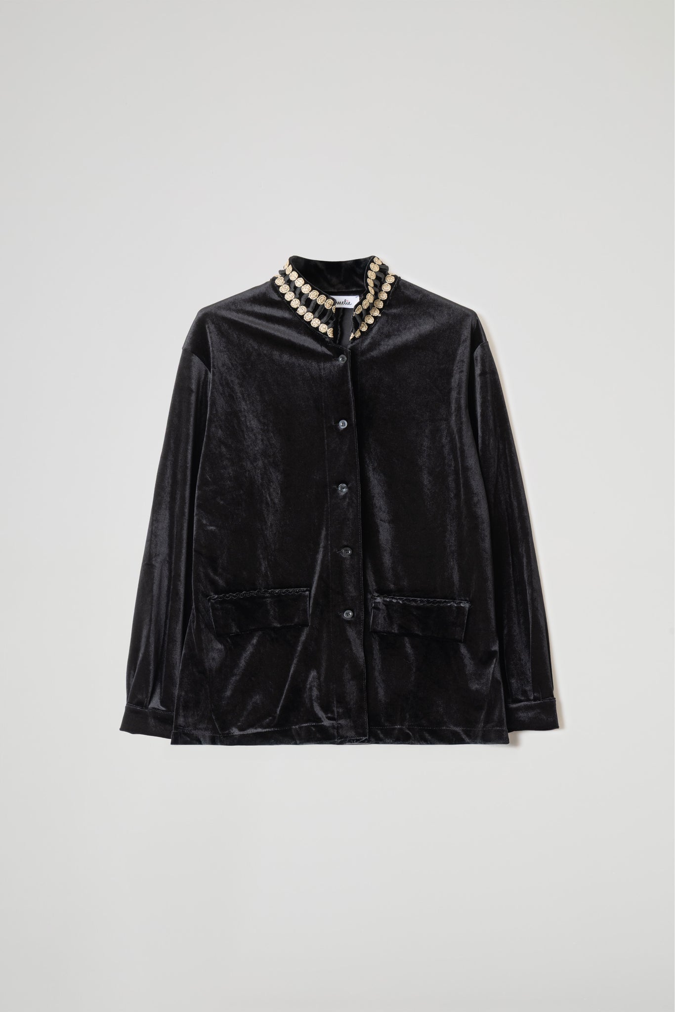 TOP IN TESSUTO DI VELLUTO ELASTICIZZATO, COLLO ALTO CON PASSAMANERIA, TASCHE A TOPPA CON PASSAMANERIA SU PATTINA, LINEA AD A, SPACCHETTI LATERALI 6CM, MANICA LUNGA CON POLSO RIBATTUTO ALTO, CHIUSURA CON BOTTONCINI.