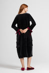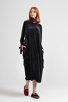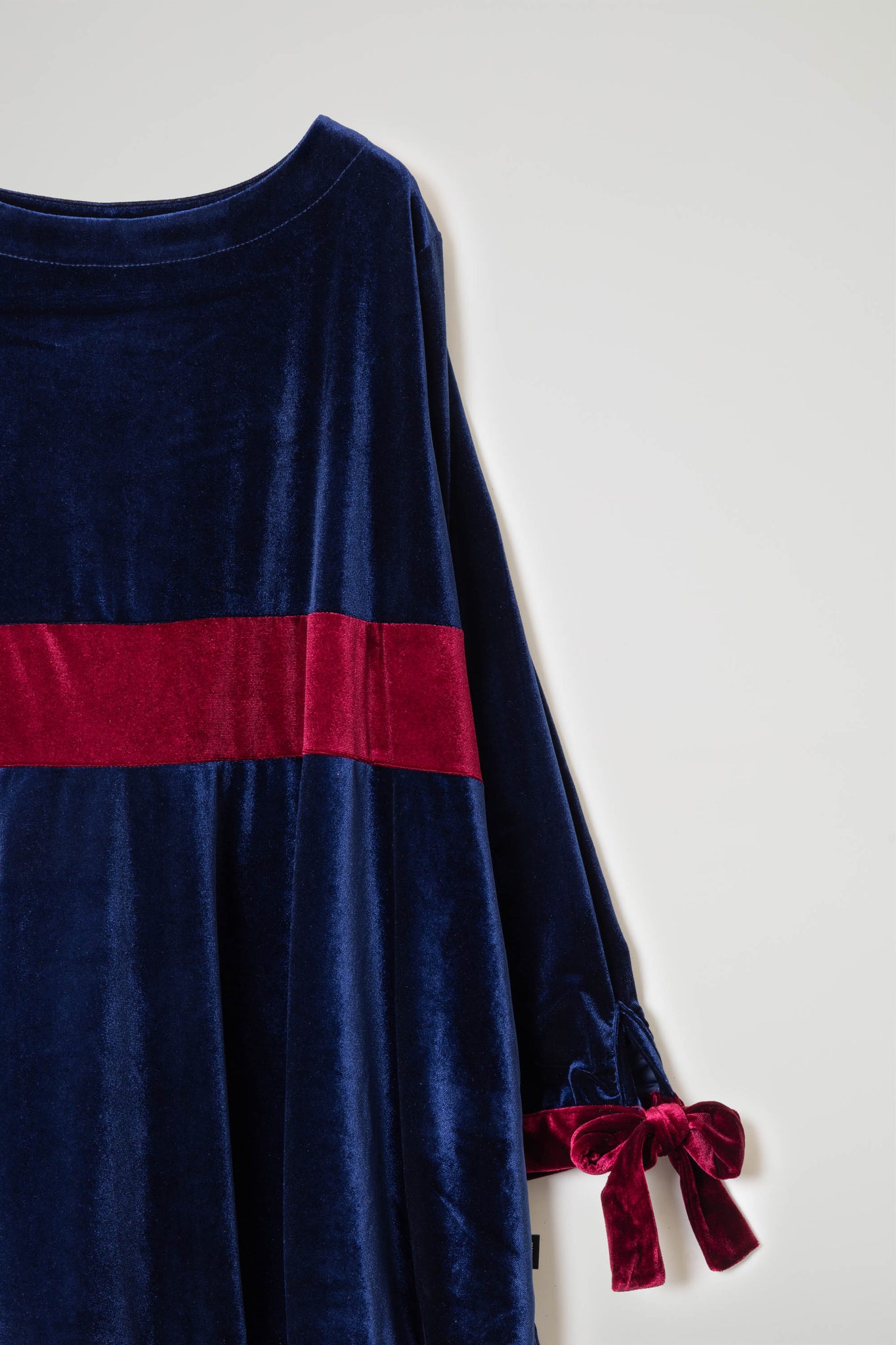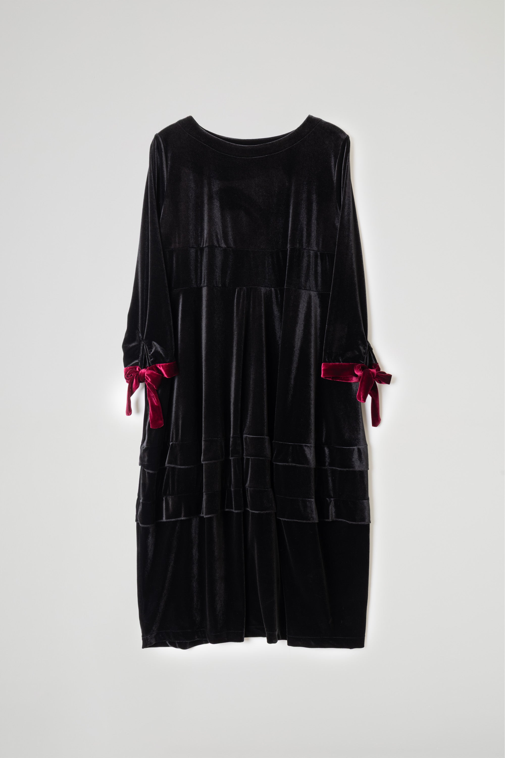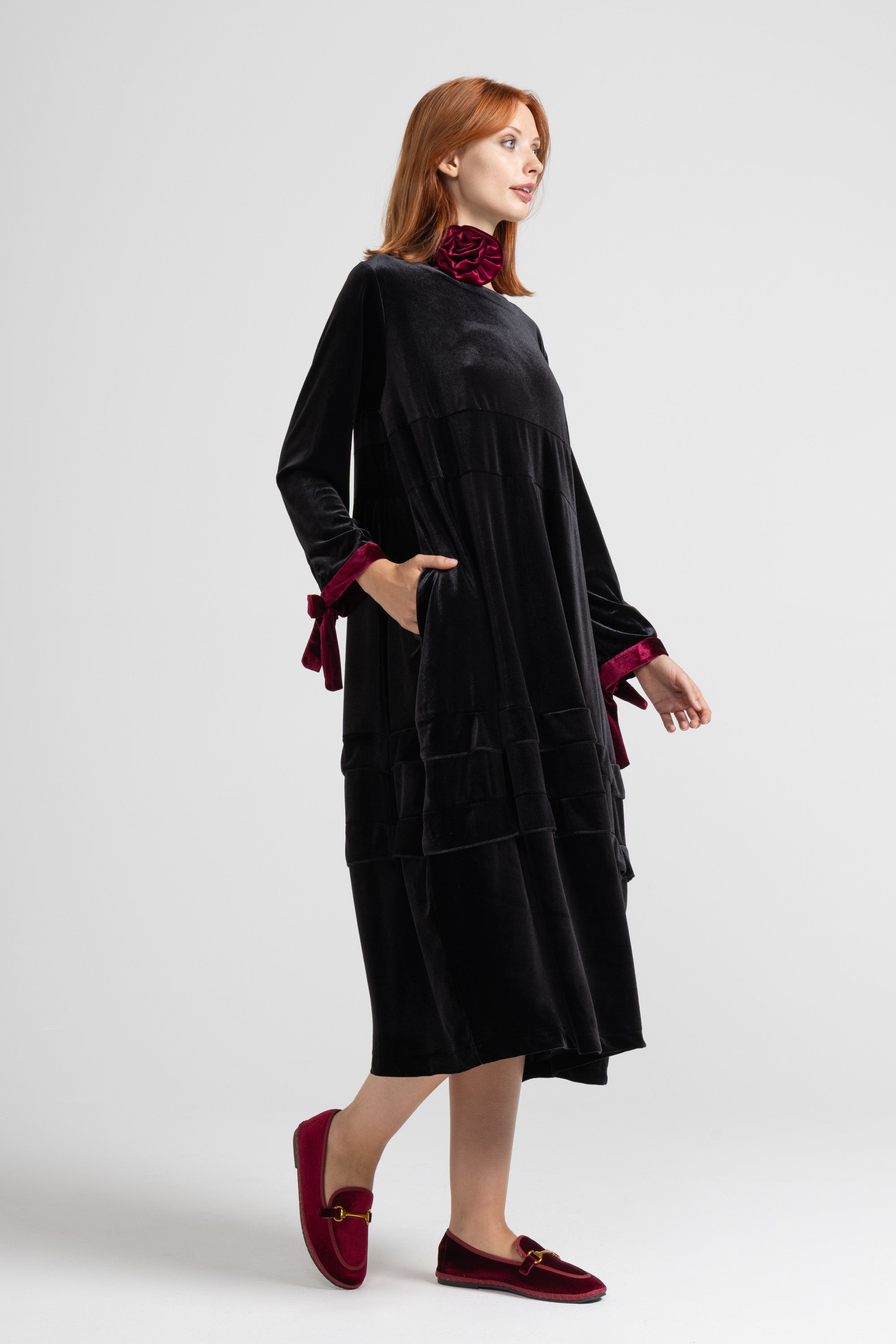 LONG EGG-SHAPED DRESS IN STRETCH VELVET FABRIC, LONG SLEEVES WITH ADJUSTABLE BOW CUFFS, RUFFLE DETAIL, WIDE HIGH FOLDED BOAT NECK.