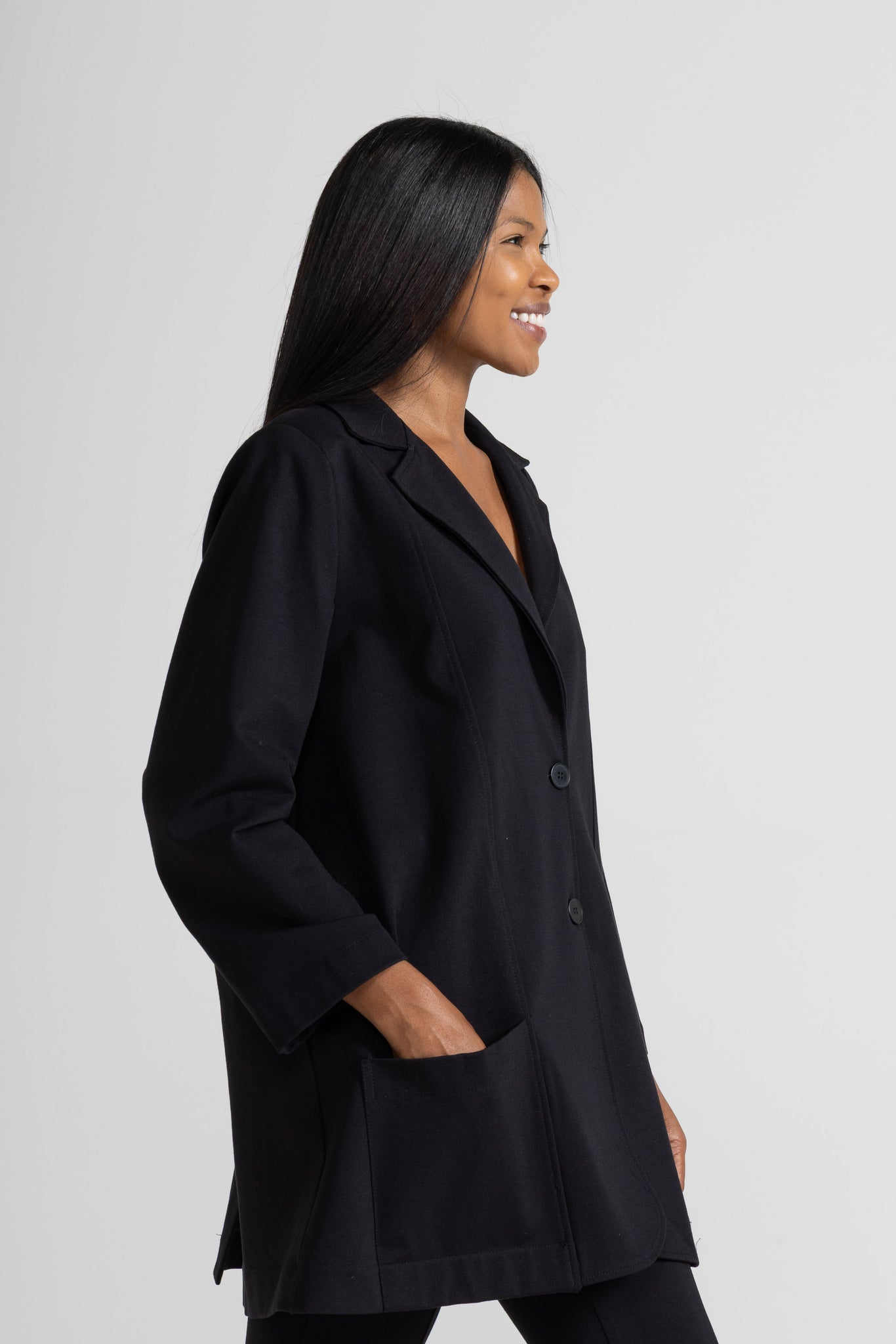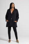 OVERSIZED BLAZER IN STRETCH VISCOSE MILANO STITCH FABRIC, LONG SLEEVES, FRONT STITCHING, REVERSE COLLAR, MAXI PATCH POCKETS, BACK SPLIT, BUTTON CLOSURE. OVERSIZED LINE