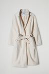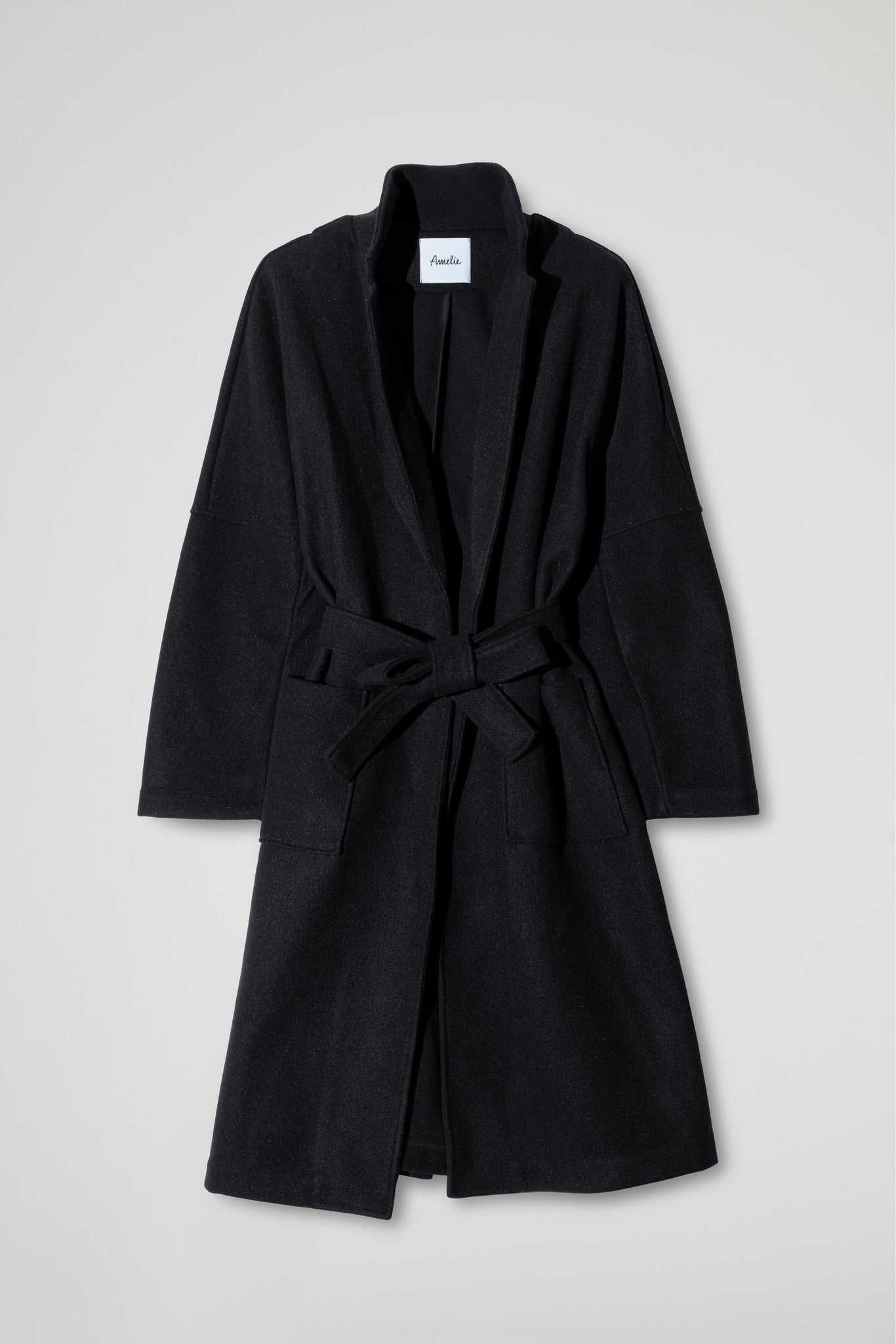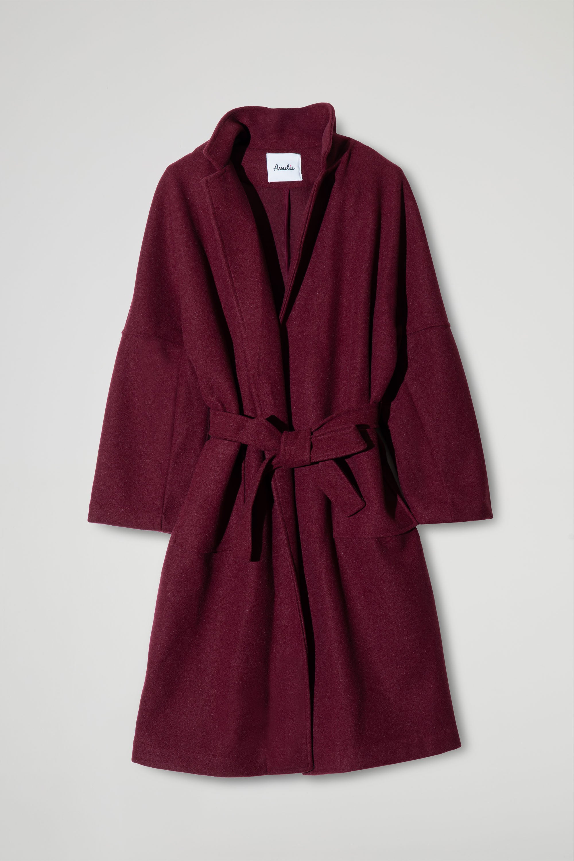 High crew neck, long sleeves with a slightly dropped cut, belted waist, large buttonholes at the sides, two large and practical front patch pockets, and a central vertical seam at the back. Comfortable fit.