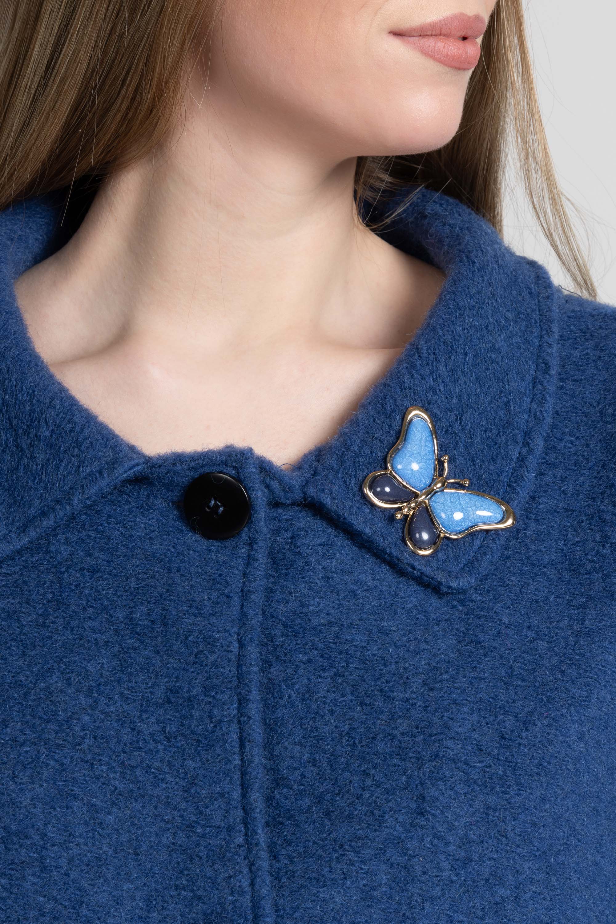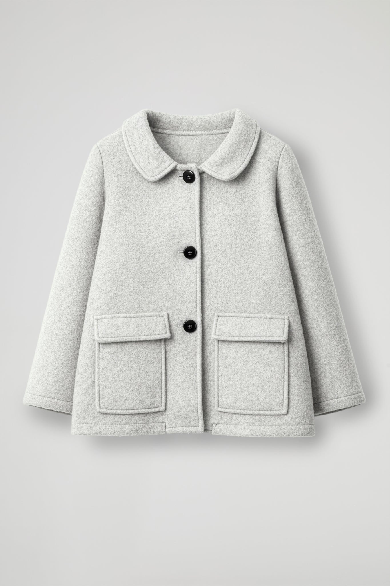 Short jacket, classic rounded collar, slightly dropped shoulders, long sleeves, front closure with three contrasting buttons, large patch pockets with flaps on the front. Relaxed fit.