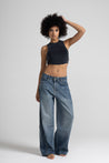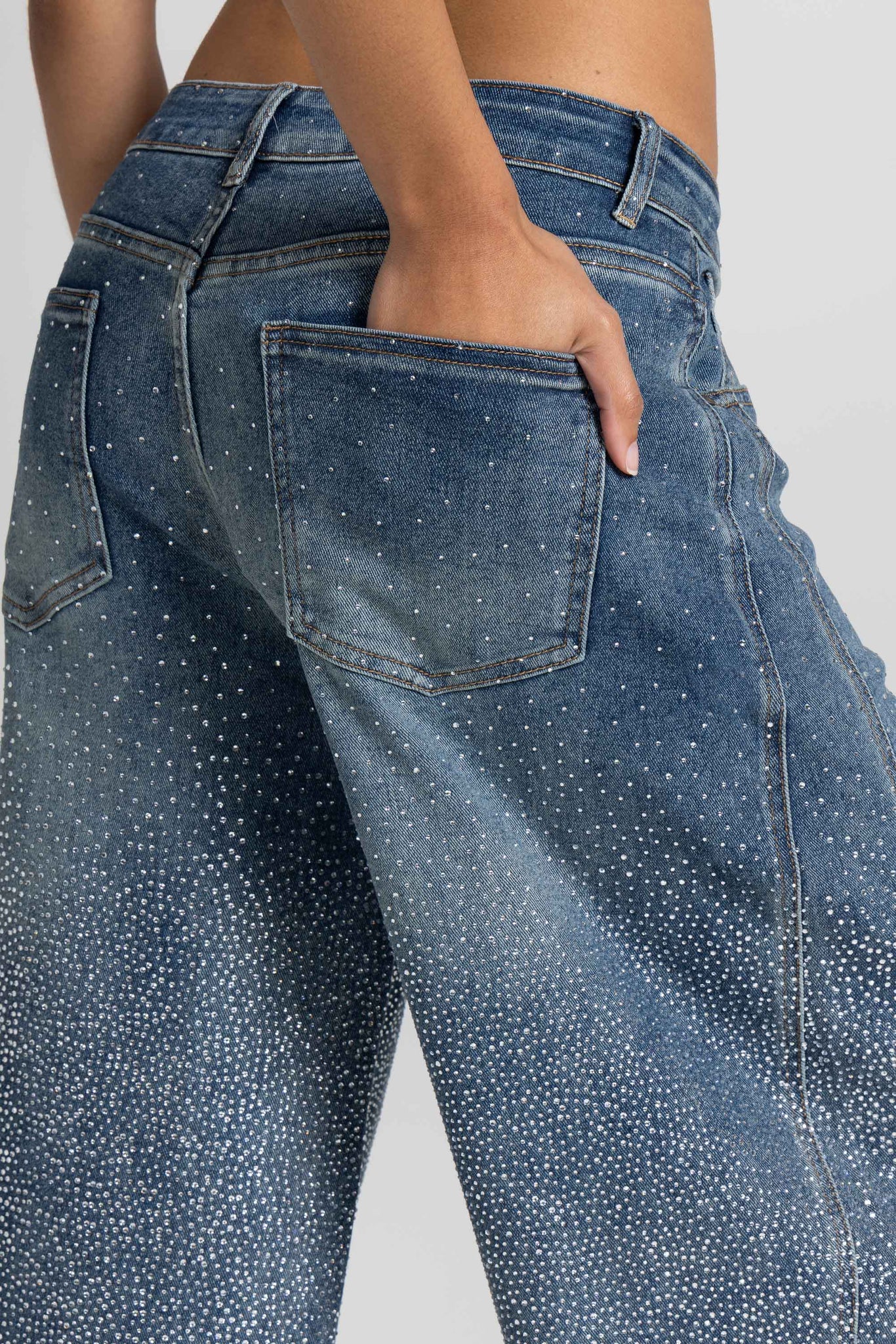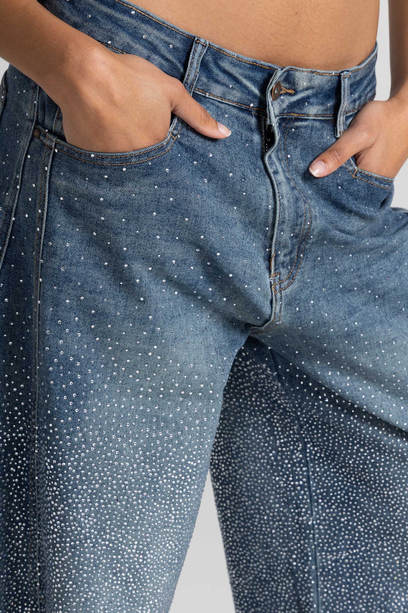 Blue denim, with a soft texture and a faded wash, embellished with a shower of sparkling micro rhinestones that catch the light with every step, making them an iconic and irresistible piece. A versatile piece, perfect for casual chic or elegant evening looks.