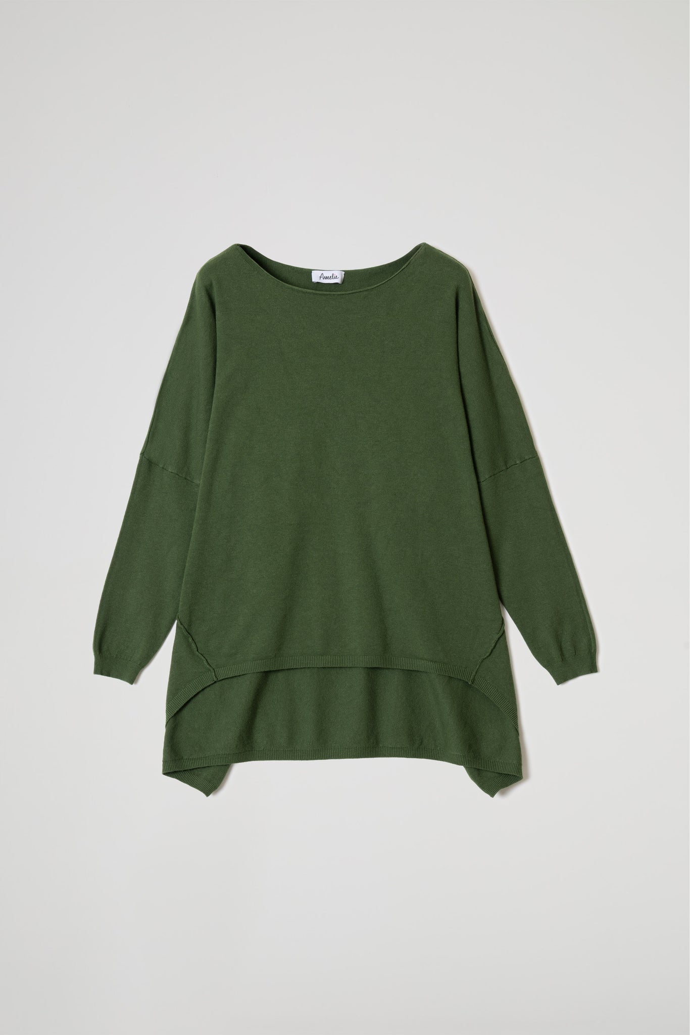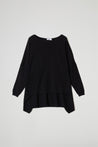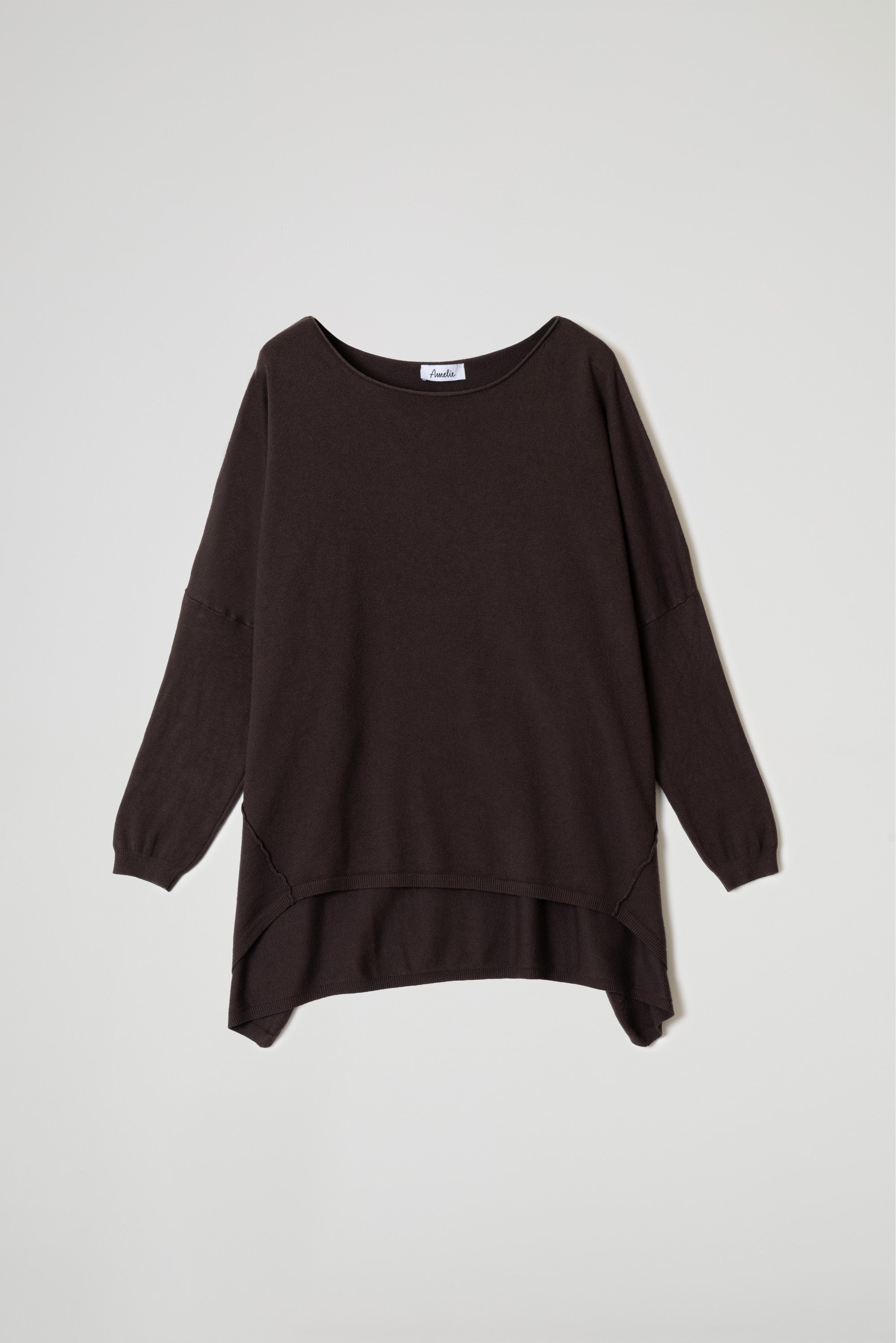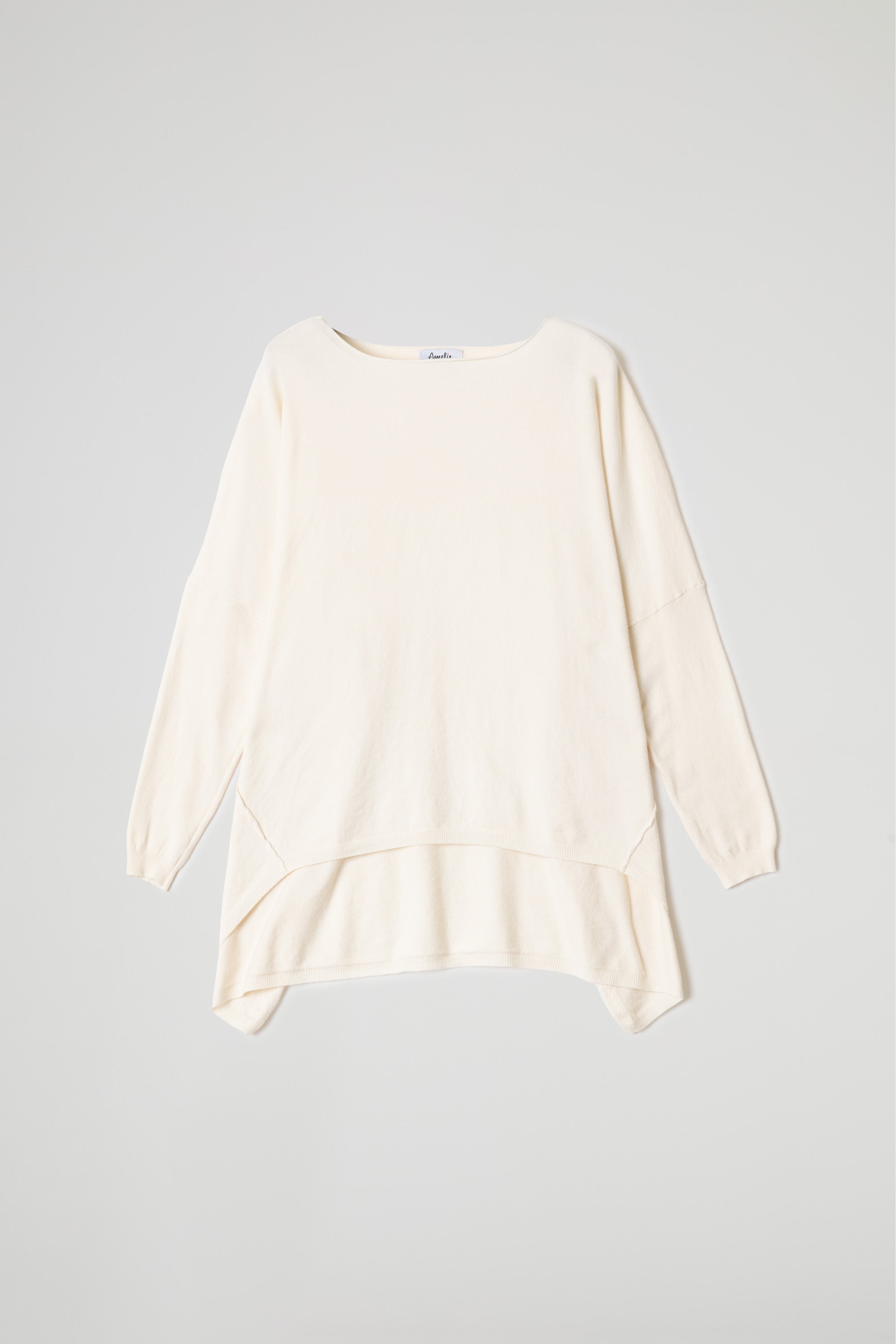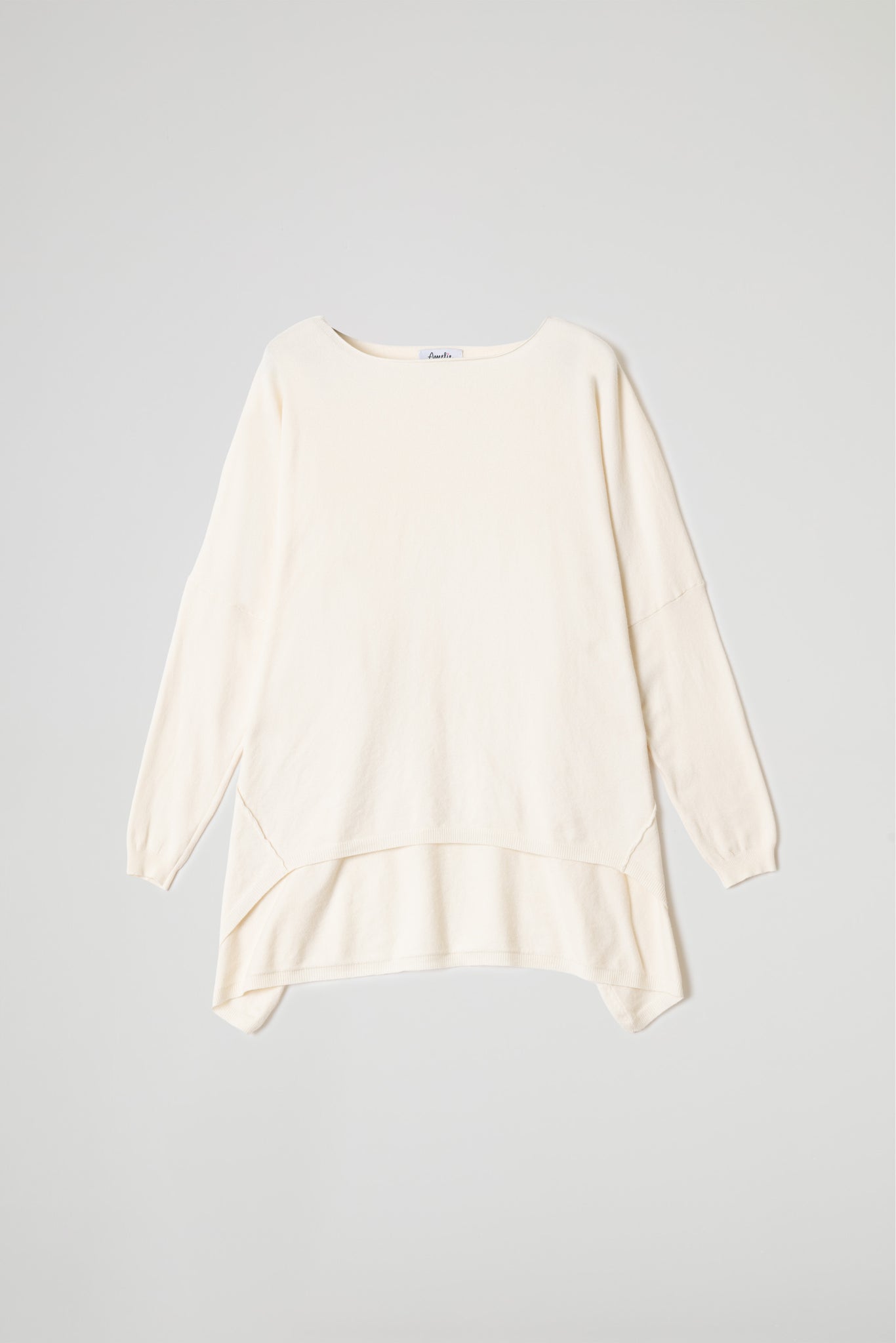 Maglia over in morbida maglina di viscosa, scollo ampio con taglio vivo sul collo ampio e tondo, spalle scese ,maniche lunghe, dettaglio cuciture decorative oblique e fondo asimmetrico che dona movimento e originalità al look. Linea ampia e morbida .