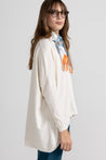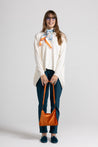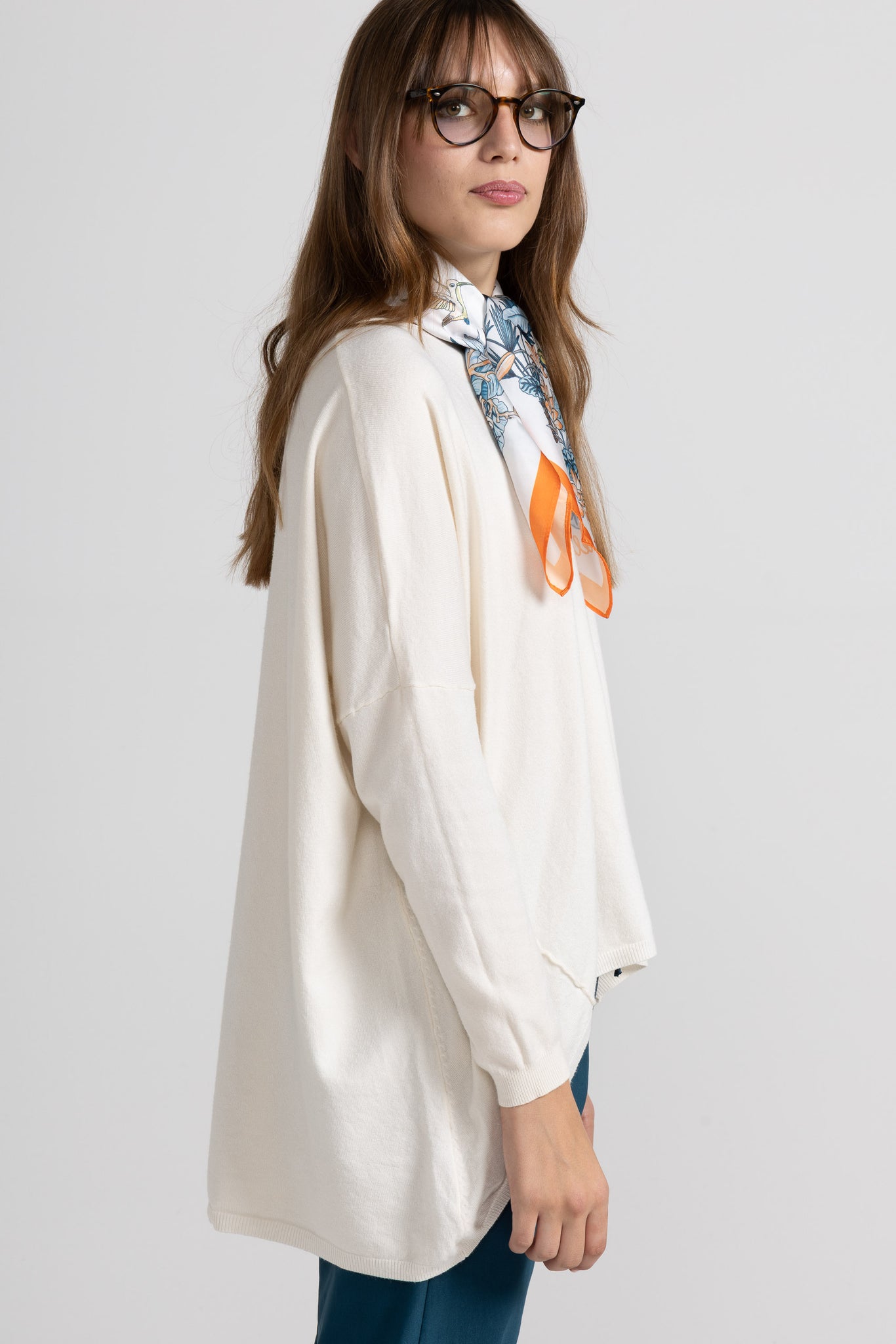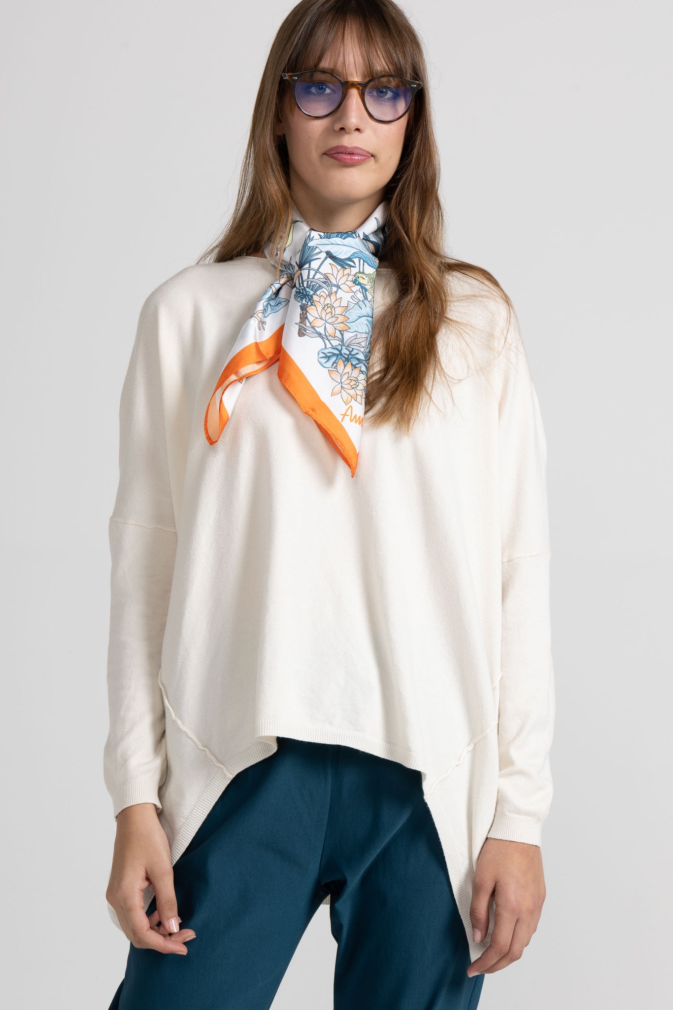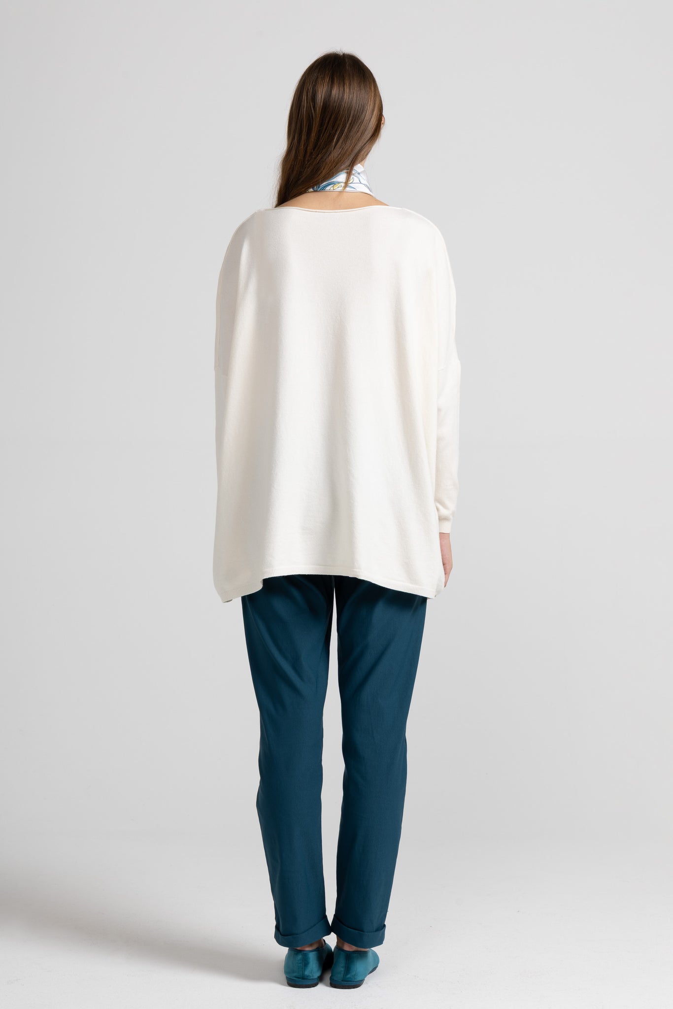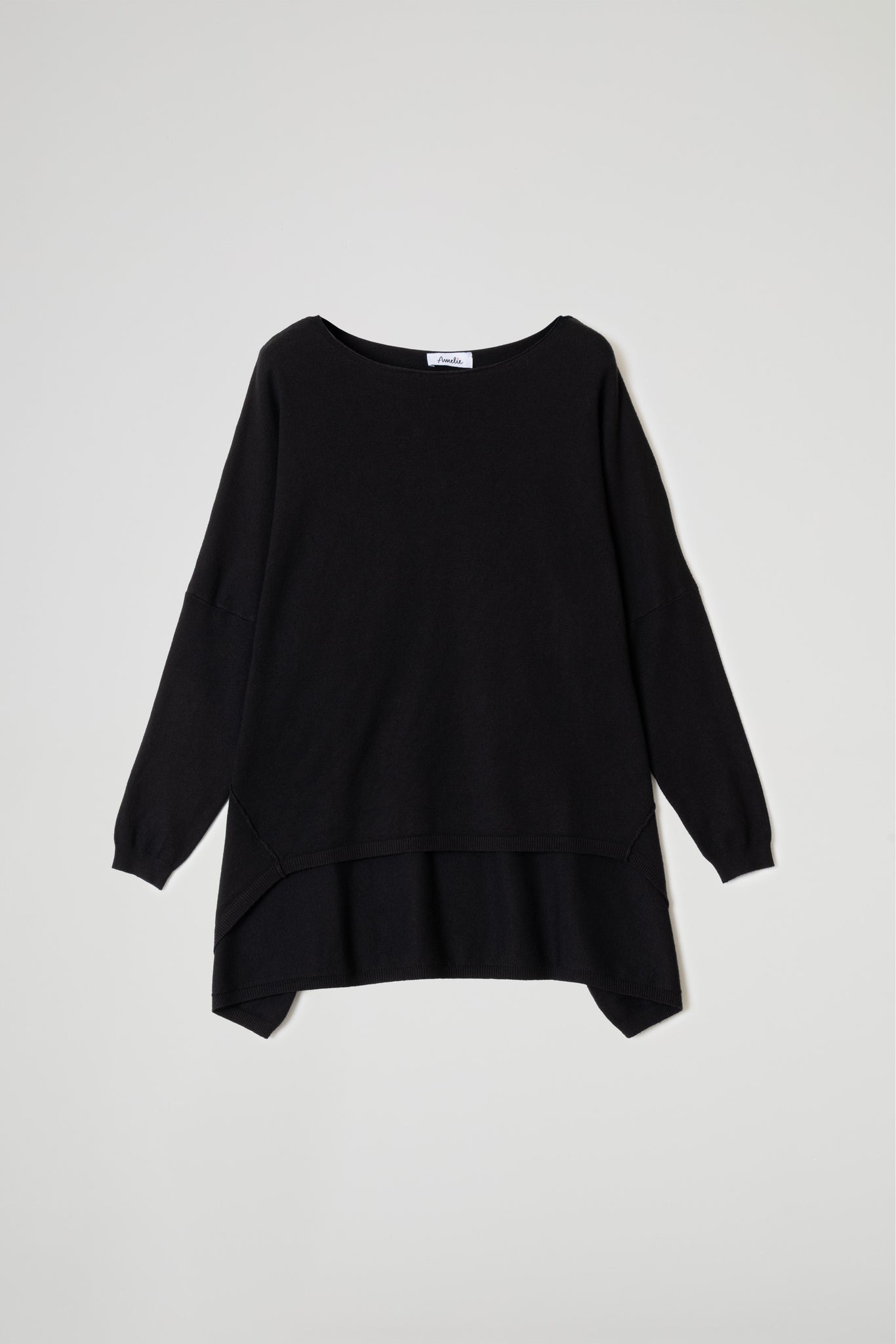 Maglia over in morbida maglina di viscosa, scollo ampio con taglio vivo sul collo ampio e tondo, spalle scese ,maniche lunghe, dettaglio cuciture decorative oblique e fondo asimmetrico che dona movimento e originalità al look. Linea ampia e morbida .